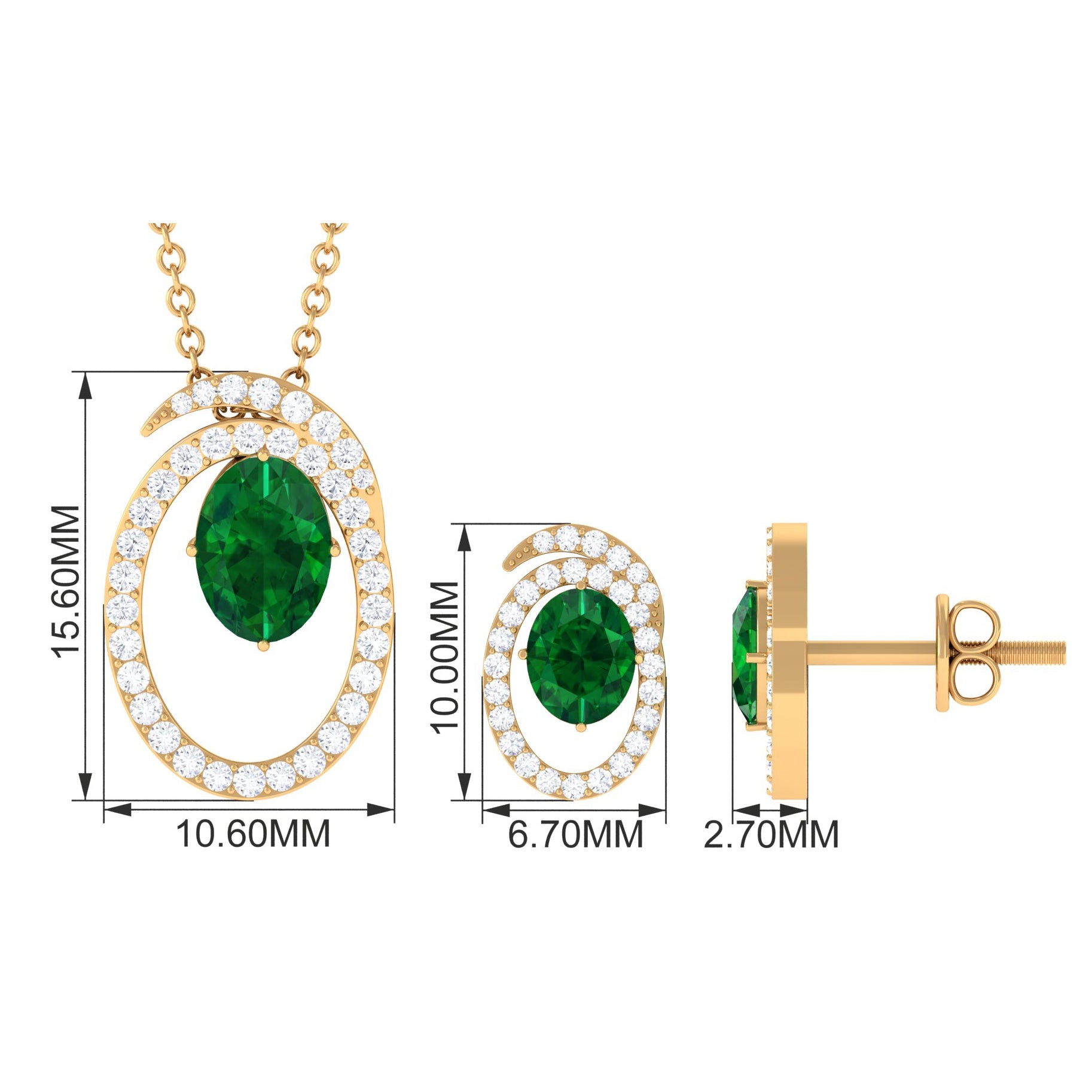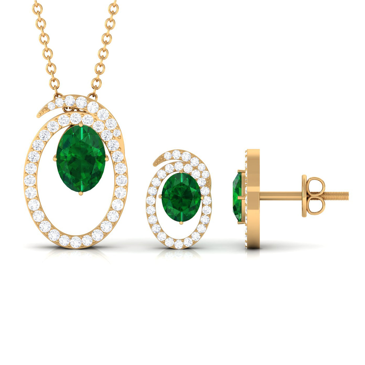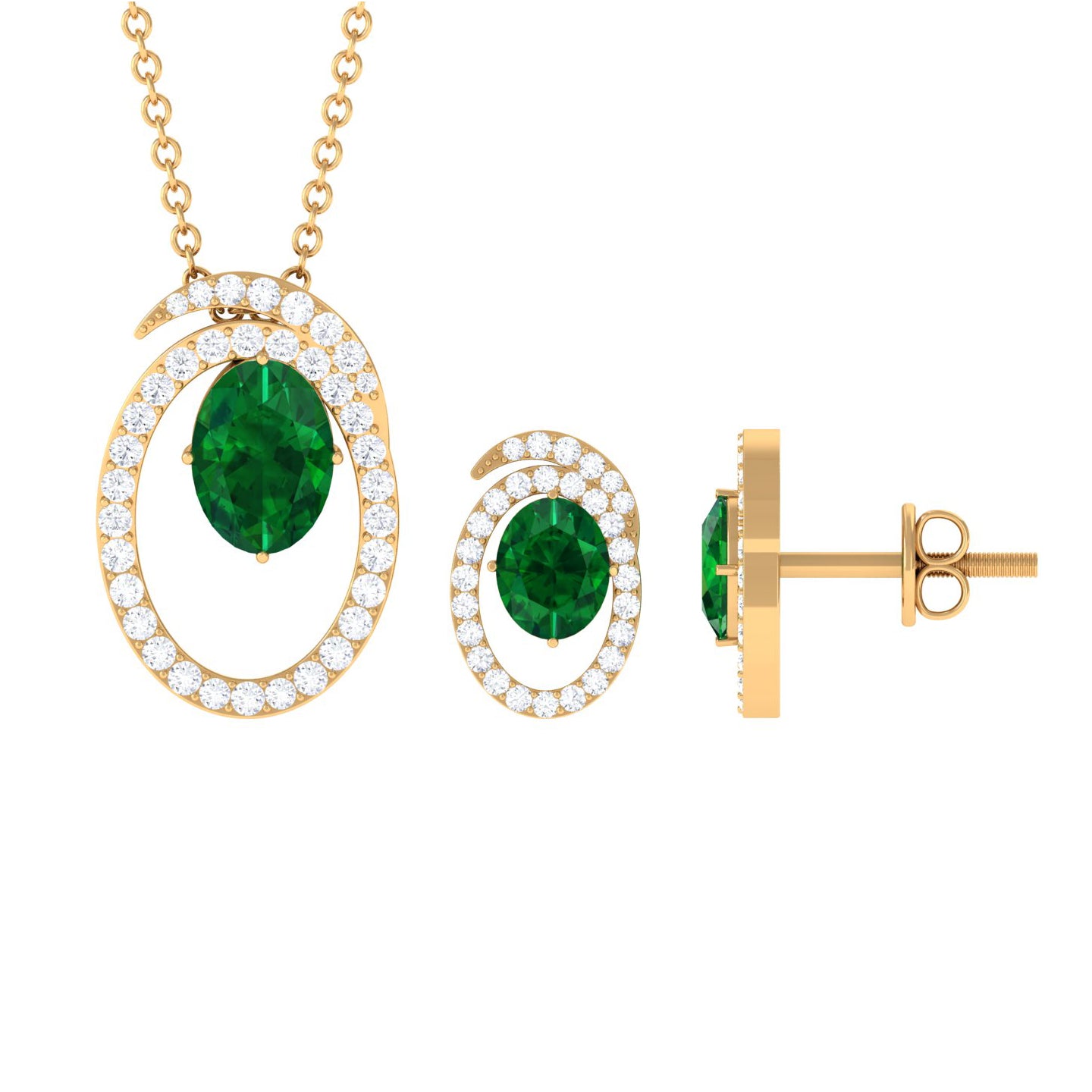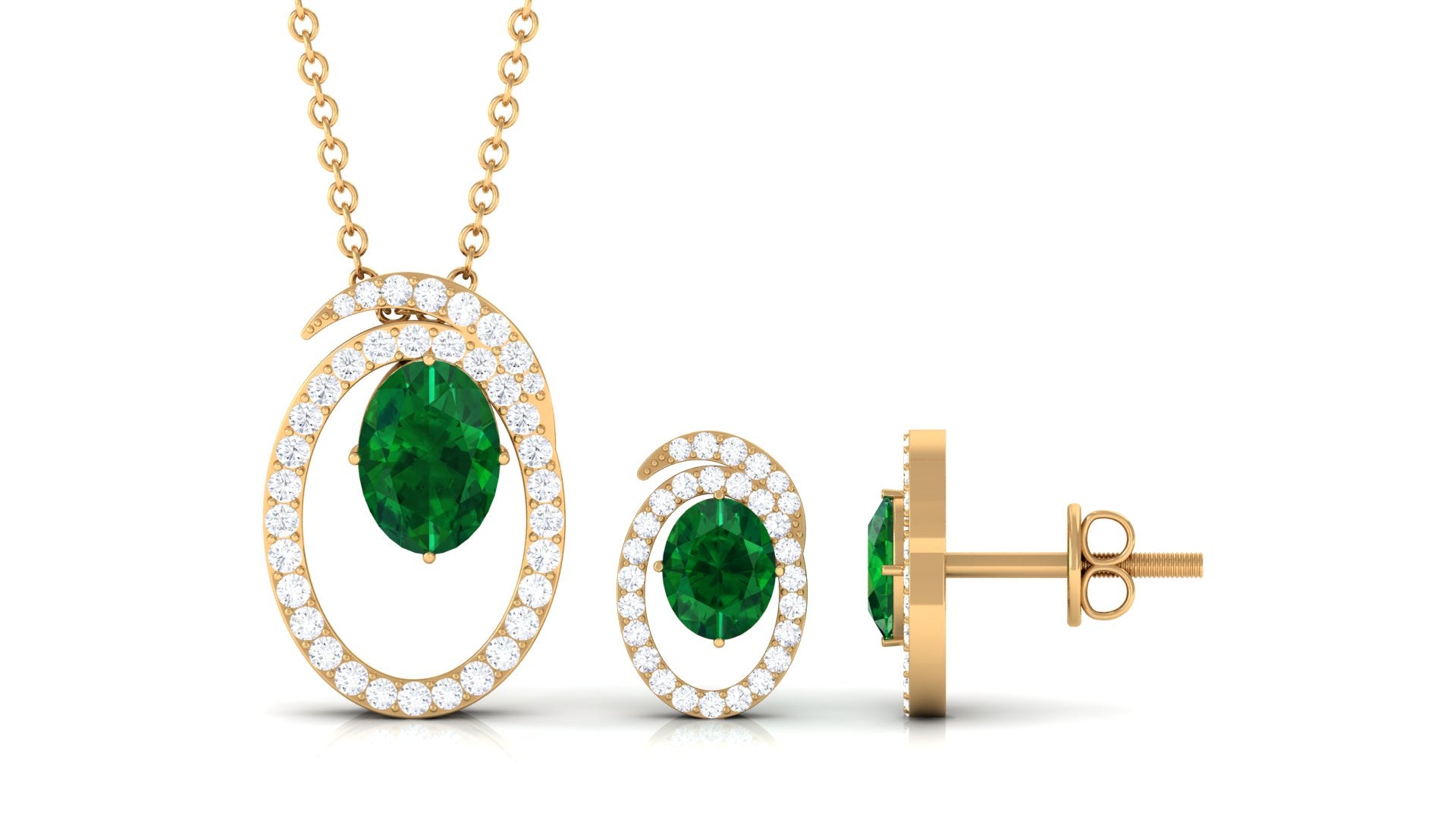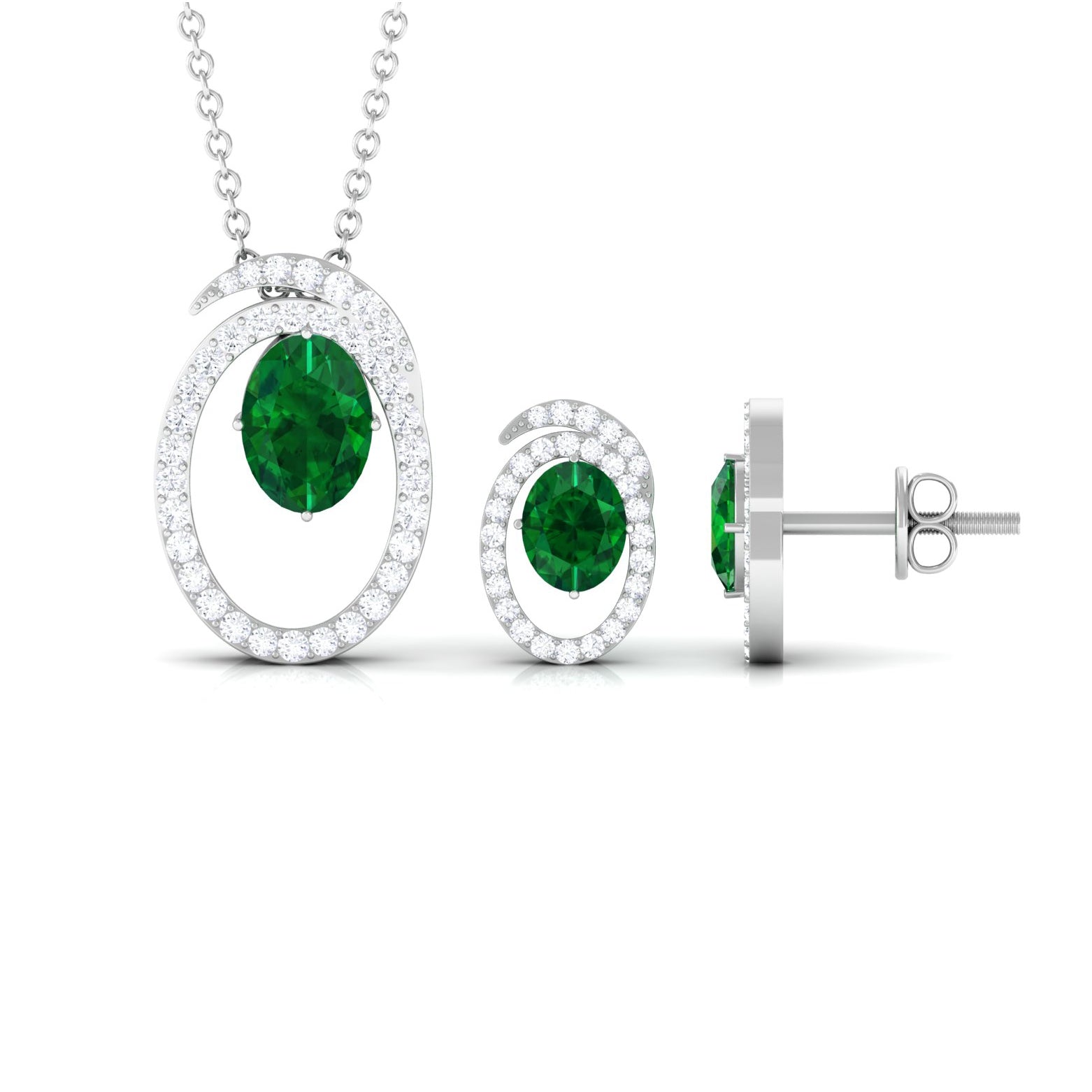 Looking for an everyday essential that glams up any look without much effort. Presenting a contemporary jewelry set with a dangling necklace pendant and a stud earring pair that is difficult not to fall for. A lush green created emerald comes together with a circular-swirl frame and round moissanite to form this exquisite wedding set. If you intend to create a maximum sparkle without putting on a showy display, this jewelry set is exactly what you seek. The necklace pendant is beautifully paired with a cable chain, while the pair of earrings is linked to screw back posts at the back. Makes a versatile addition to your treasure trove.