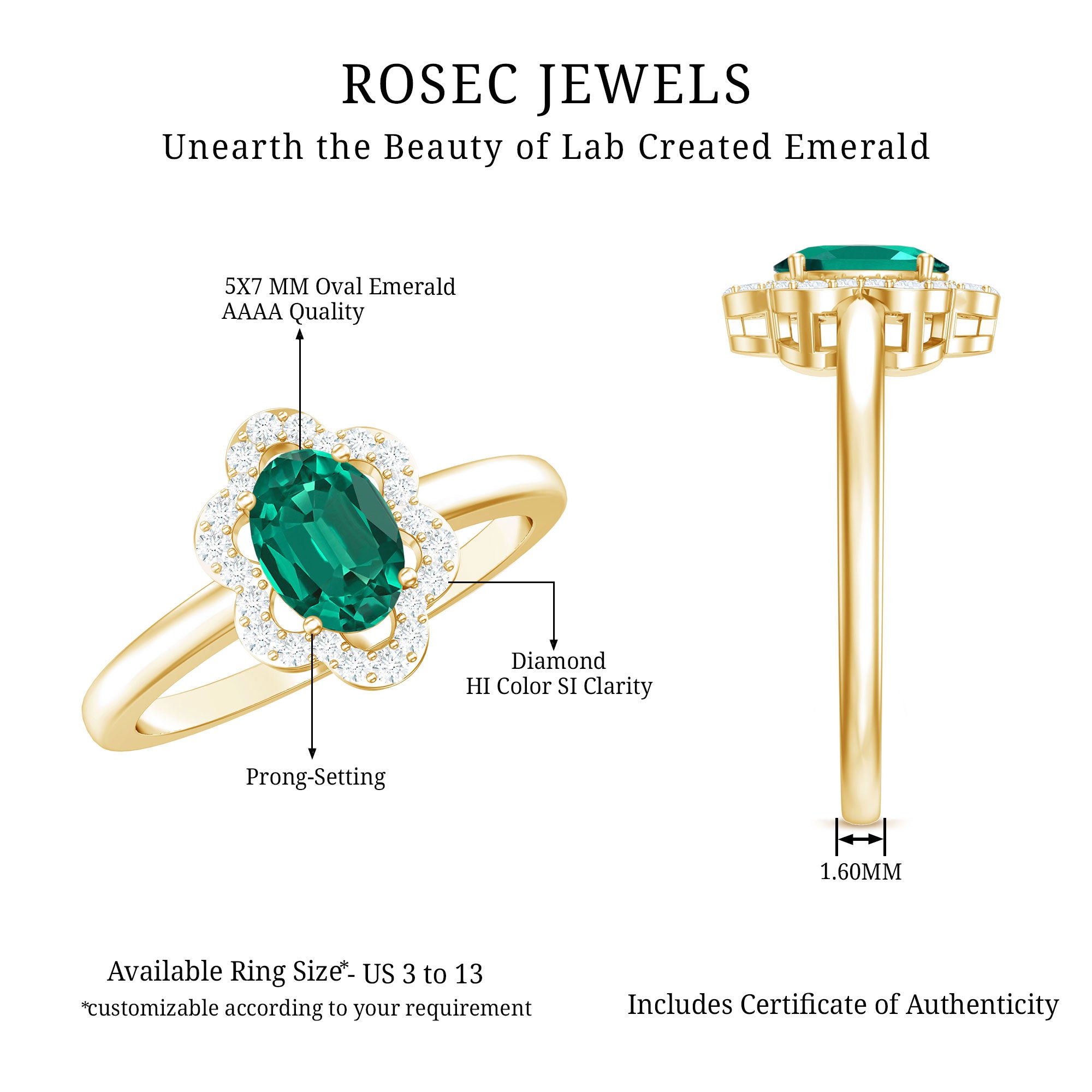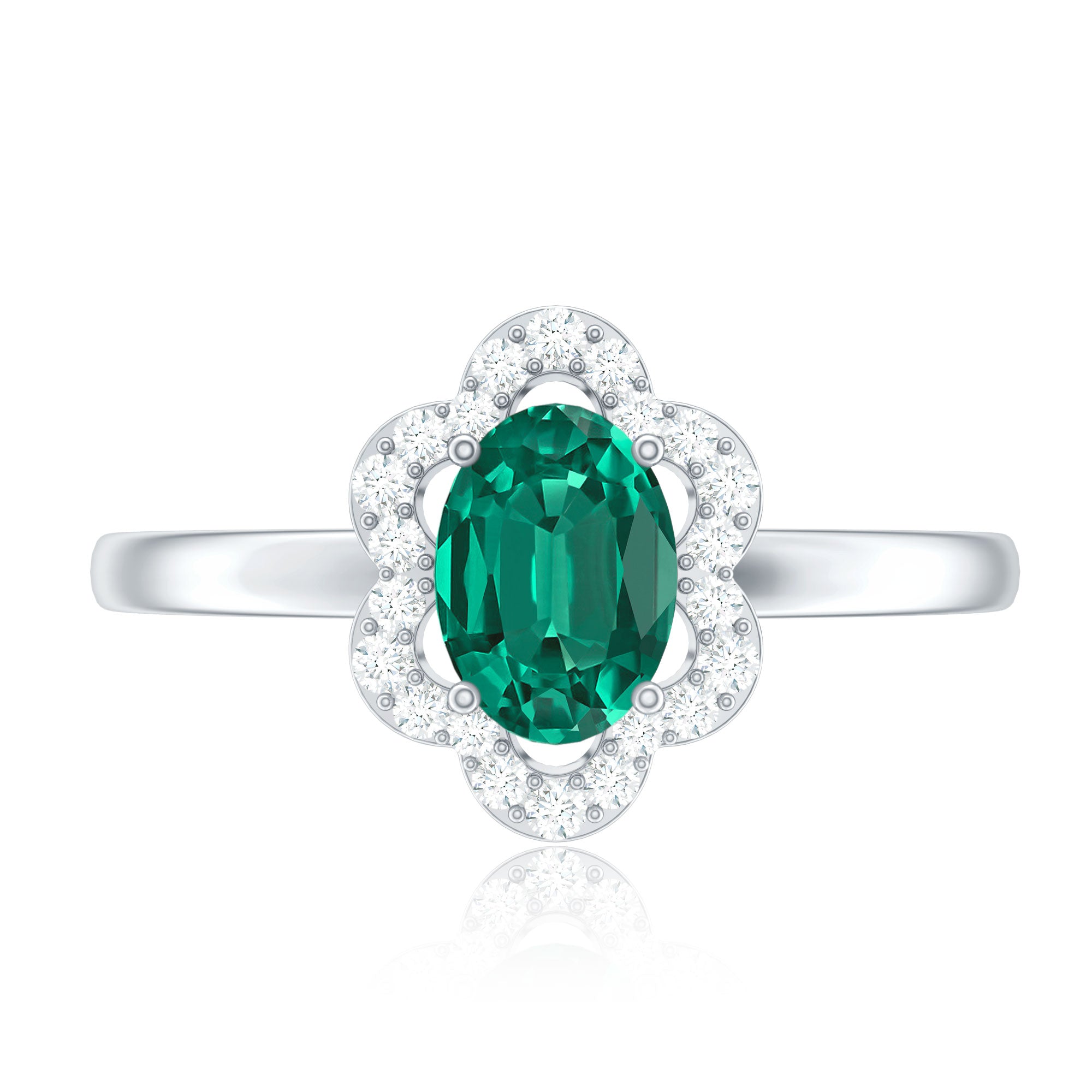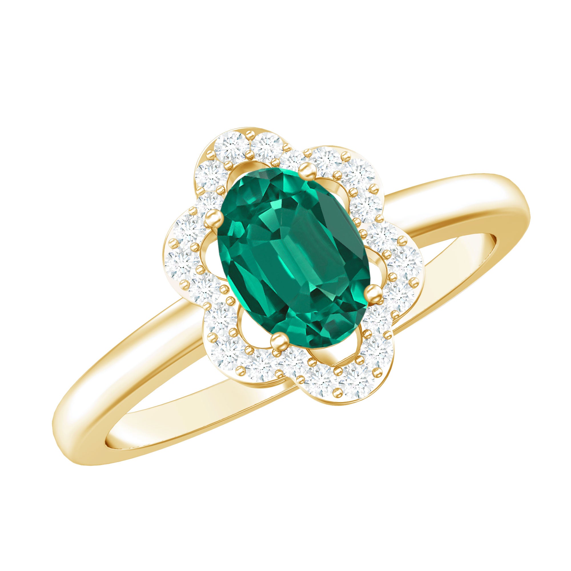 Celebrate love with elegance and the timeless sparkle of nature with this Lab Grown Emerald Engagement Ring, a breathtaking expression of romance, sophistication and sustainable beauty. At its heart lies a vibrant 5X7 mm Oval Shape Lab Created Emerald set in Prong Setting, chosen for its deep green hue. The rich green color of the AAAA Quality Lab Emerald symbolizes growth, harmony and renewal, perfectly reflecting the blossoming love between two souls. Surrounding the Lab Emerald is a stunning Diamond Floral Halo, where sparkling Diamond stones are meticulously arranged in a floral pattern. This delicate halo enhances the brilliance of the center stone, adding a touch of vintage charm while making the entire ring sparkle with unmatched radiance. The flower design represents beauty, blossoming love and eternal commitment, that gives this Cocktail Engagement Ring a unique and meaningful character. Designed for those who appreciate timeless elegance with a thoughtful twist, this Flower Engagement Ring blends classic design with modern sustainability. Available in a variety of US standard ring sizes and presented in an elegant jewelry box, this Lab Emerald Diamond Engagement Ring is perfect for engagements, anniversaries or any milestone where love deserves to be celebrated with brilliance and meaning.