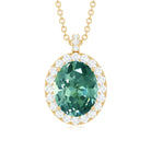 Enrich your allure with this mesmerizing Pendant Necklace showcasing a dazzling Oval Shape Lab Created Green Sapphire as the centerpiece, delicately set in a prong setting. The captivating created sapphire is encircled by a radiant halo of Diamond gemstones, exuding brilliance from every angle.