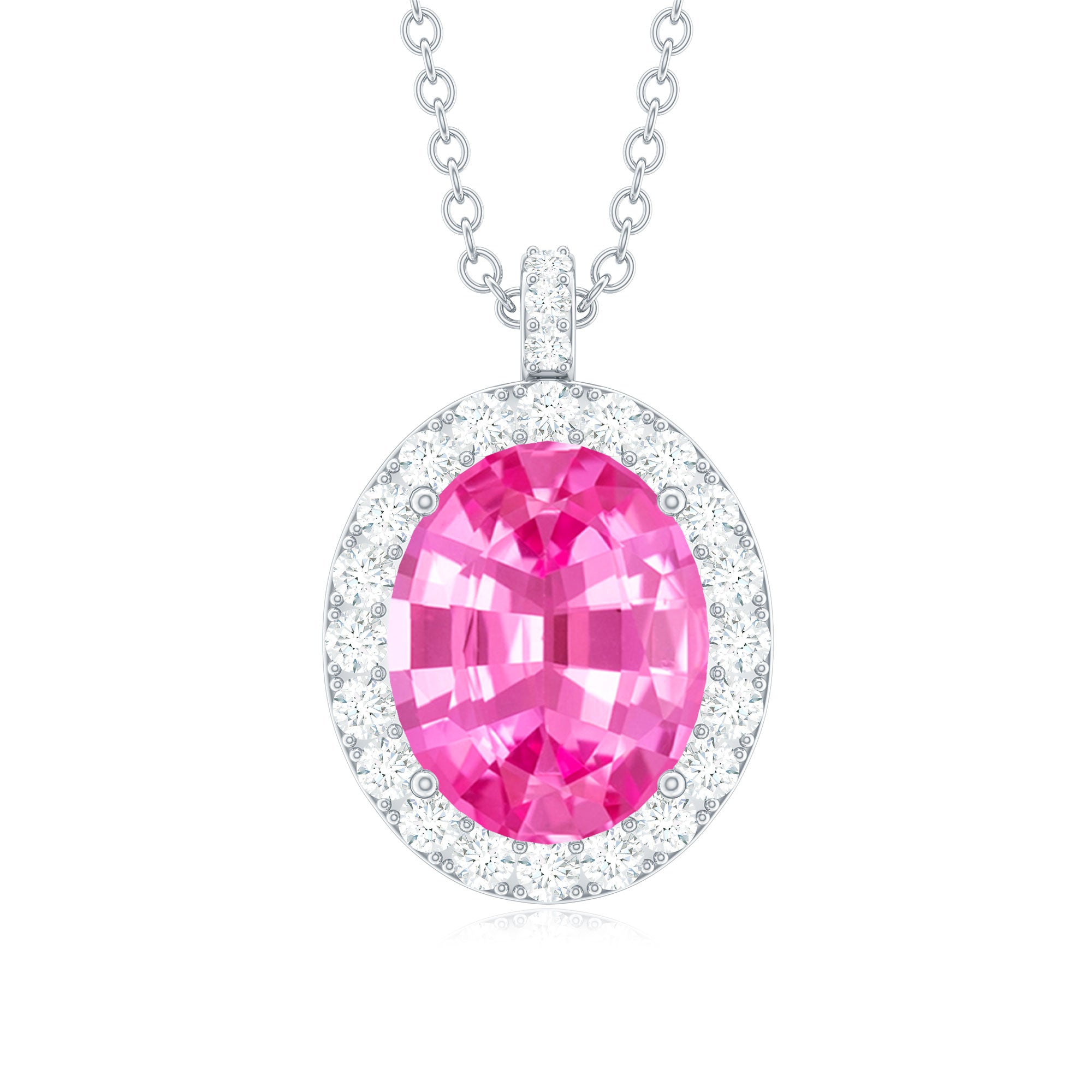This captivating Pendant Necklace highlights an exquisite Oval Shape Lab Created Pink Sapphire at its core, gracefully placed in a prong setting. The alluring created sapphire is encircled by a sparkling halo of Diamond gemstones, radiating brilliance from every perspective.