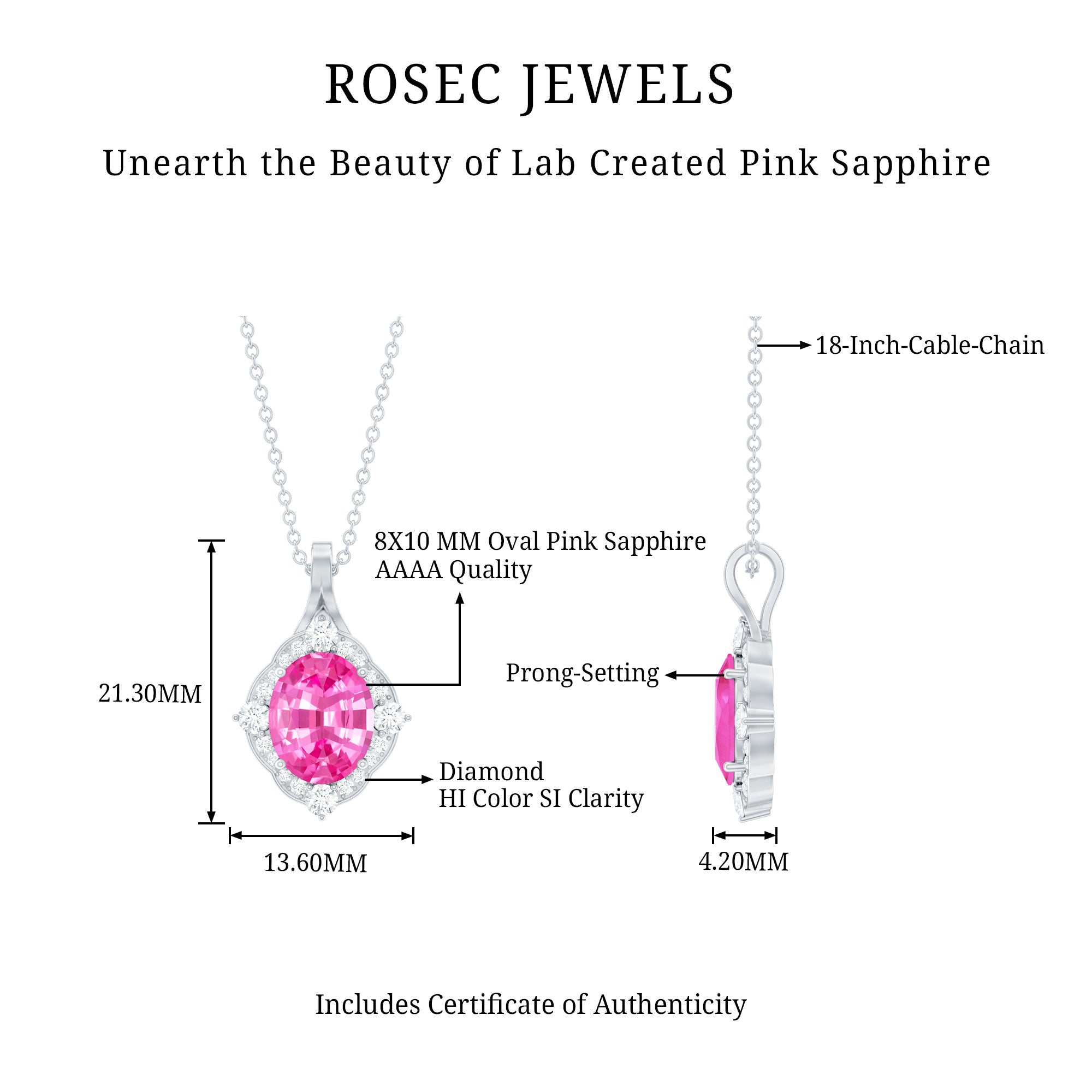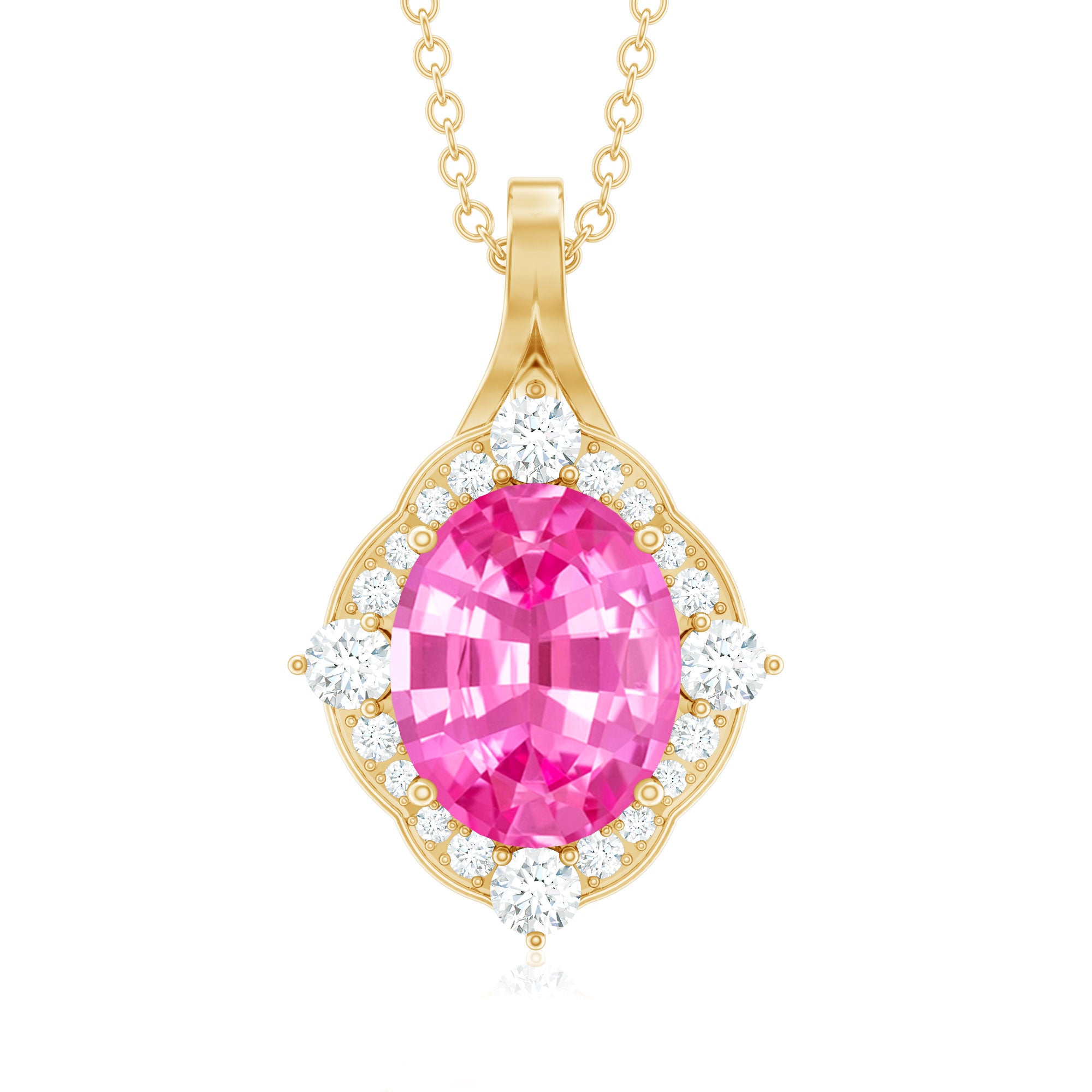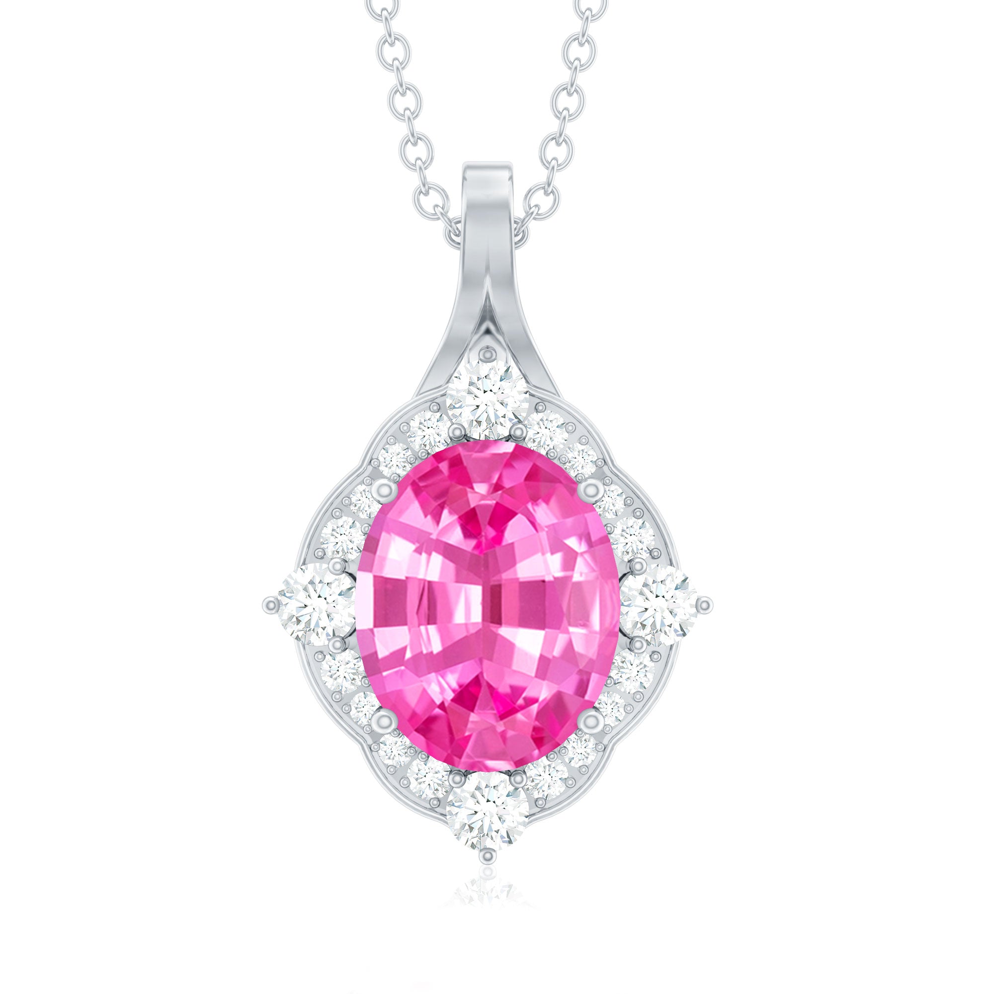 Oval Created Pink Sapphire Vintage Style Pendant with Diamond Halo