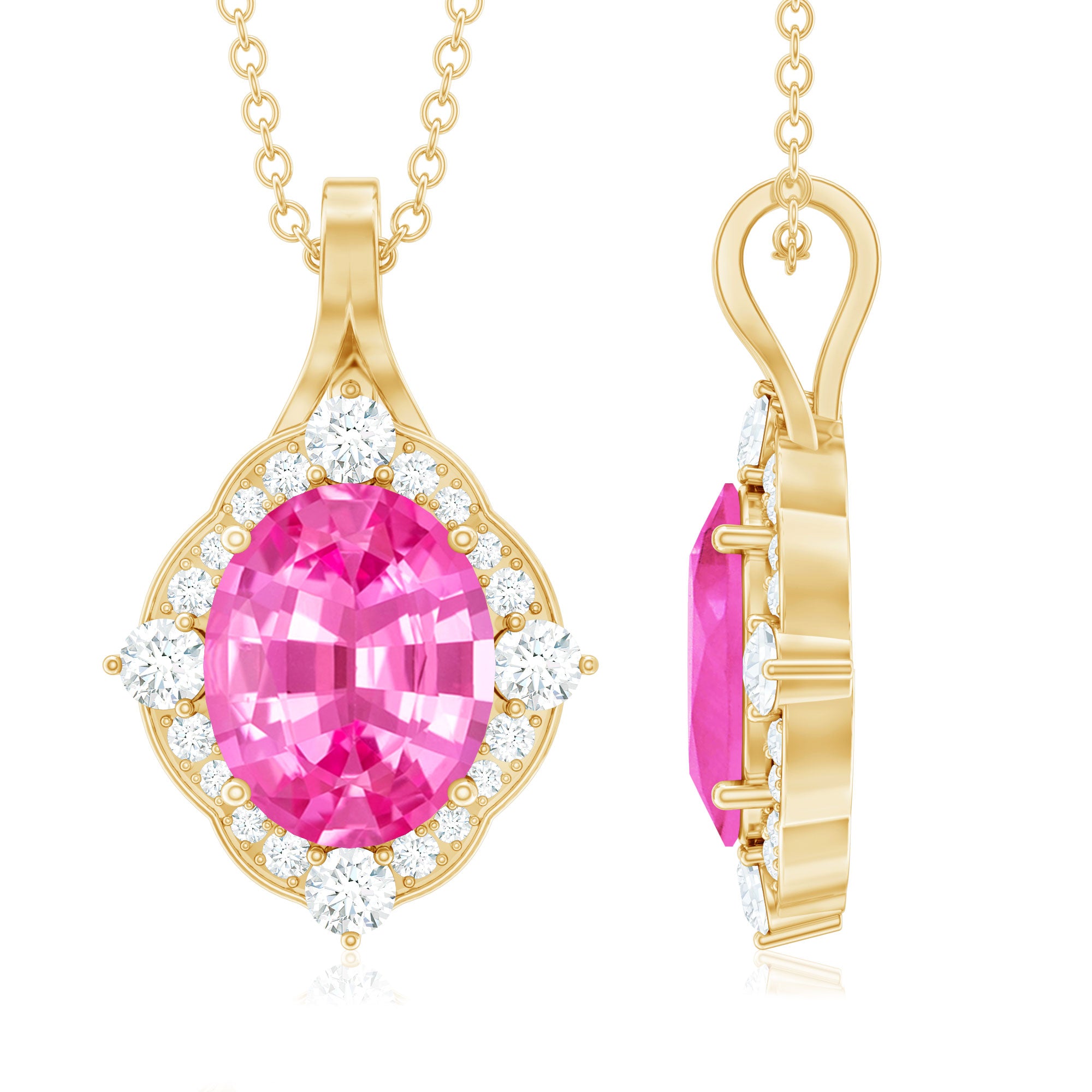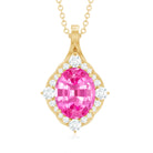 Experience the allure of a bygone era with this striking pendant necklace featuring a resplendent oval created pink sapphire, embraced by a dazzling halo of sparkling Diamond. Enhancing its elegance, additional round Diamond adorn each of the four sides, exuding an irresistible touch of glamour.
