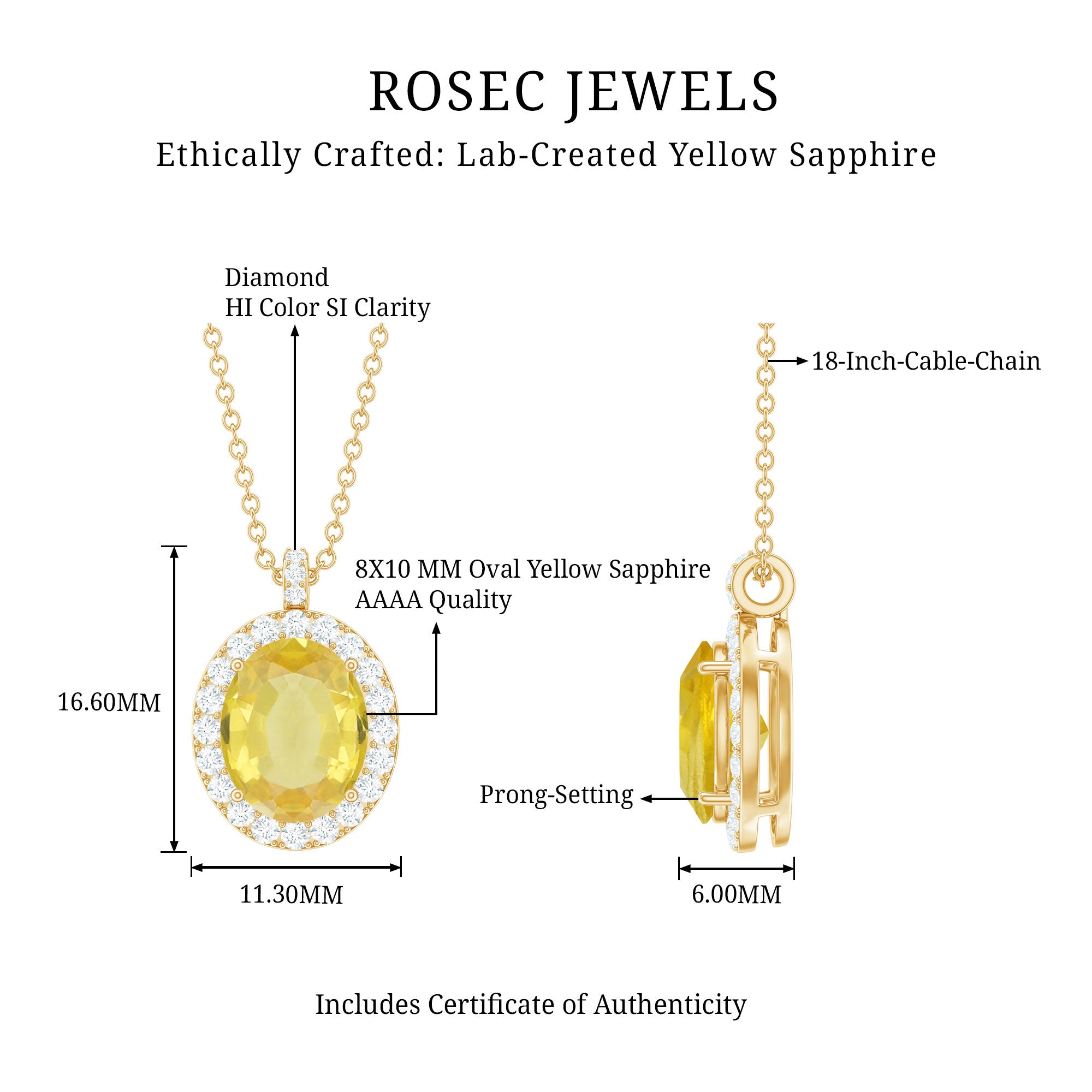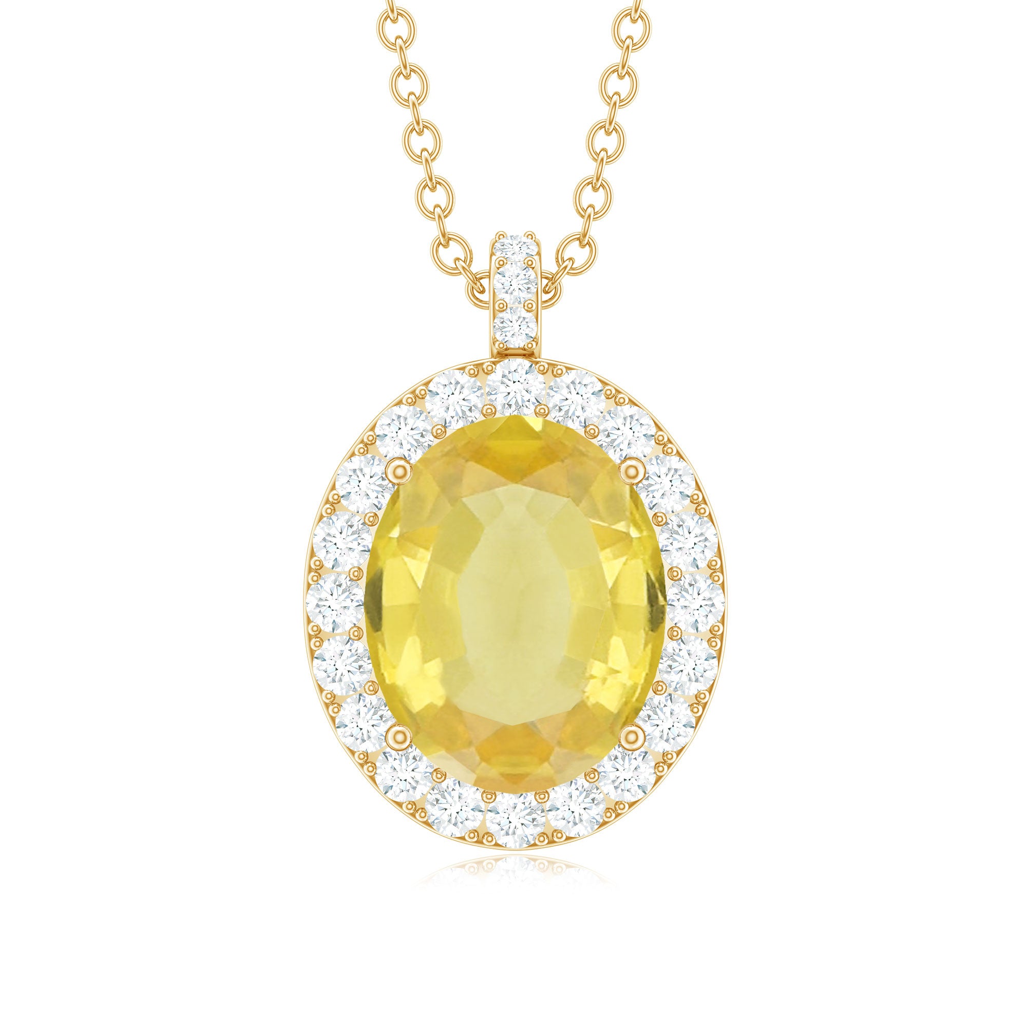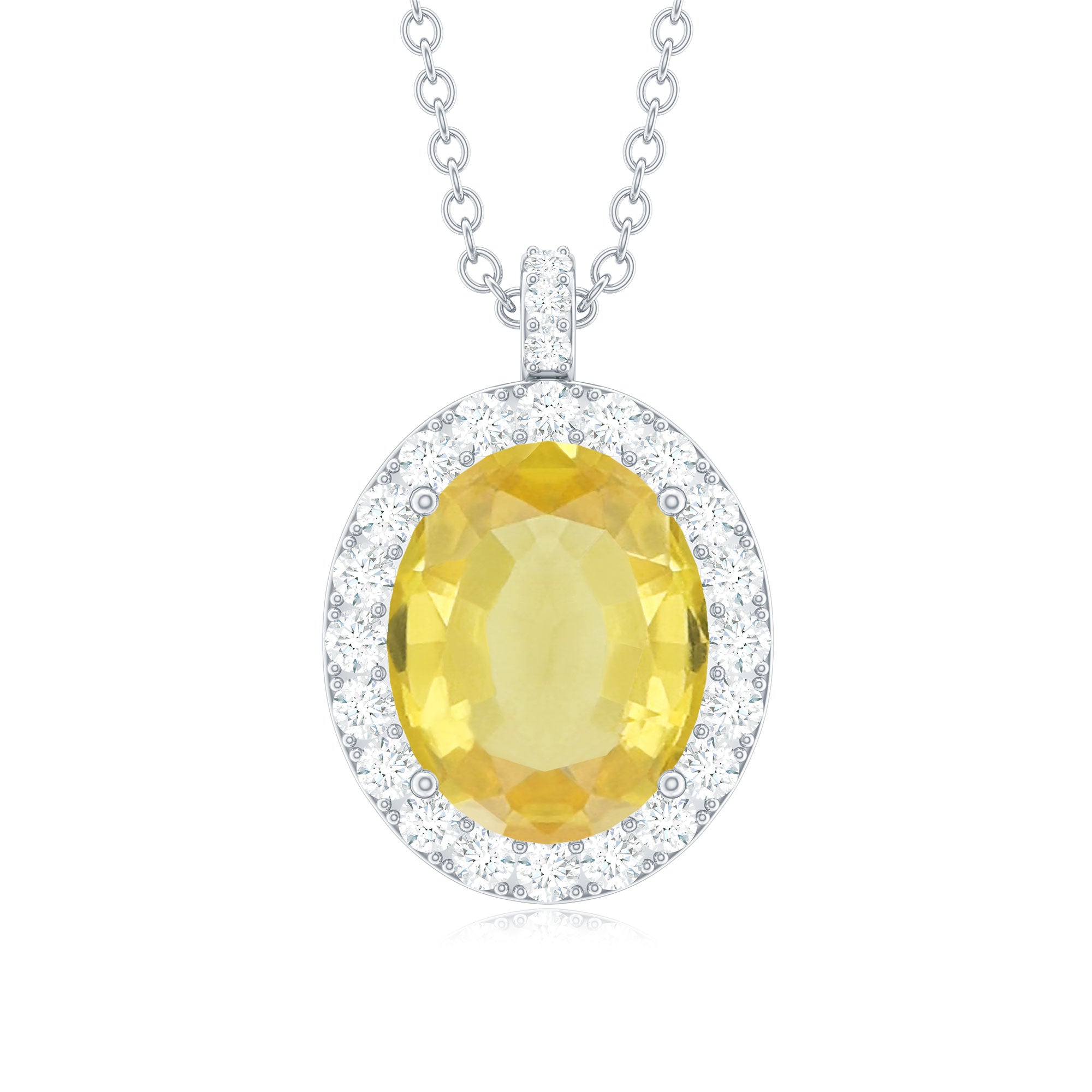 Enhance your allure with this mesmerizing Pendant Necklace that showcases a stunning Oval Shape Lab Created Yellow Sapphire as its centerpiece, delicately nestled in a prong setting. The enchanting created sapphire is surrounded by a brilliant halo of Diamond gemstones, emitting a radiant brilliance from every angle. This pendant exudes elegance and captivates attention with its captivating design.