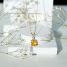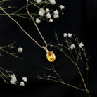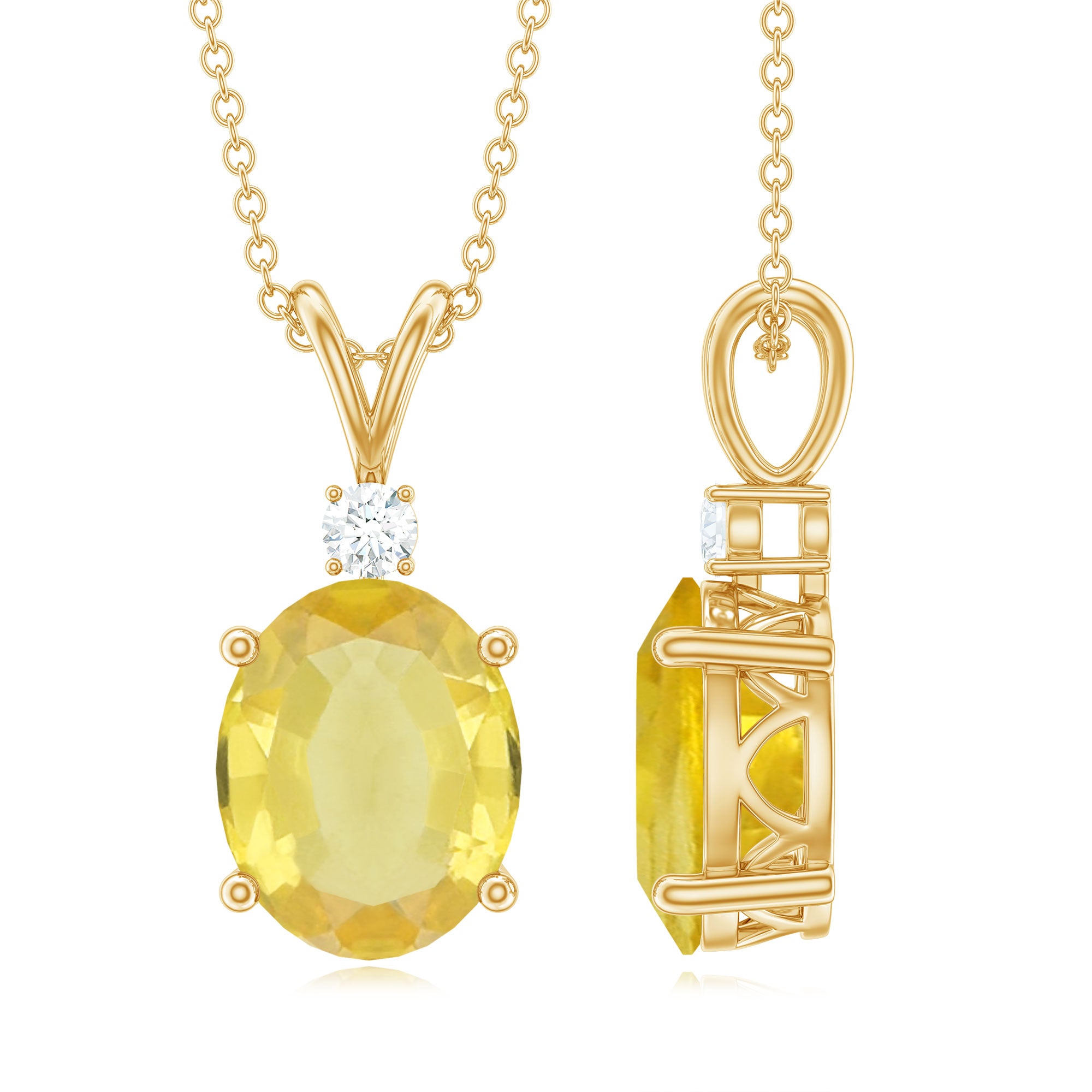 Elevate your fashion game with this exquisite Solitaire Pendant that demands attention. The centerpiece features a mesmerizing oval-shaped created yellow sapphire, radiating a luxurious and captivating yellow hue, perfectly complemented by a sparkling round moissanite gemstone. The pendant boasts a graceful rabbit ear bail, adding a touch of opulence and enhancing the overall design.