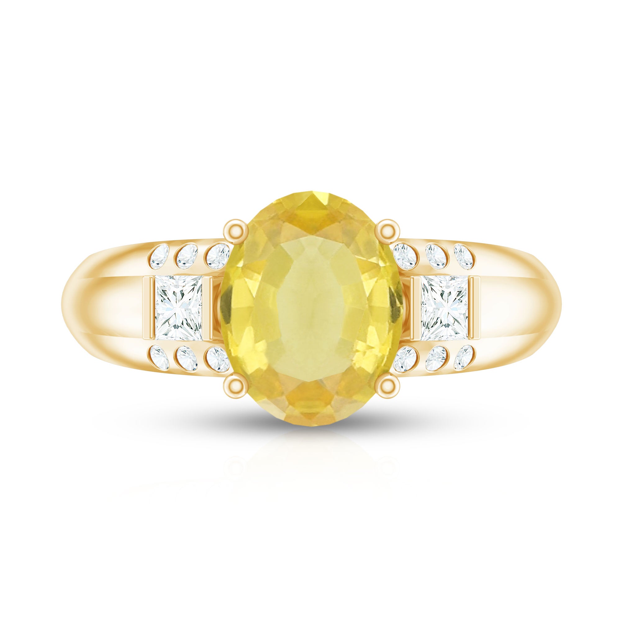 Give your special one this Solitaire Engagement Ring Set to show your love. Composed of Solid Metal, embellished with Oval Cut Lab Grown Yellow Sapphire in 4 Prong Setting while Princess and Round Shape Diamond studded on the shank. This Lab Grown Yellow Sapphire Ring would be really special for her as she will adore this ring for her whole life.
