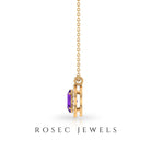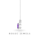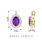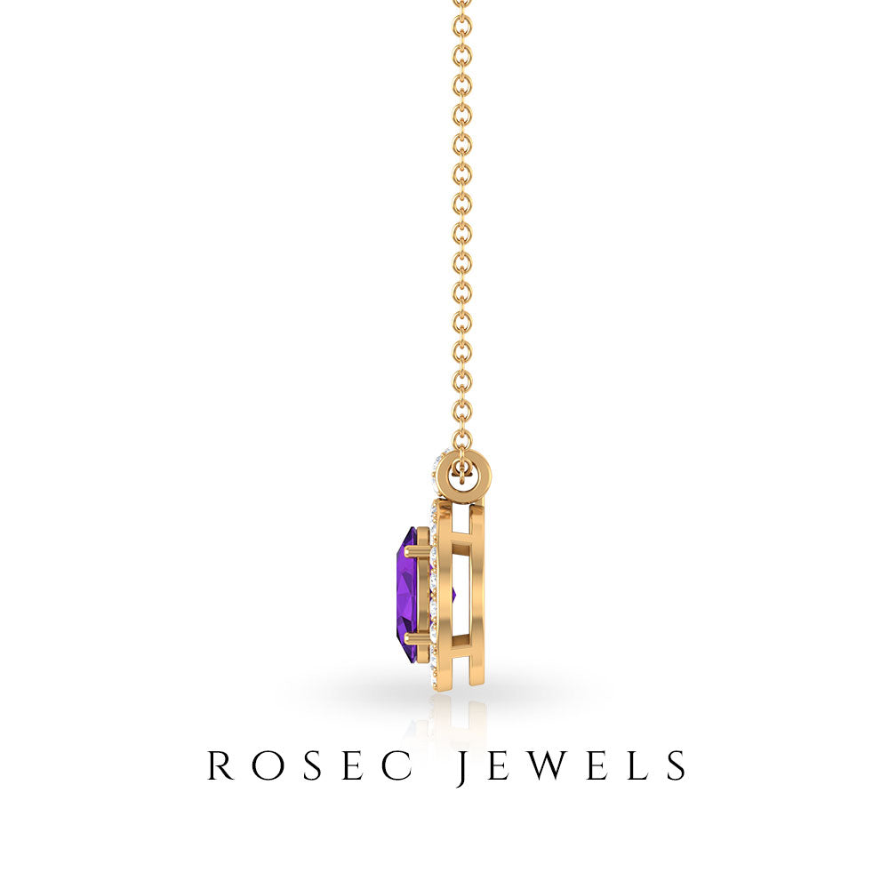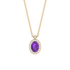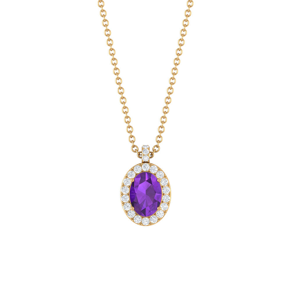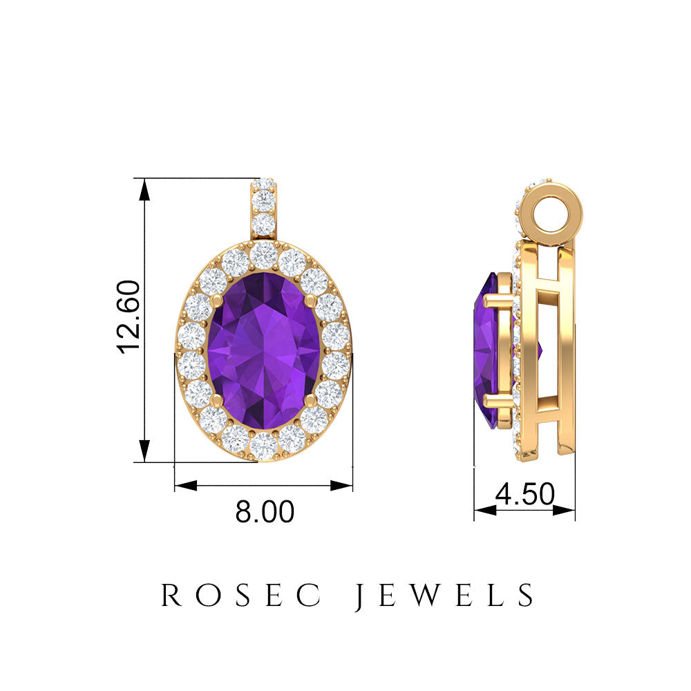 Enhance your neckline with the stunning elegance of this Oval Shape Amethyst Pendant. Featuring a mesmerizing Amethyst surrounded by a sparkling Diamond halo, this halo pendant exudes timeless beauty. The accent bail adds a touch of sophistication to complete the look.