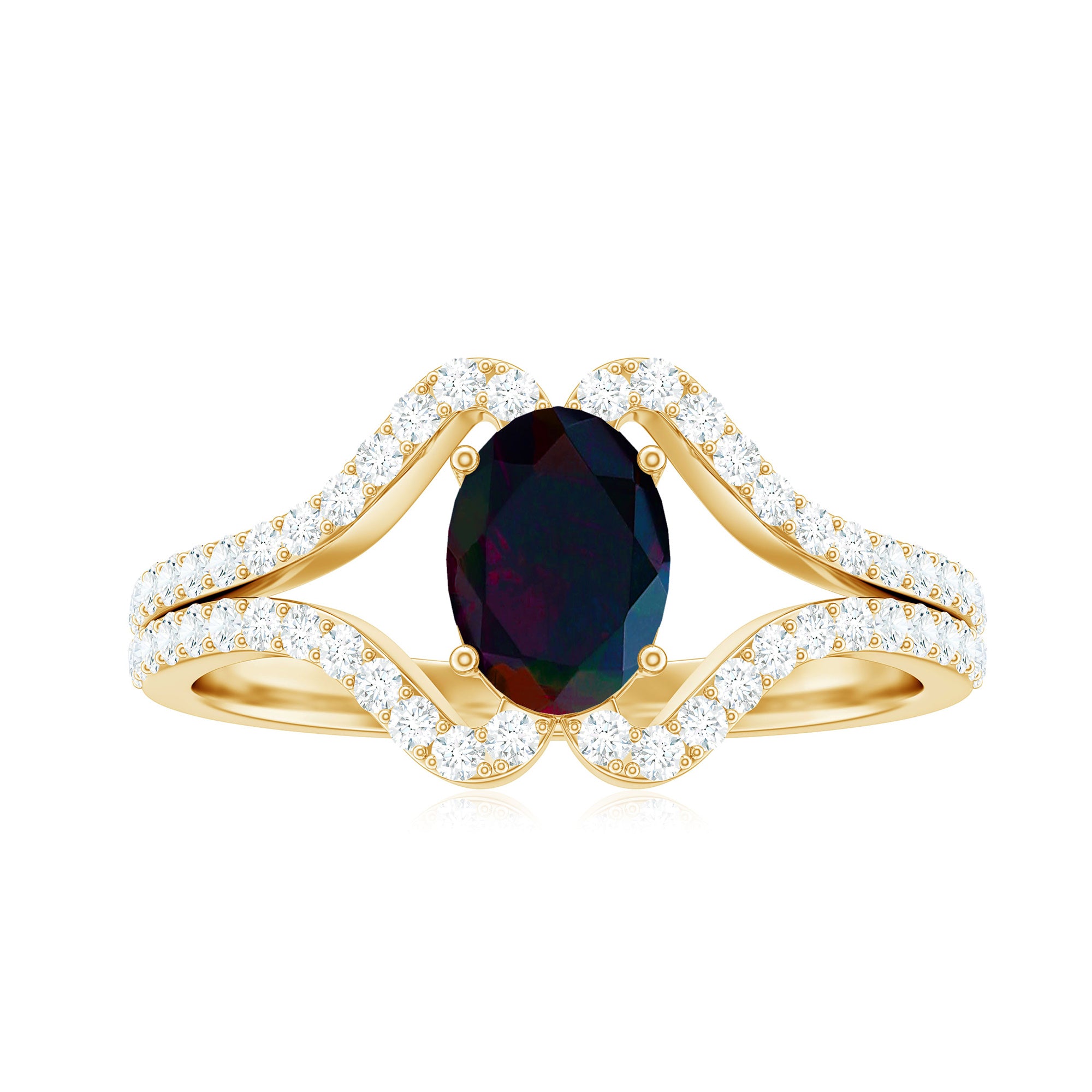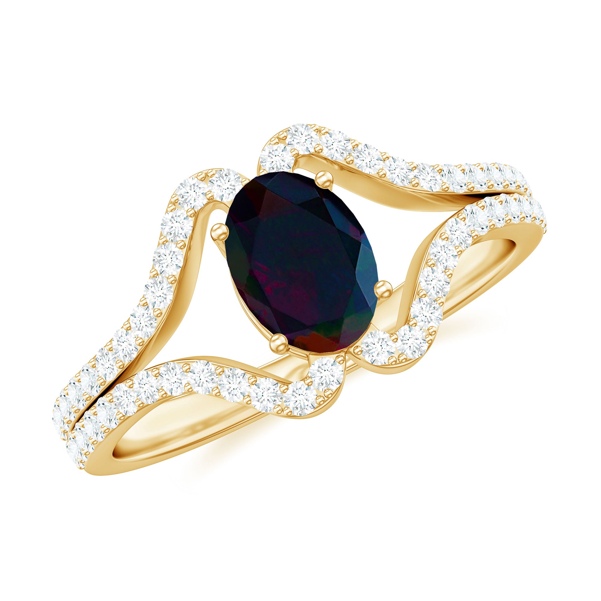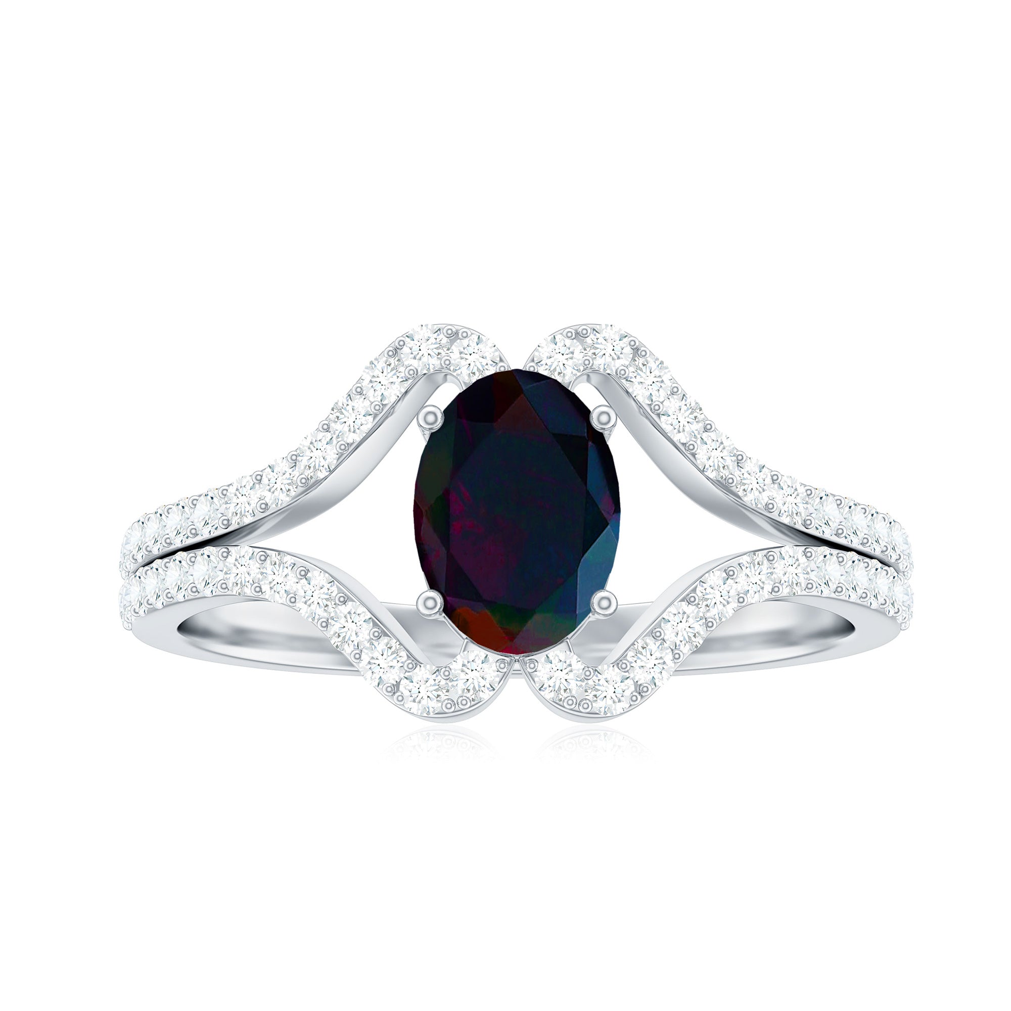 Oval Cut Black Opal and Diamond Split Shank Engagement Ring