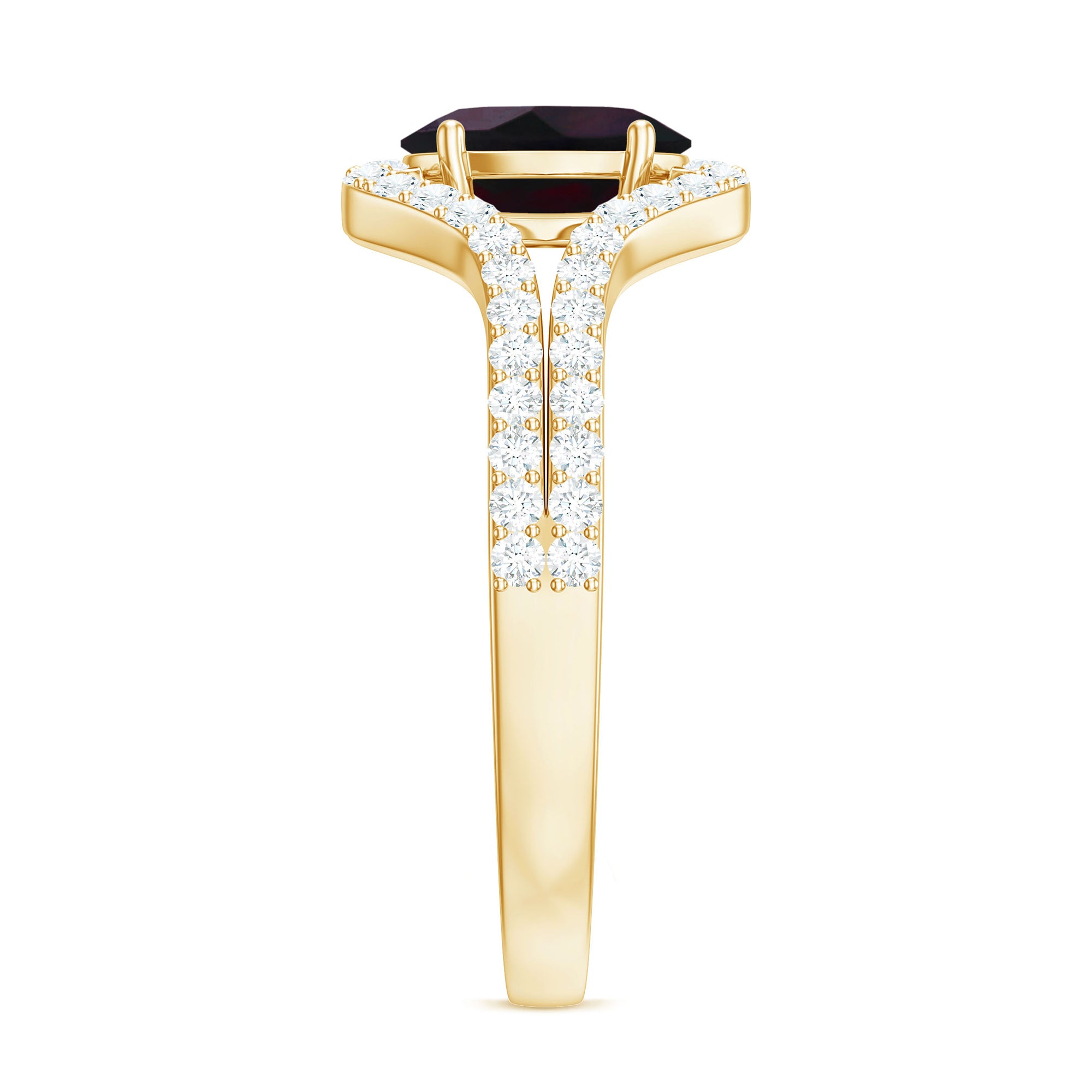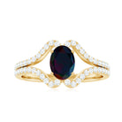 This striking ring features an oval cut Black Opal stone set on a split shank band, accented with sparkling Diamond stones. The Engagement ring is crafted from gold metal, and the Black Opal stone adds a touch of glamour and sophistication to the design. The split shank band adds a modern and unique touch to the classic design, making it a perfect choice for someone who wants a one-of-a-kind ring that is both elegant and contemporary.