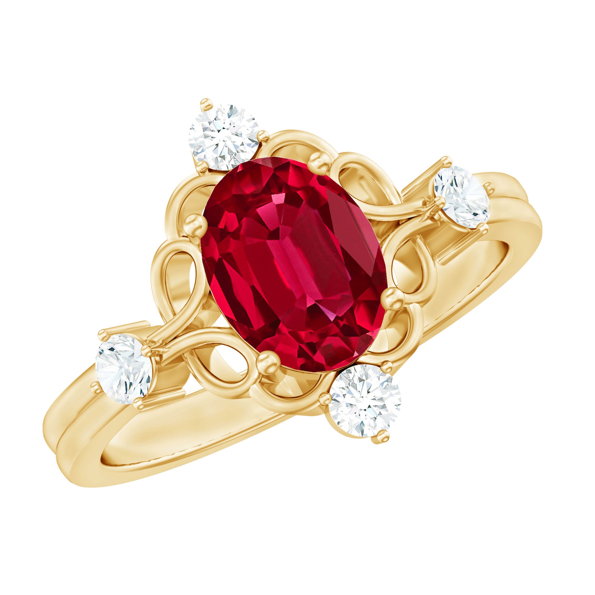 Treat your look with this lovely Gold Cocktail Engagement Ring adorned with Oval Shape Created Ruby set as a solitaire and Round Shape Diamond in a prong setting. This Solitaire Cocktail Ring is mounted in gold for a luxurious look.