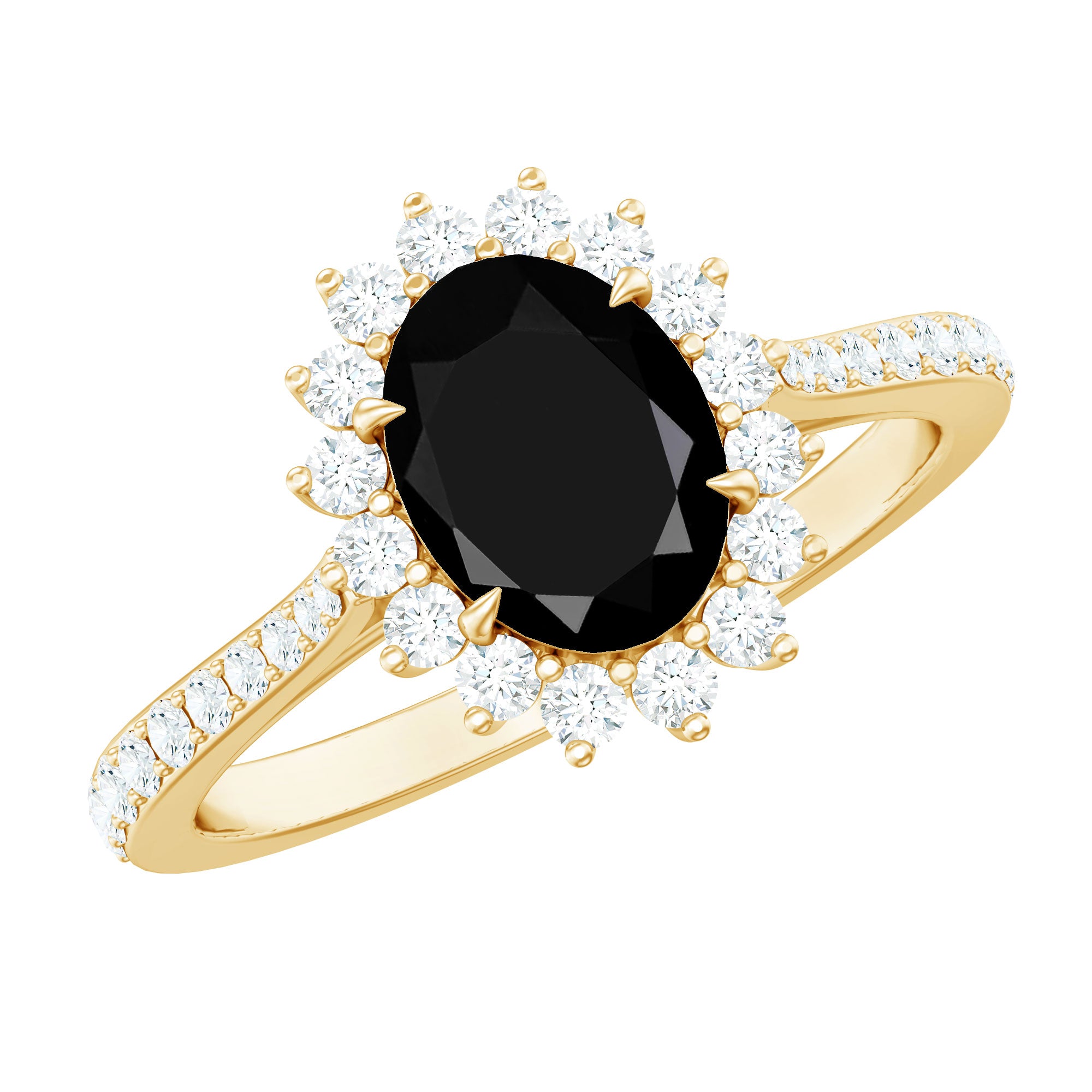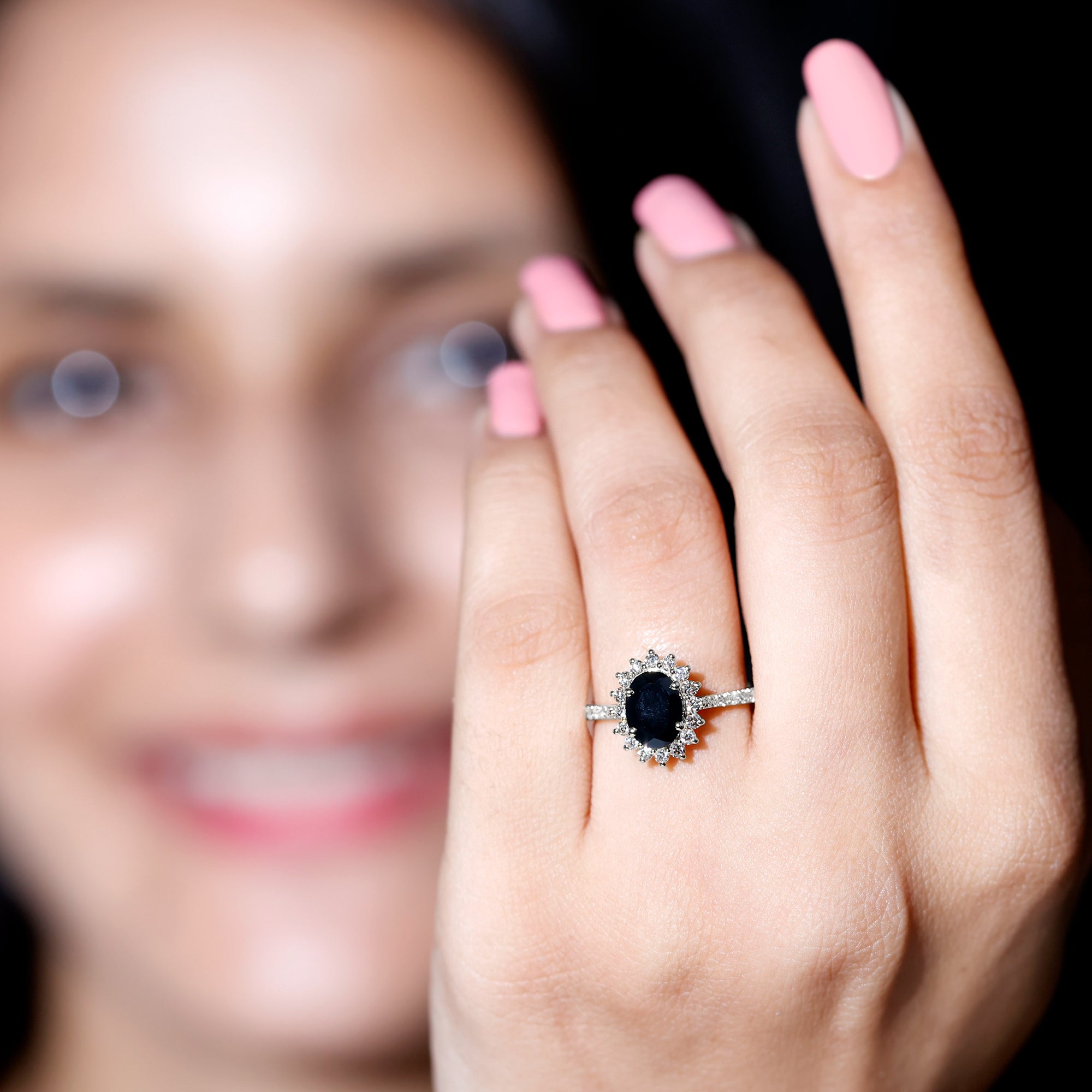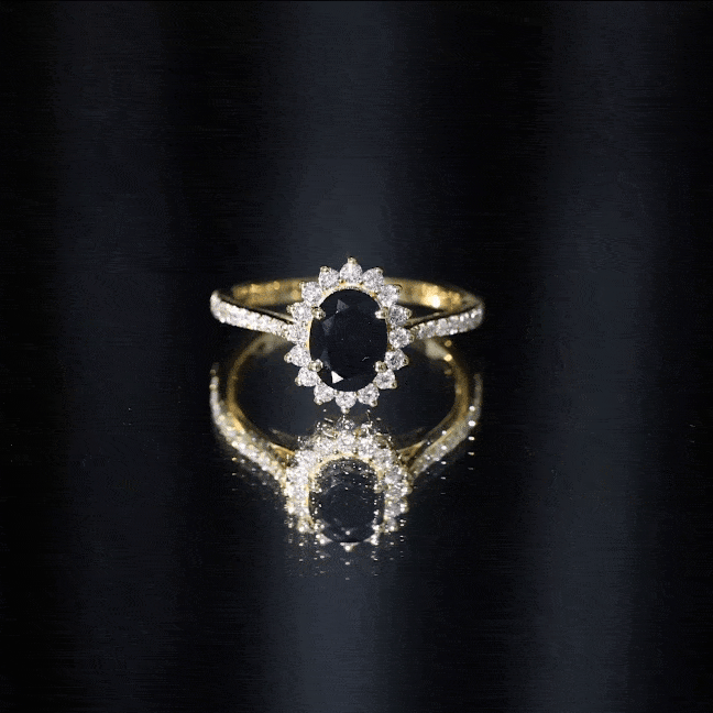 Become a show stopper with this astonishing Created Black Diamond Ring adorned with Diamond in Halo and side stone style. Introducing oval shape created Black Diamond in Claw Setting making this ring a perfect fit for every sort of occasion. This ring is also an excellent choice for your partner for her special day.