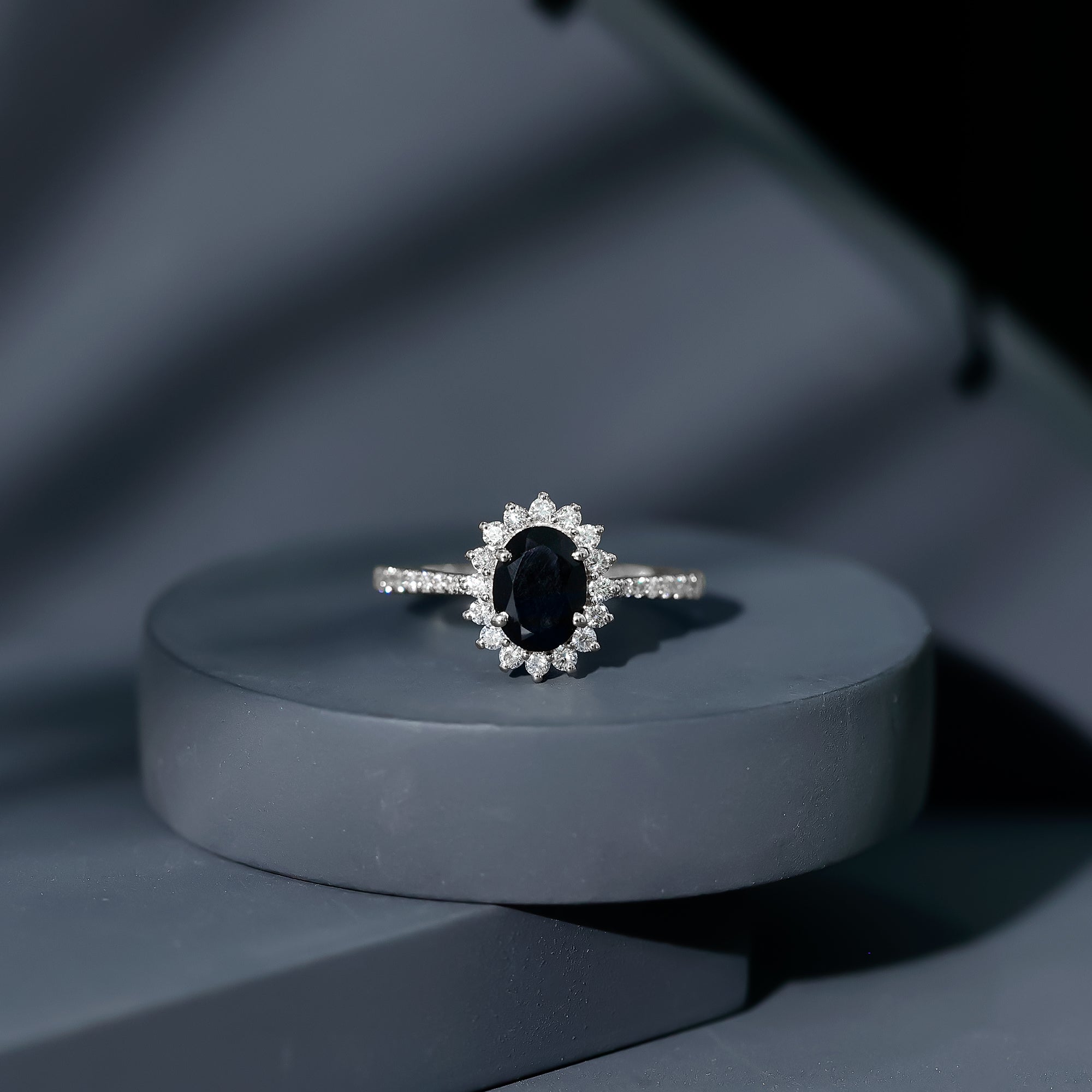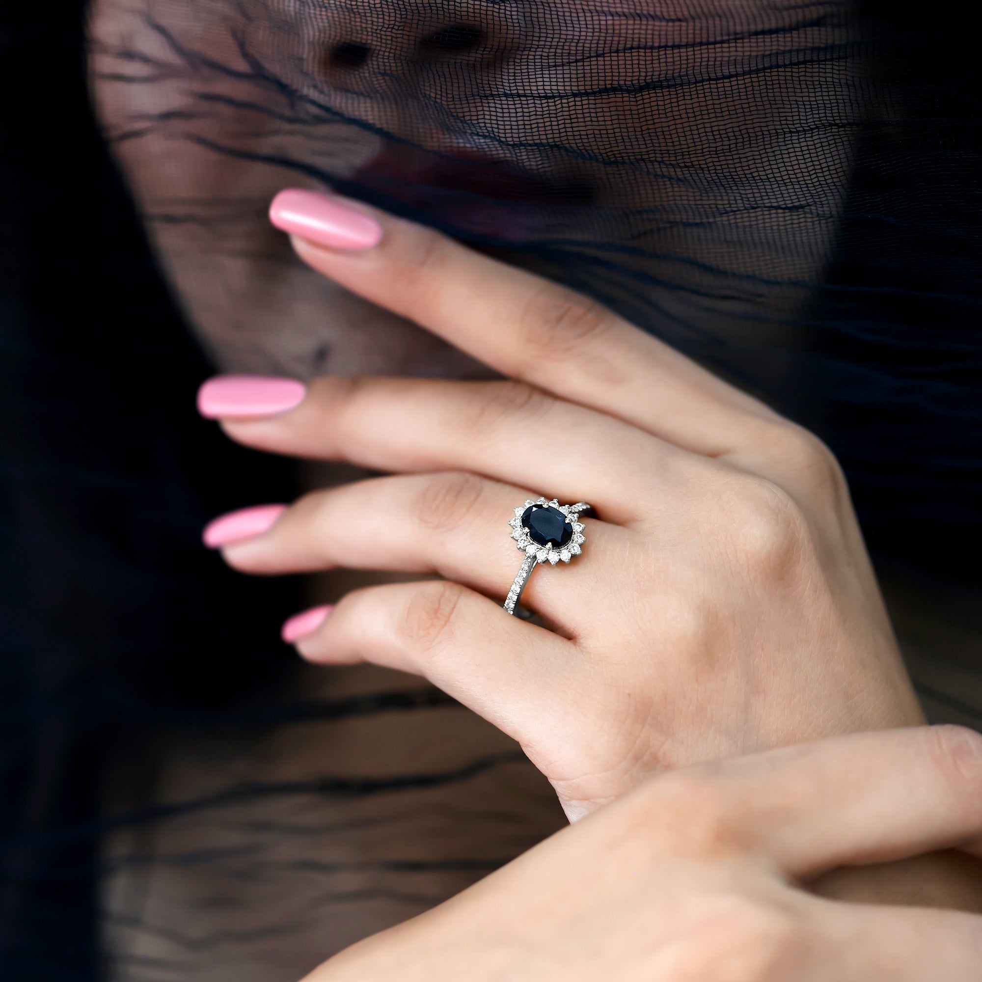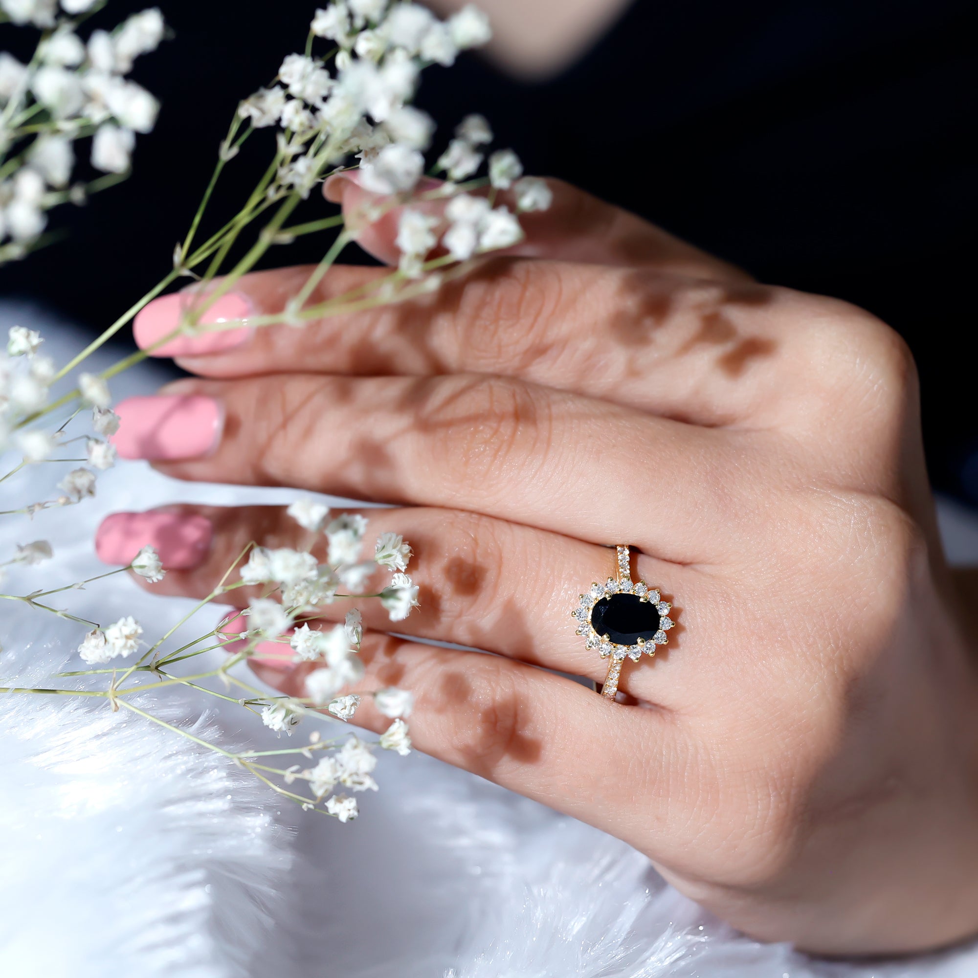 Become a show stopper with this astonishing Created Black Diamond Ring adorned with Diamond in Halo and side stone style. Introducing oval shape created Black Diamond in Claw Setting making this ring a perfect fit for every sort of occasion. This ring is also an excellent choice for your partner for her special day.