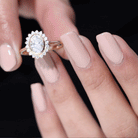 A halo engagement ring surrounds the center gemstone with smaller accent stones, creating additional sparkle and visual dimension.