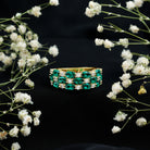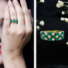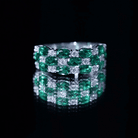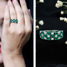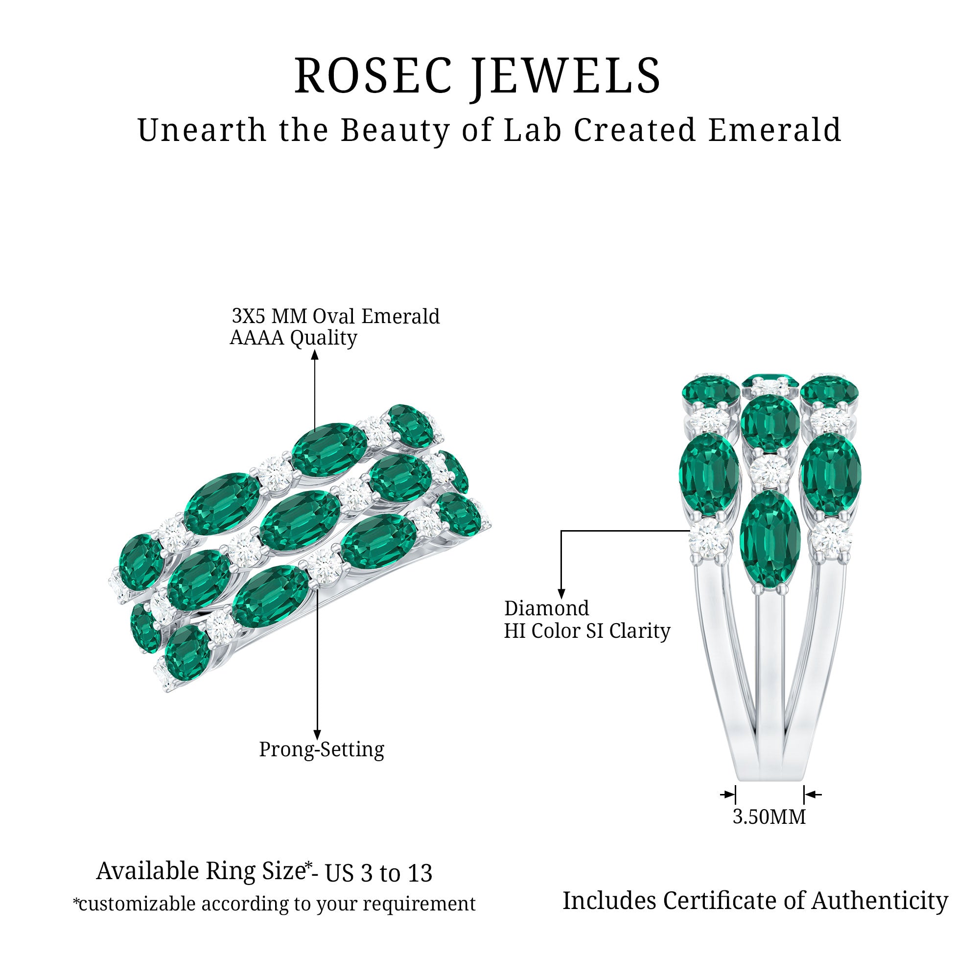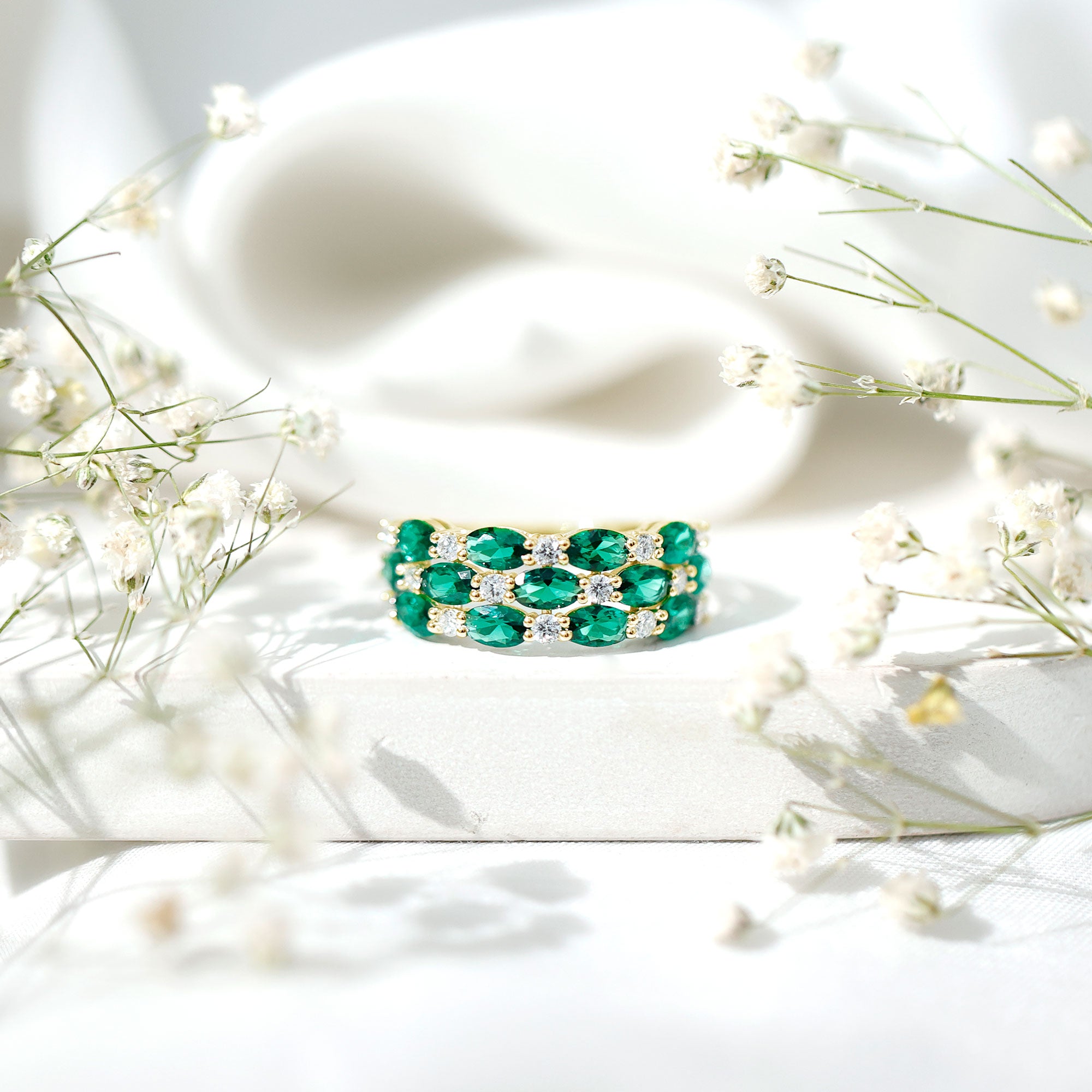 Celebrate elegance and enduring love with this Wedding Band - a graceful piece that effortlessly blends classic sparkle with modern design. Thoughtfully handcrafted by skilled artisans, this Statement Ring is made using precious metal and certified gems, offering exceptional brilliance and value. This 3 Row Eternity Ring showcases oval cut lab created emerald and round shape diamond alternately set in prong setting that enhances their fire and beauty. The clever arrangement creates a sophisticated Eternity Band that is eye-catching without being overwhelming, making it the perfect symbol of your lasting bond. Whether you are marking a milestone or simply adding a statement piece to your collection, this Anniversary Band is designed to impress. It wraps around the finger with a timeless elegance that evokes both romance and nostalgia. The intricate craftsmanship ensures not only visual appeal but long-lasting comfort and durability. Comes in a beautifully packed charming jewelry box, making it an ideal gift or a treasured keepsake for yourself. With a variety of ring sizes available, youre sure to find the perfect fit for your special day or everyday sparkle. Make every moment shine with this stunning Half Eternity Band - because your love deserves nothing less than extraordinary.