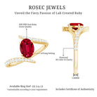 Add a touch of color and elegance to your love story with this beautiful Lab Created Ruby Engagement Ring. It features a 6X8 MM oval cut lab grown ruby, securely set in prongs. The deep hue of the ruby symbolizes love and passion, making it a perfect choice for such a meaningful occasion. The band features a graceful bypass design, accented with sparkling diamonds that shimmer with every movement. The smooth and curved shape of the band not only adds a modern touch but also ensures a comfortable fit for everyday wear. This Ruby and Diamond Engagement Ring combines luxury and simplicity in perfect harmony. Each stone is carefully placed to reflect light beautifully, giving the Oval Engagement Ring a timeless and romantic feel. Ideal for engagements, anniversaries, or heartfelt gifts, it captures the beauty of love in every detail. Elegant, radiant, and full of meaning, this Bypass Engagement Ring is a piece to be treasured, a perfect blend of passion, style, and lasting grace.