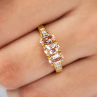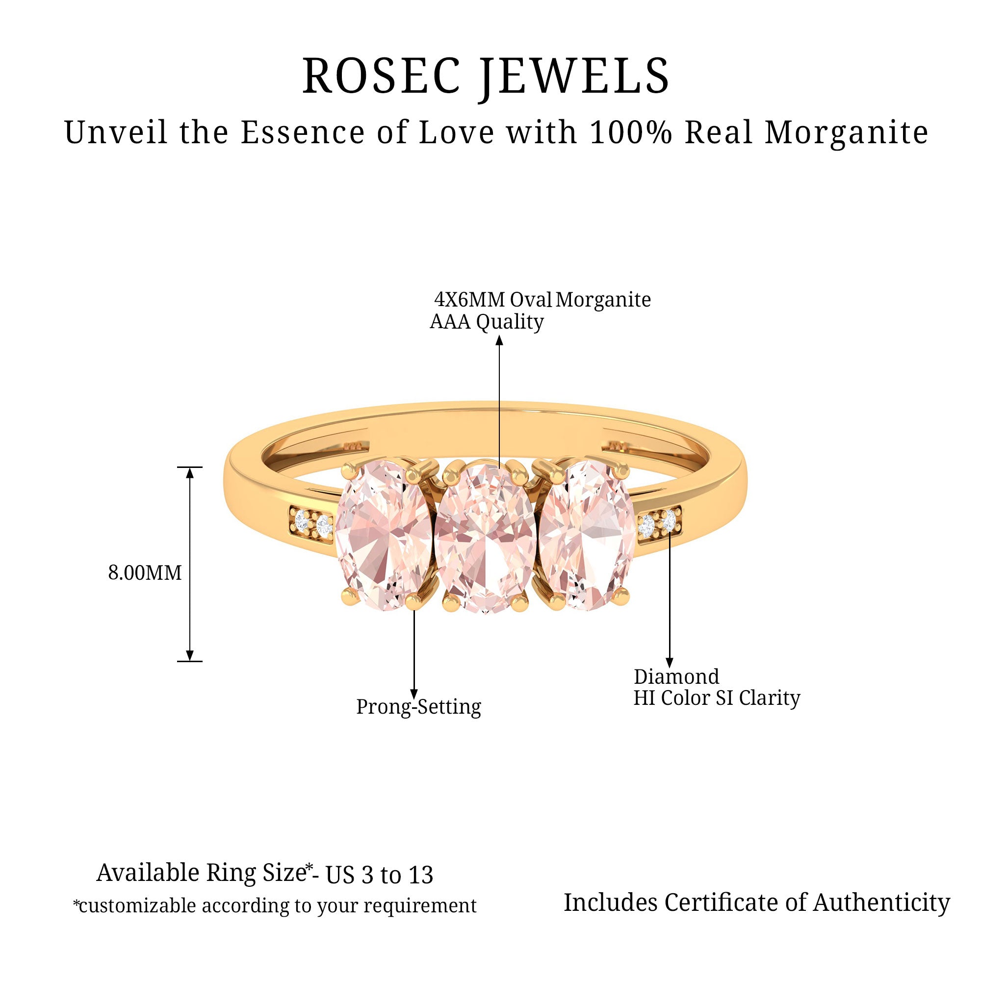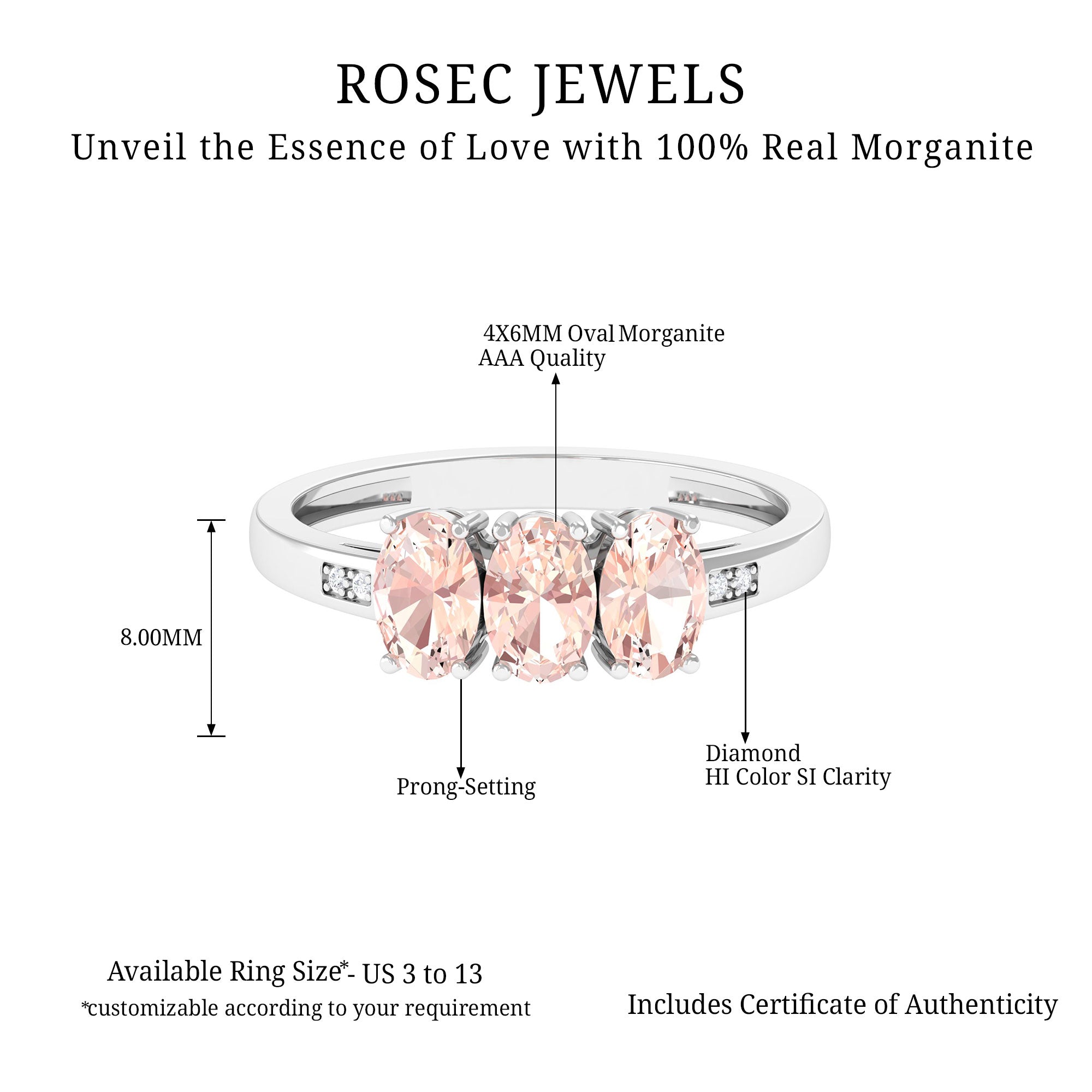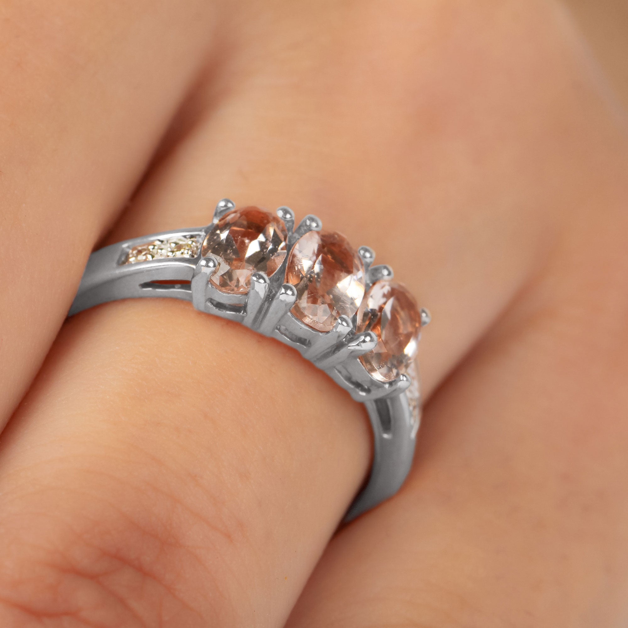 Three oval shape morganite come together on this three-stone engagement ring that beautifully represents the past, present and future moments of a couple. Scintillating round Diamond flanks the center stone for an extra dose of sparkle. The Diamond and morganite are mounted on prongs for an enhanced look. Makes a gorgeous and meaningful addition to your ring stack with its deep significance and unmatched aura.