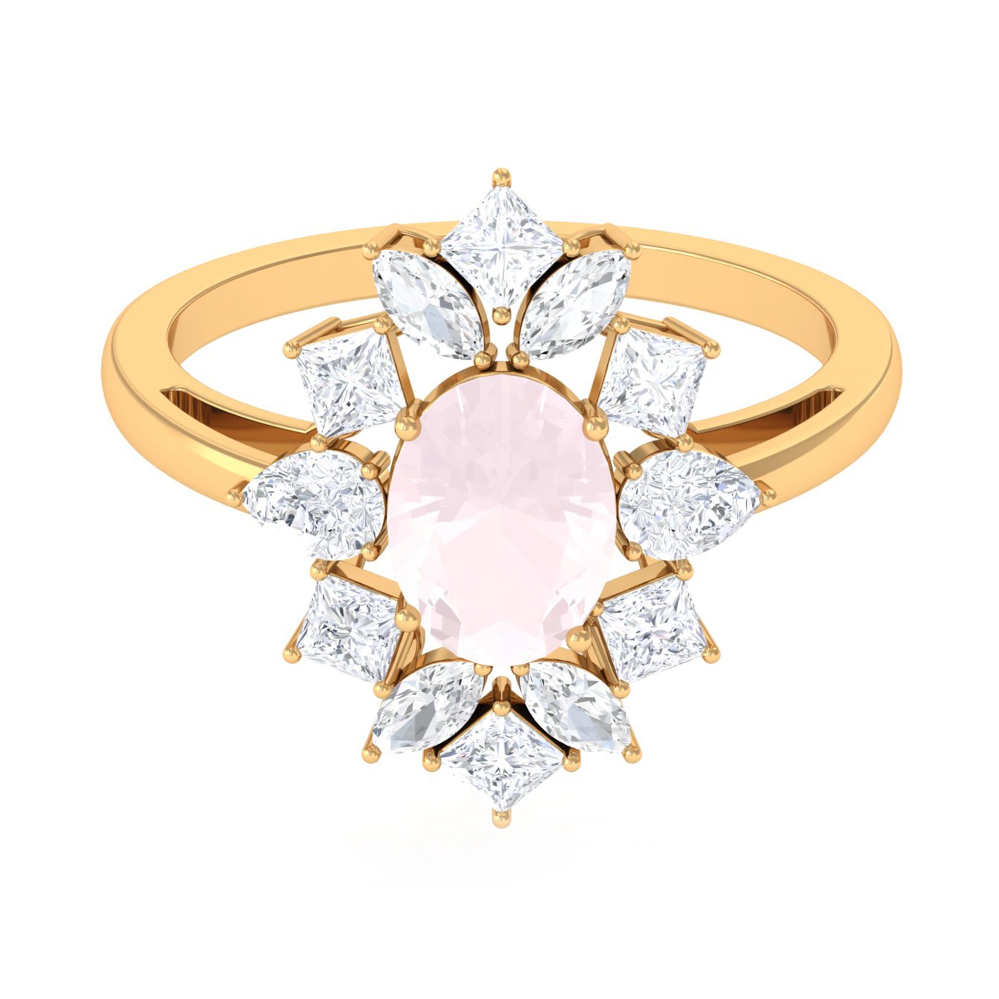 Dress up your look with this elegant Cocktail Ring embellished with Oval Cut Rose Quartz in Prong Setting and encircled with Pear, Marquise and Princess Cut Moissanite in Prong Setting. This Rose Quartz Cocktail Ring is crafted with Gold, lending extra shimmer and shine.