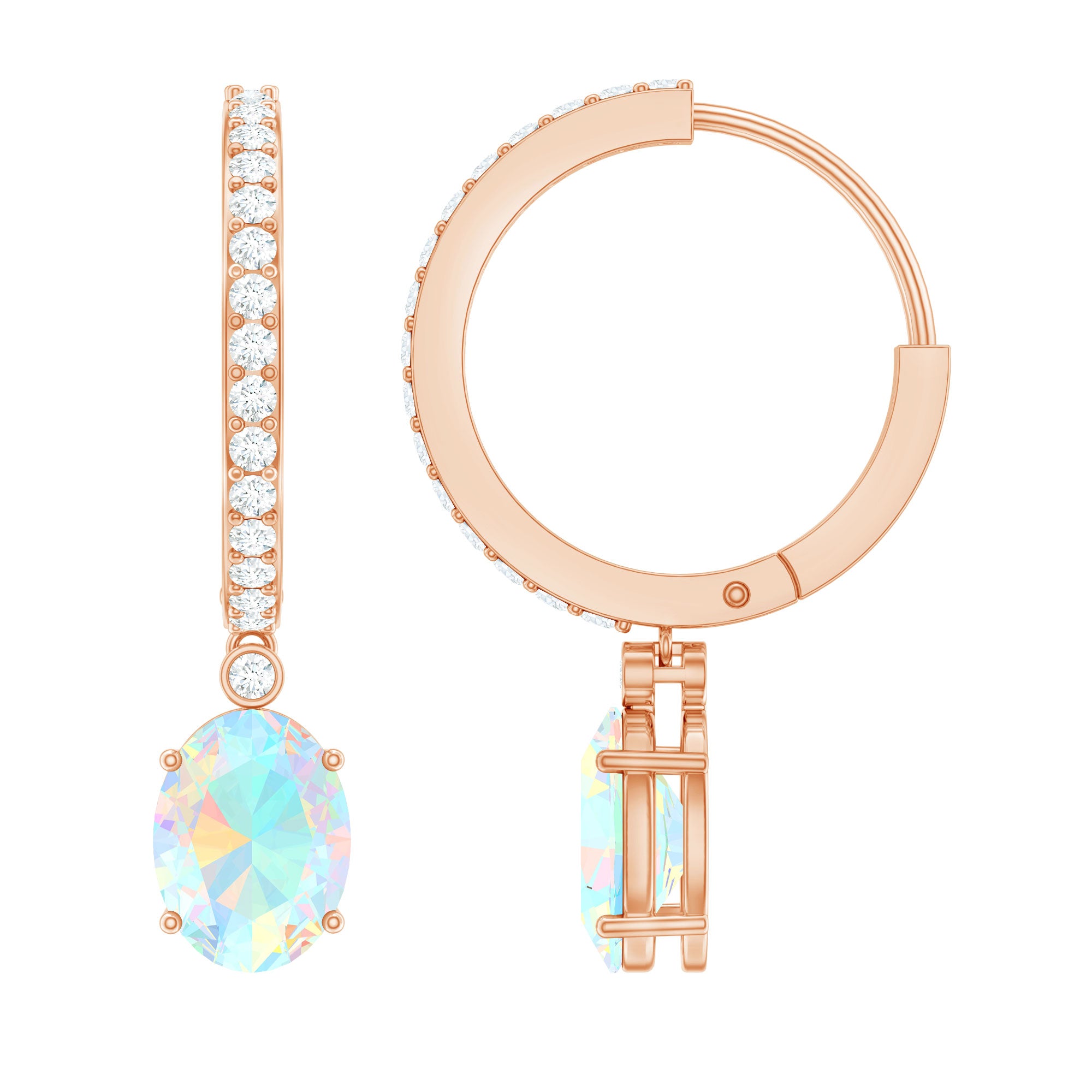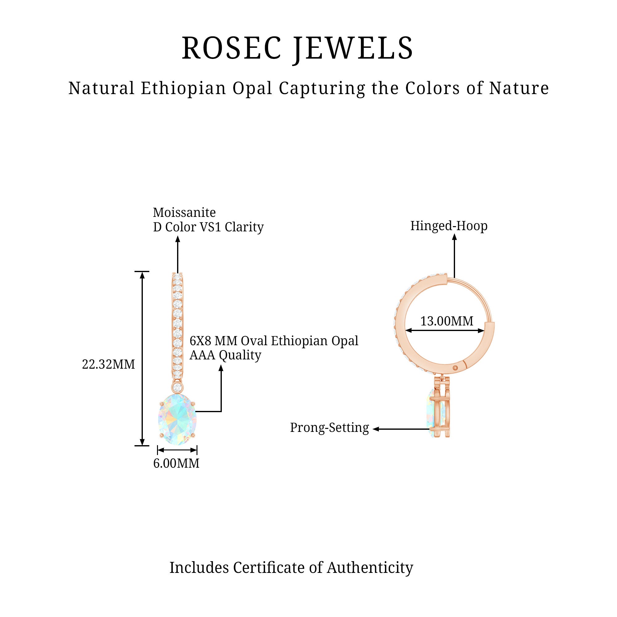 Elevate any outfit with these Hoop Drop Earrings, designed to make every moment feel special. Each earring showcases a 6X8 MM oval cut Ethiopian opal, held securely in prong setting to highlight its glowing colors. The opal’s vibrant hues catch the light beautifully, adding warmth and charm to the design. The hoops are accented with sparkling moissanites, forming a smooth trail of brilliance from top to bottom. This combination of AAA quality ethiopian opal and D-VS1 quality moissanite creates a luxurious look while maintaining a graceful style. Hinged hoop closures ensure the Ethiopian Opal Earrings stay safely in place, providing comfort whether worn during a busy day or a glamorous evening event. Ideal for anniversaries, birthdays, or other meaningful occasions, these Opal and Moissanite Earrings make a thoughtful and lasting gift. They pair effortlessly with formal attire or add a touch of sparkle to everyday outfits, making them a versatile and timeless addition to any jewelry collection. Carefully crafted with attention to detail, the Oval Hoop Earrings blend elegance, color, and brilliance in one stunning piece.