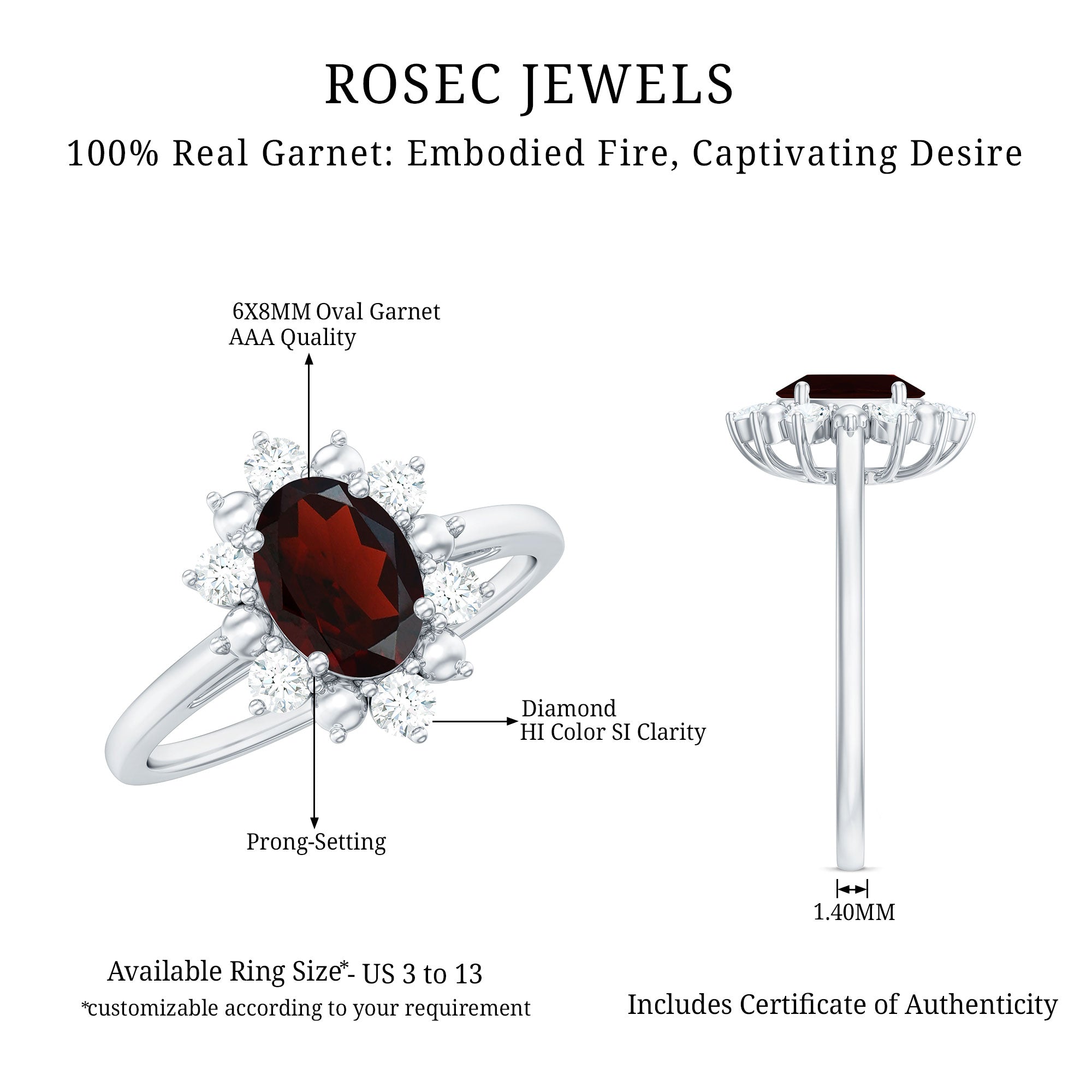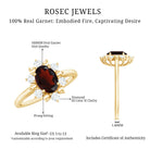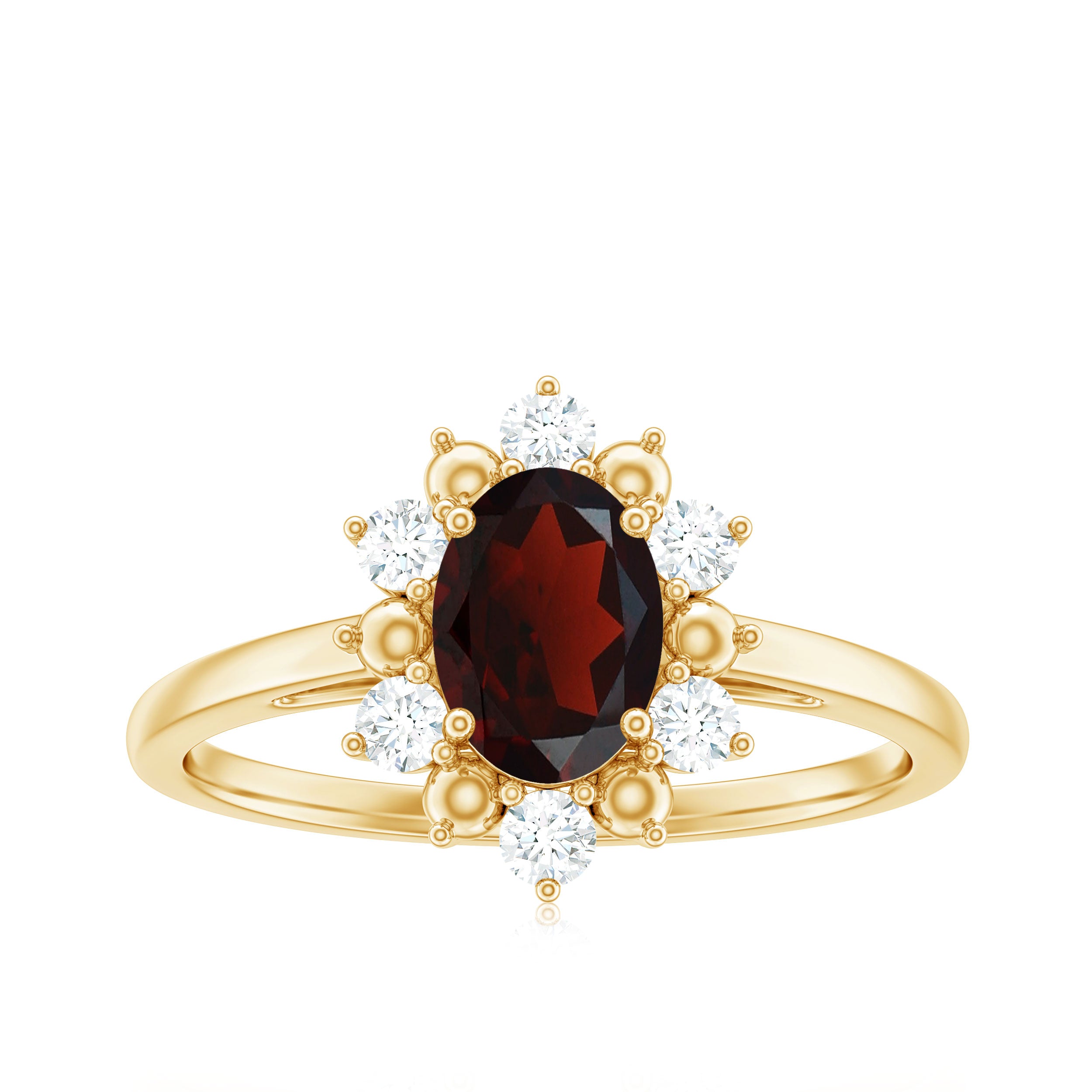Beautifully designed, this Halo Engagement Ring features an Oval Cut Garnet secured in 4 Prong Setting while Round Shape Diamond studded as Halo. This Floral Ring makes a unique present to your loved ones, like lover, girlfriend, wife, fiancée, daughter, friend, or even yourself for Valentines day, Mothers day, Christmas day, or any other occasion.