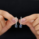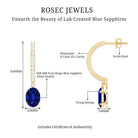 Ideal for anyone seeking elegance with a modern flair, these Blue Sapphire Hoop Earrings are crafted to catch attention on your special day. Featuring a 6X8 MM oval shaped lab created blue sapphire as the focal point, each earring is securely set with prongs. The solitaire sapphire hangs from a half hoop, embellished with round cut moissanites, which add extra sparkle and a graceful movement. Made with AAAA quality lab created sapphires and D-VS1 quality moissanites, these Oval Drop Earrings merge classic elegance with modern appeal. Their understated yet eye-catching design makes these Sapphire Drop Earrings suitable for both wedding day beauty and future special events. Secure screw back closures provide comfort and dependability, letting you celebrate without any concerns. These Lab Created Blue Sapphire Earrings represent a sophisticated taste, combining depth and brilliance in every aspect. They are crafted for those who desire luxurious jewelry, creating a look that is effortlessly striking and unforgettable.