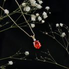 Take your fashion game to the next level with this mesmerizing Orange Sapphire Pendant Necklace that captures attention effortlessly. The centerpiece boasts an 8X10 MM oval shaped lab created orange sapphire, radiating a captivating and opulent orange hue that perfectly harmonizes with a dainty round moissanite gemstone. The Oval Sapphire Necklace showcases a sophisticated rabbit ear bail, adding a touch of elegance and luxury to the overall design. This Orange Stone Necklace is light, comfortable, and perfect for both daily wear and special occasions. Its simple yet graceful design gives it a timeless appeal that never goes out of style. The pendant’s craftsmanship and quality make it a piece to treasure for years to come. Get ready to shine and be admired with this stunning Solitaire Pendant that exudes unparalleled charm. Delivered in a luxurious jewelry box, this beauty is ready to create memories. Timeless, elegant, and ethically crafted, it provides a sparkle that endures for generations.