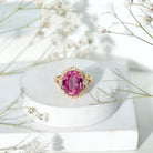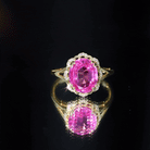 Drama and romance shine brightly in this bold Pink Sapphire Engagement Ring designed to leave a lasting impression. At the center rests a striking 10X12 MM oval cut lab created pink sapphire, secured in a double prong setting. Surrounding the center stone is a beautifully detailed floral inspired design, accented with sparkling diamonds that add depth and brilliance. The split shank band adds to the dramatic style, giving the Sapphire and Diamond Engagement Ring a wide and elegant appearance that feels both modern and glamorous. Designed for someone who loves standout jewelry, the Statement Ring works perfectly as an engagement ring, anniversary gift, or cocktail ring for special events. Its large size and intricate details make it ideal for moments when you want jewelry that speaks for itself. Crafted with care and high-quality materials, the Big Engagement Ring offers lasting beauty and comfort. Presented in a jewelry box and ready for gifting, it is a meaningful choice for surprising someone you cherish with a piece that feels bold, romantic, and unforgettable.