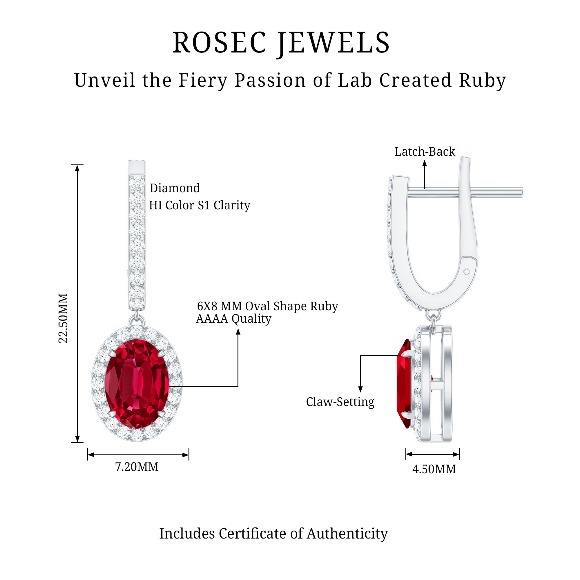 Upgrade your style with these elegant hoop drop earrings. They feature an oval-shaped Created Ruby solitaire set in a claw setting, surrounded by a halo of round-shaped Diamond stones. The Created Ruby center stone and the Diamond stones together create a beautiful harmony of color and sparkle, making them perfect for any occasion.