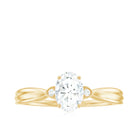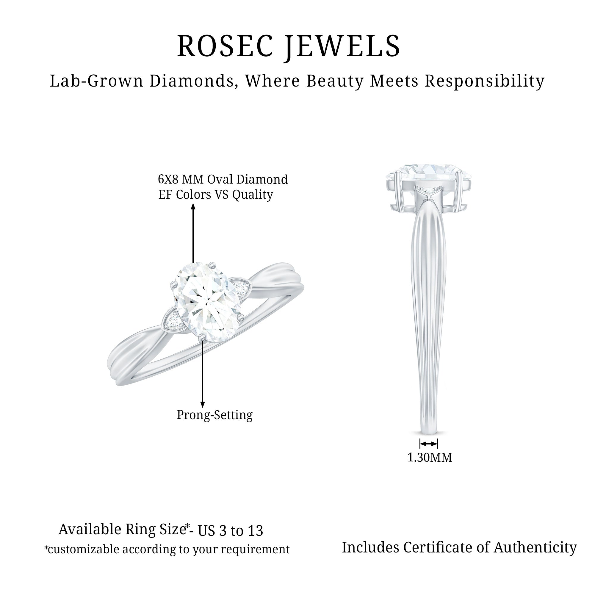 Embrace the allure of understated elegance with this exquisite solitaire ring, showcasing a captivating oval Lab Grown Diamond at its core. Complemented by smaller Lab Grown Diamonds on each side, this design exudes timeless beauty and charm. It becomes an enduring symbol of love and commitment. Perfect for the modern bride who appreciates simplicity and grace, this ring captures the essence of everlasting love.
