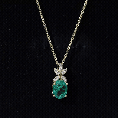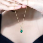 Let your love story shine through with this floral inspired Emerald Necklace. Crafted with care in 14K yellow gold plated silver, this piece brings together graceful design and meaningful detail, making it a beautiful choice for your big day, or any day you want to feel extra special. At the center of the design sits a 7X9 MM oval cut lab created emerald, secured with prong setting that allows it to gently catch the light. Above the center stone, a delicate floral motif blooms with round lab grown diamonds, adding a soft shimmer and a lovely romantic touch. The Emerald and Diamond Necklace is suspended from a polished, lightweight chain that drapes comfortably across the neckline. It is subtle enough to wear alone, yet detailed enough to stand out, especially for moments that call for something extra meaningful. Whether you are walking down the aisle, sharing a special evening, or simply dressing up for a quiet afternoon, this Emerald Flower Pendant adds a gentle glow and a touch of thoughtful elegance. Perfect as a Wedding Necklace for Bride, a gift for someone close, or a piece you treat yourself to. It comes beautifully presented in a signature jewelry box and includes a certificate of authenticity, so you can treasure it with confidence.