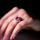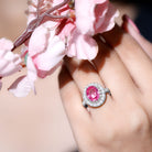 Oval Lab Grown Pink Sapphire Vintage Style Ring with Moissanite Halo