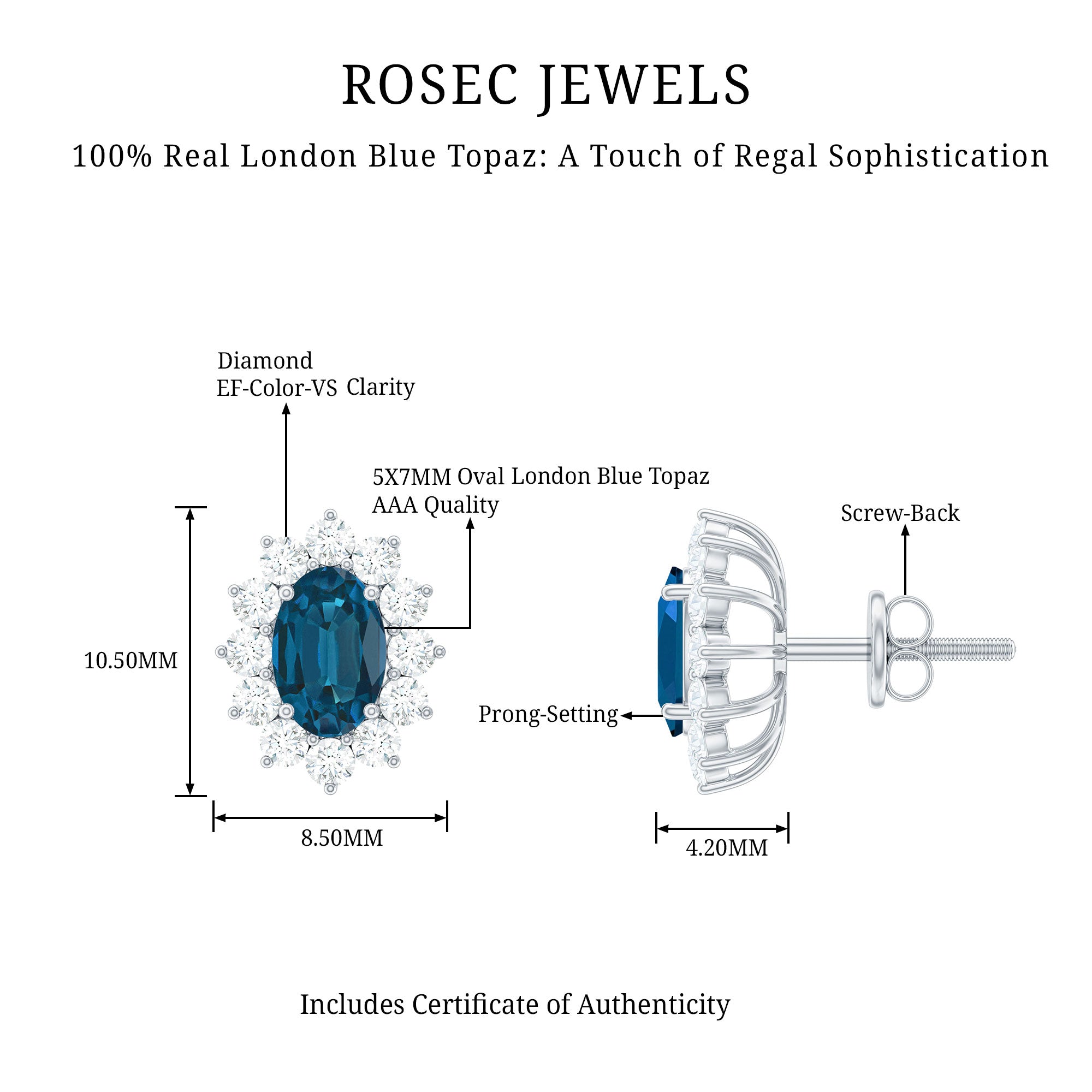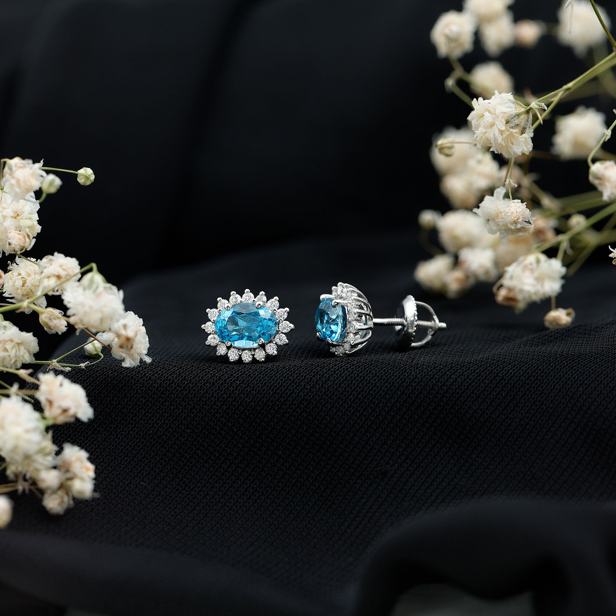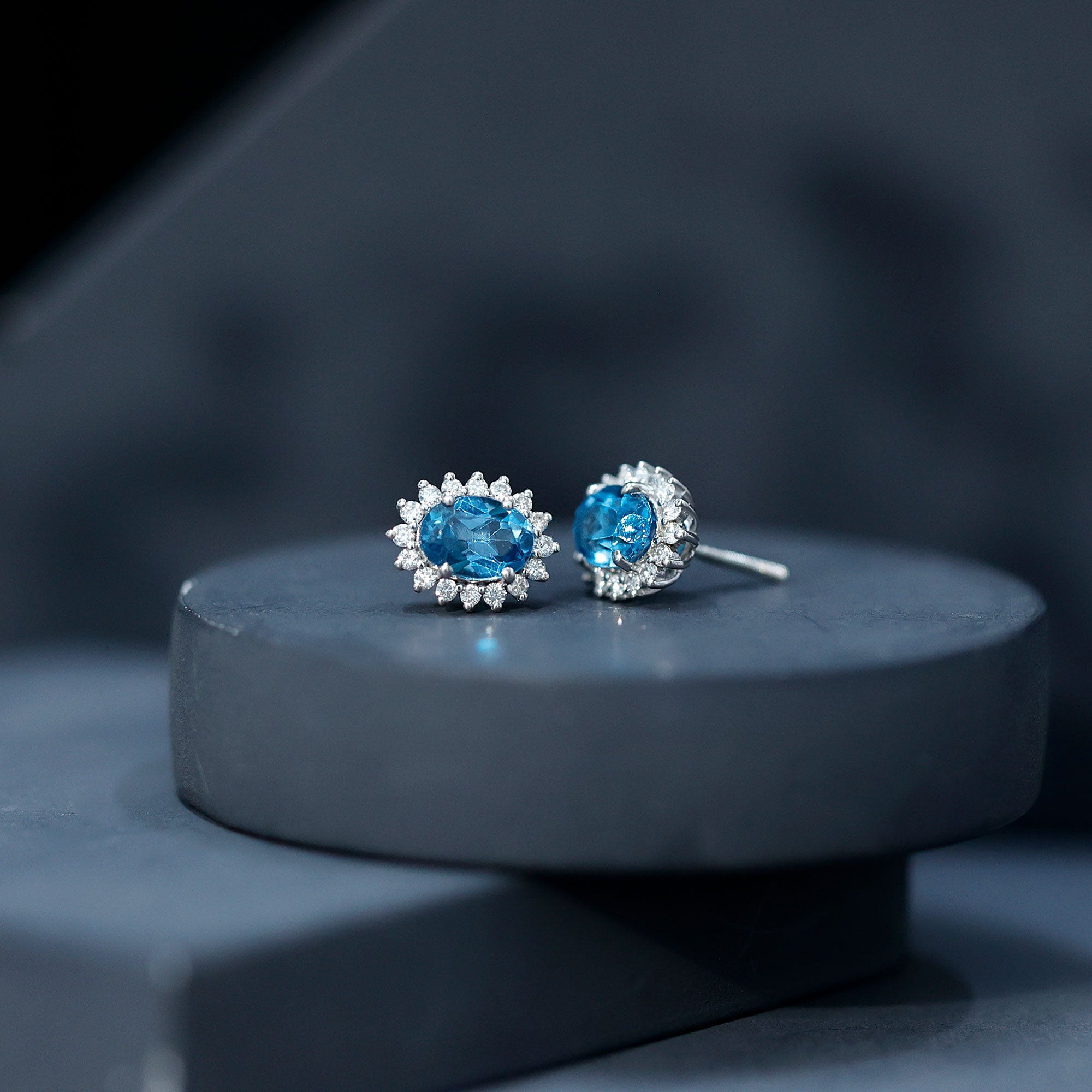 Oval London Blue Topaz Stud Earrings with Diamond Halo