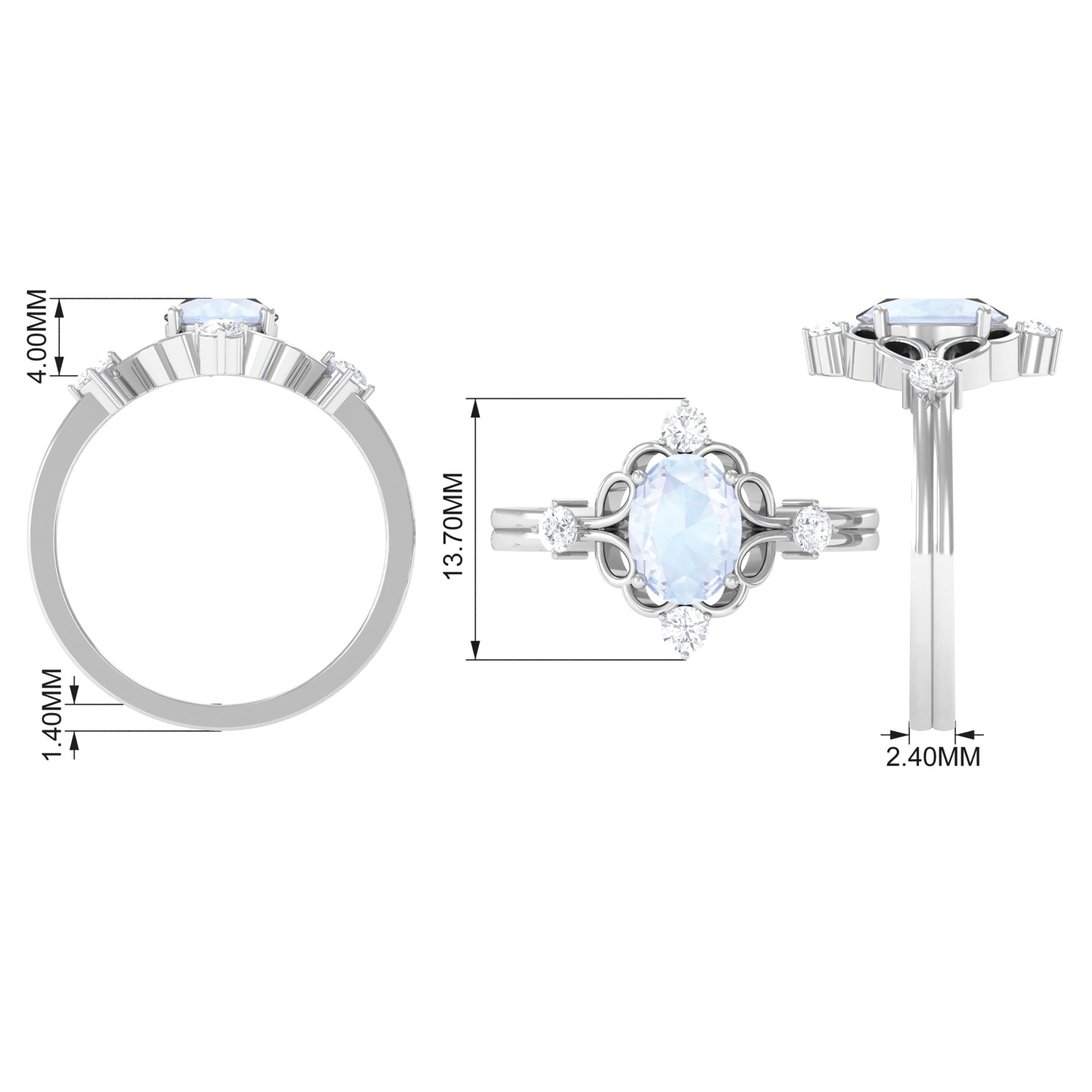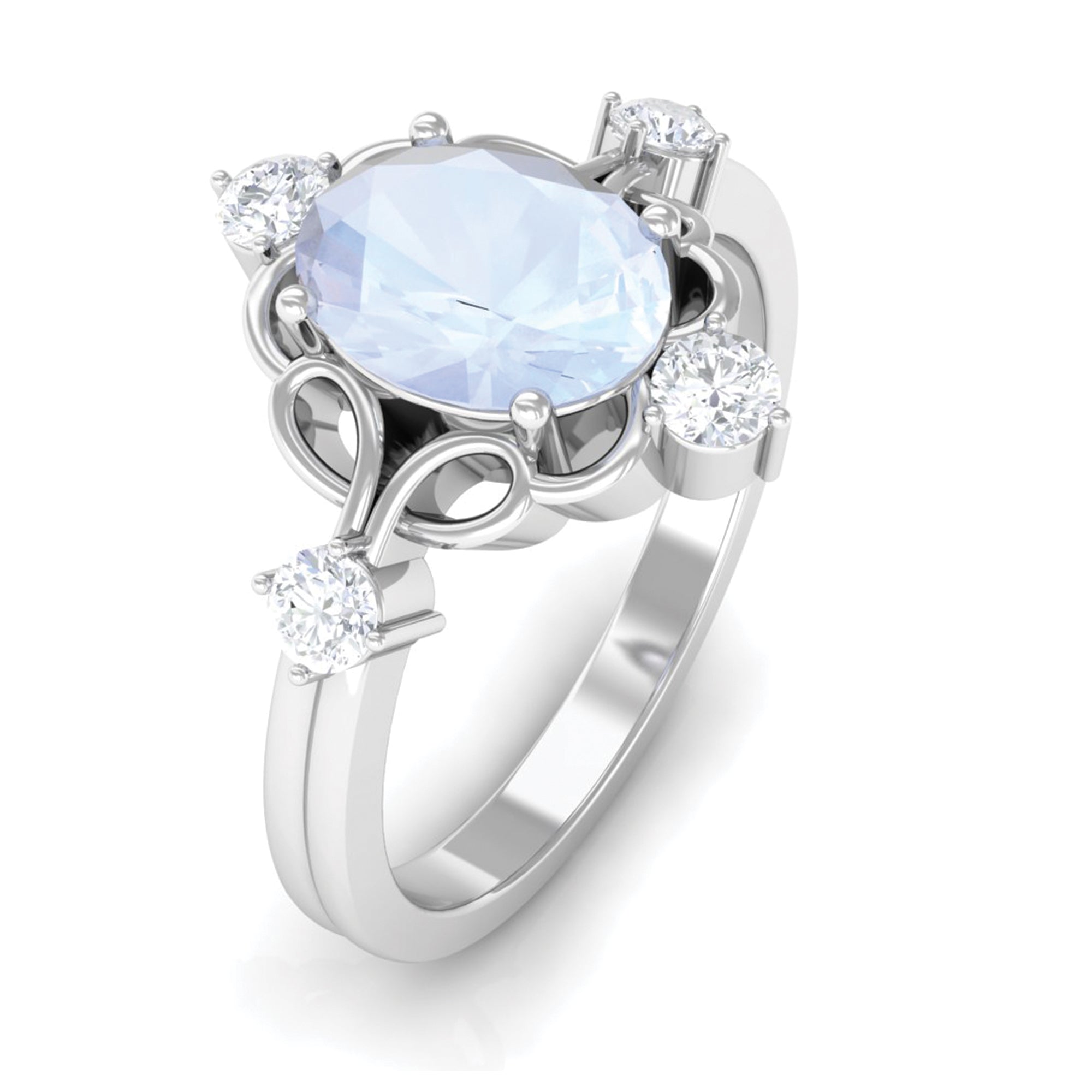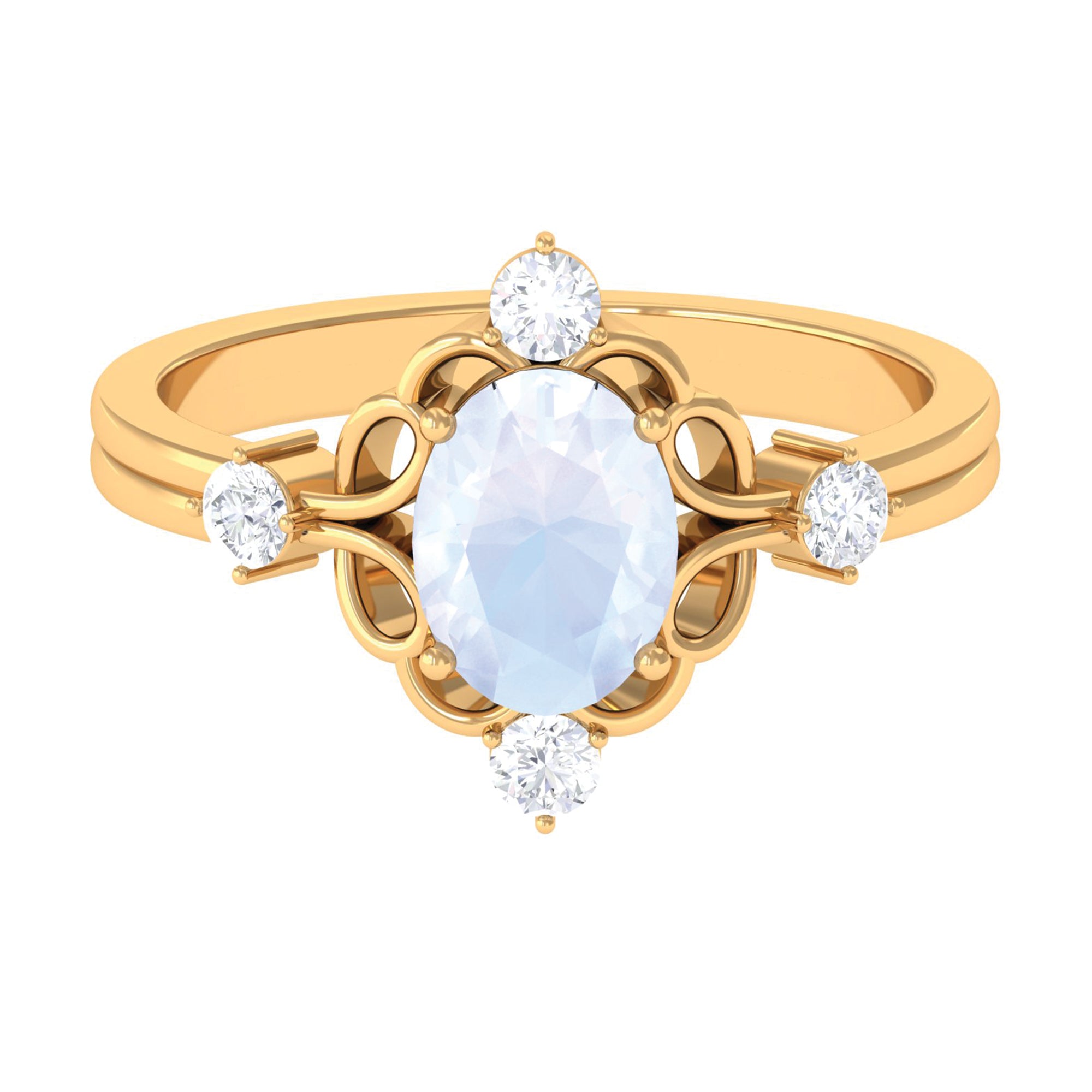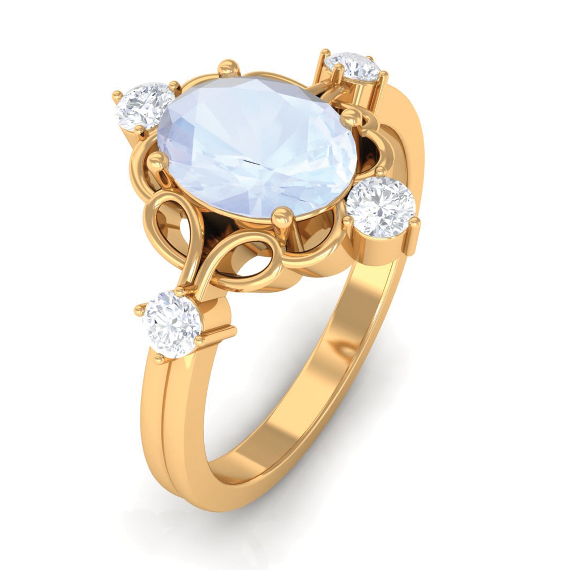 An oval moonstone sits majestically at the center of this beautifully crafted cocktail ring that exudes a surreal charm. The ornate metal detailing is accompanied with a round Diamond lends a hint of exquisiteness to this design. The center stone is prong set and draws the eye. With its luminous shank, the moonstone solitaire ring is sure to add a bit of sparkle to your look.