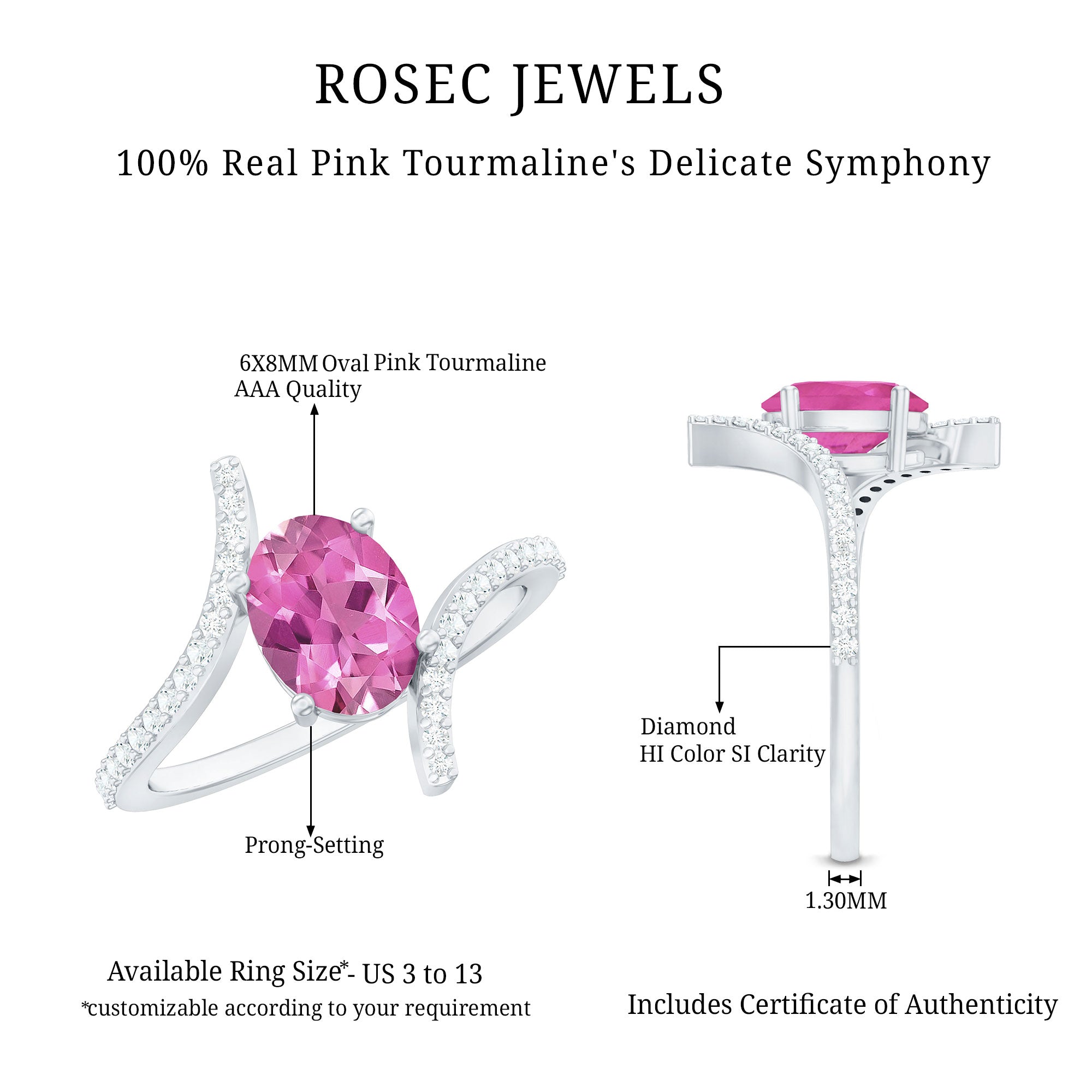 Grace your finger with our Solitaire Bypass Ring. The 6X8 MM Oval Shape Pink Tourmaline gemstone symbolizes affection and devotion, its timeless beauty amplified by the delicate embrace of the bypass design. The shimmering Diamond gemstones add a touch of sophistication to this classic solitaire ring. Meticulously crafted, it will be a radiant testament to your cherished moments and enduring love, an elegant reminder of the promises you hold dear.