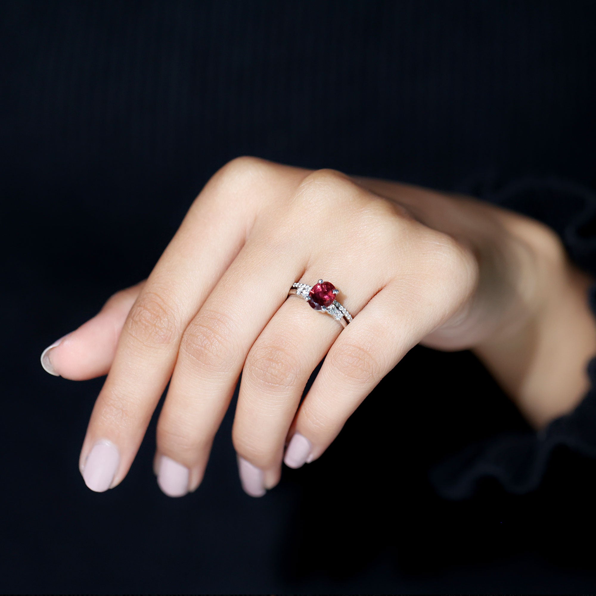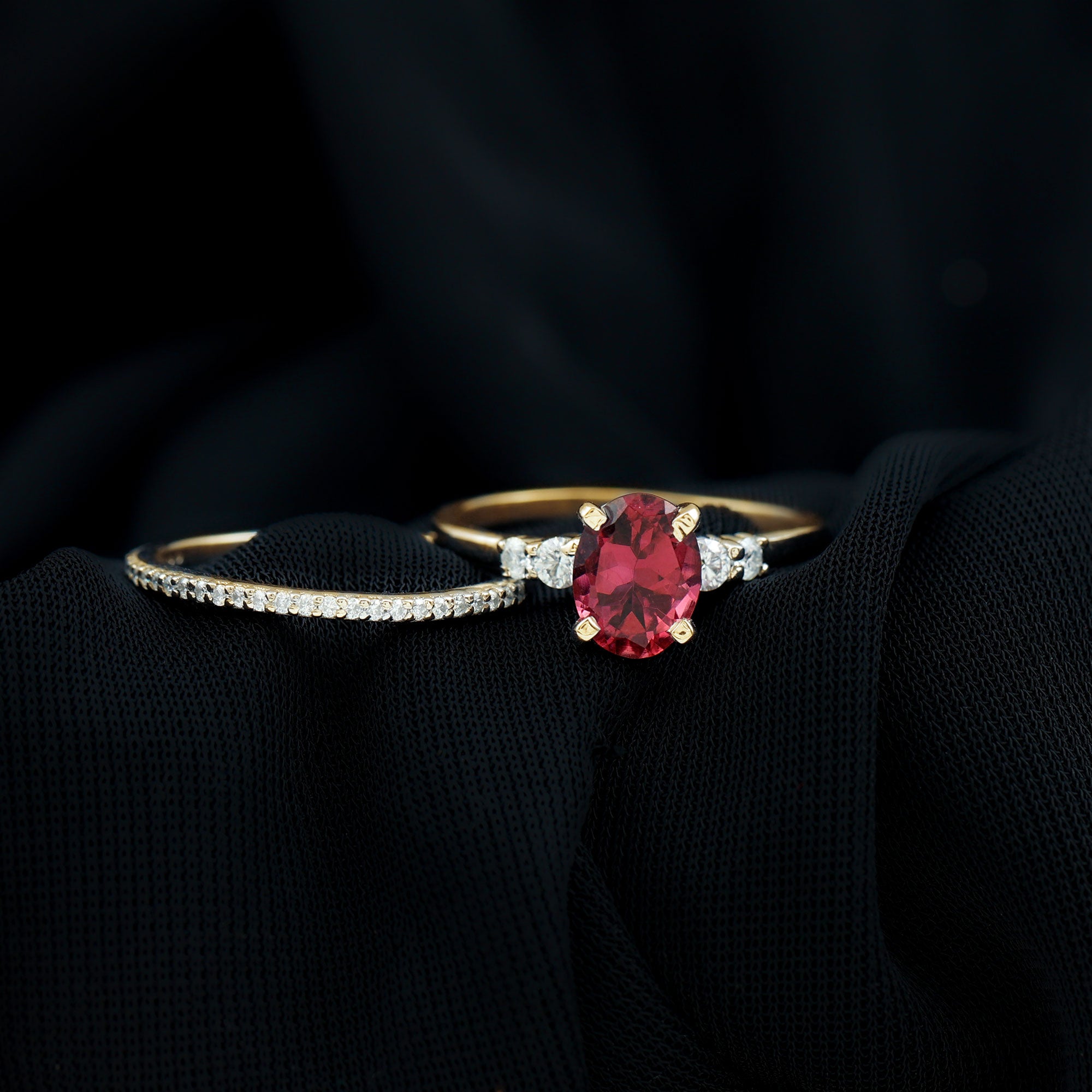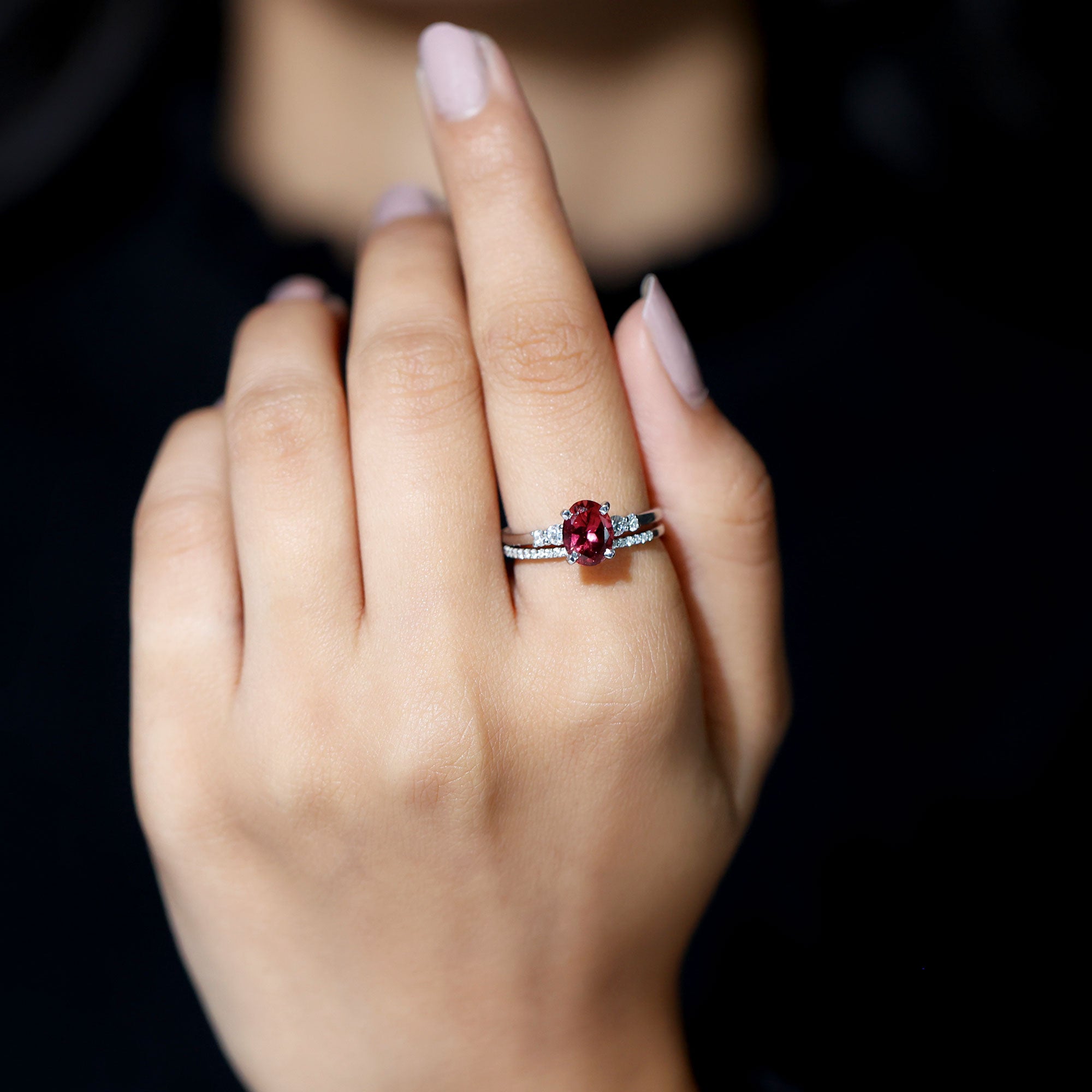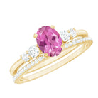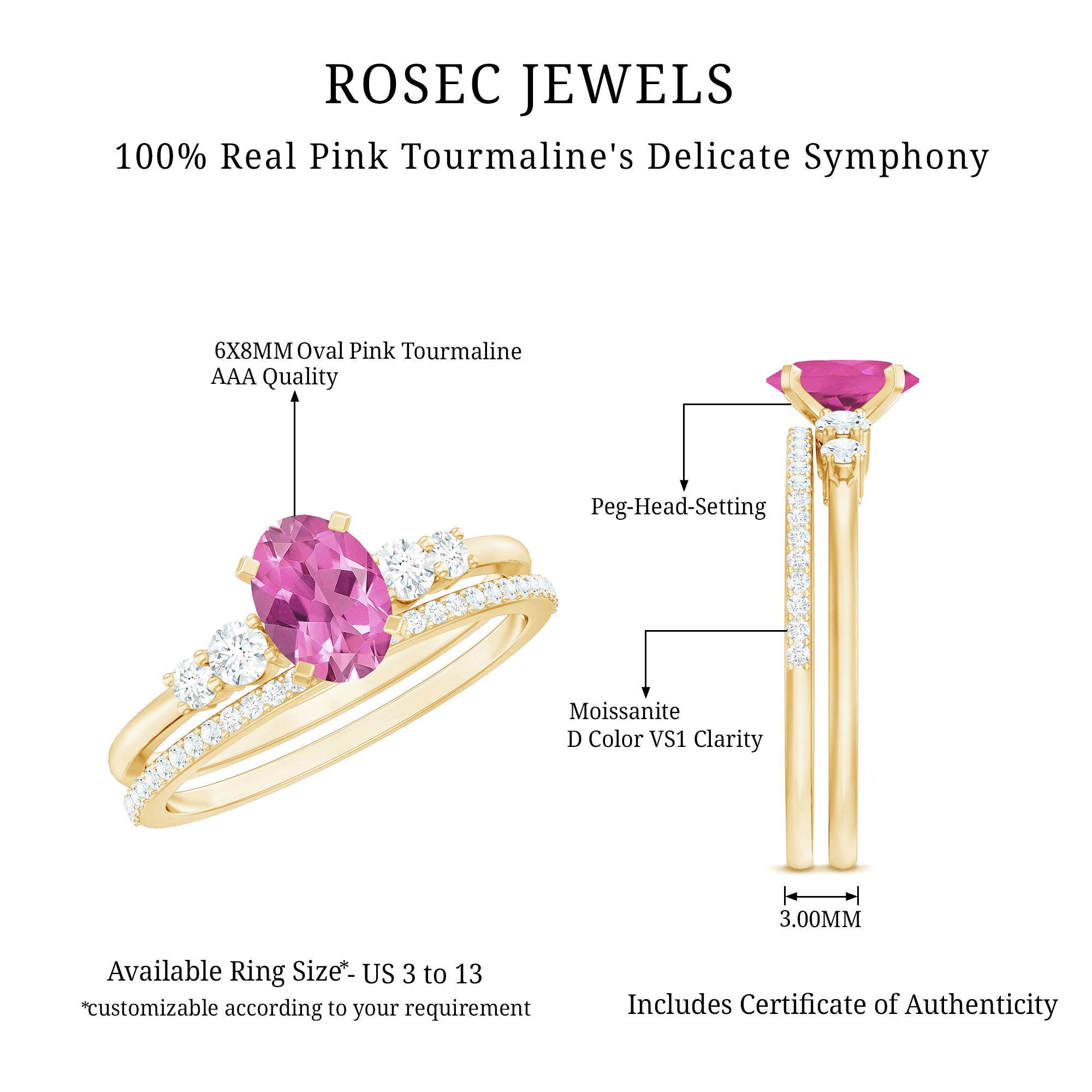 Get this alluring Solitaire Ring Set for her and make a commitment to a lifelong promise of caring, laughter, and love. Decorated with an Oval Cut Pink tourmaline secured in 4 Prong Setting while dainty Round Moissanite studded on the shank as well as on the enhancer ring. . This Pink tourmaline Ring Set will shine brighter on your special day. Make your bond stronger by giving her this Ring Set as a symbol of love.