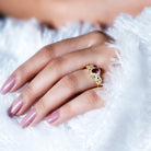 This Rhodolite Garnet Engagement Ring is designed to celebrate those special moments in the most meaningful way. Crafted in 14k yellow gold plated silver, this Designer Ring features a 4X6 MM oval shaped rhodolite at the center, held securely in prong setting. The center stone is surrounded by a sparkling round lab grown diamond halo, giving it a timeless and elegant look that never goes out of style. What makes this design truly unique is the crossover band. The shank flows in a criss cross pattern, set with more round lab grown diamonds for extra sparkle from every angle. Made with AAA quality rhodolite and EF-VS quality lab grown diamonds, this Oval Engagement Ring is perfect for someone who loves a mix of tradition and modern beauty. It’s designed for everyday elegance but also holds deeper meaning, whether you are celebrating an engagement, an anniversary, or a special milestone. Timeless, symbolic, and full of charm, this Crossover Engagement Ring is more than jewelry. It’s a piece of your story.