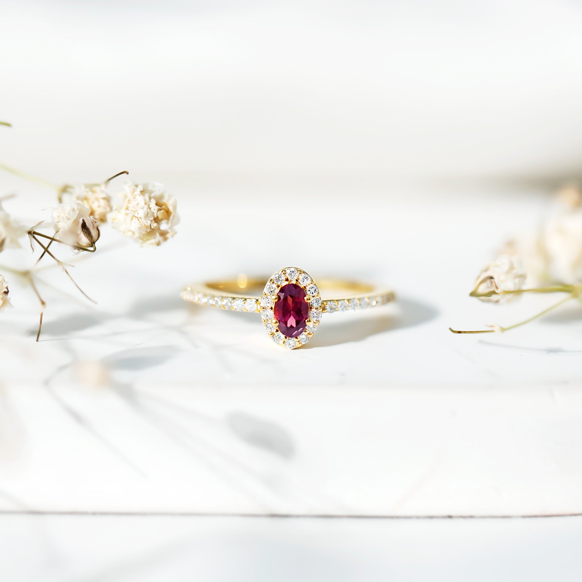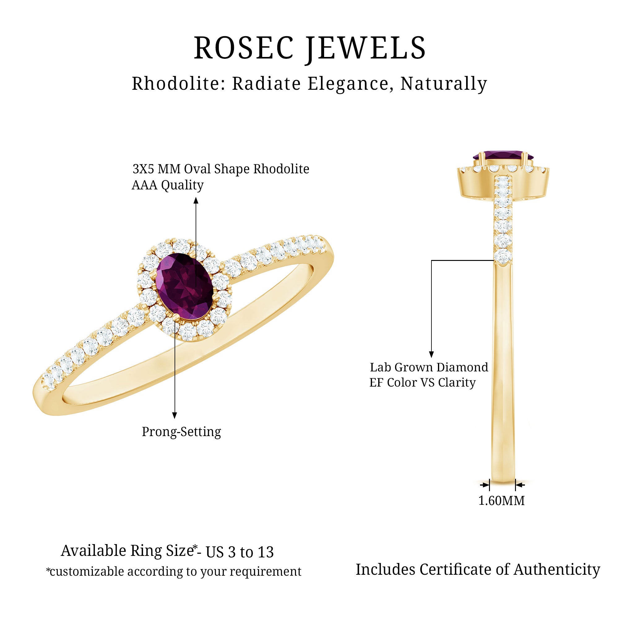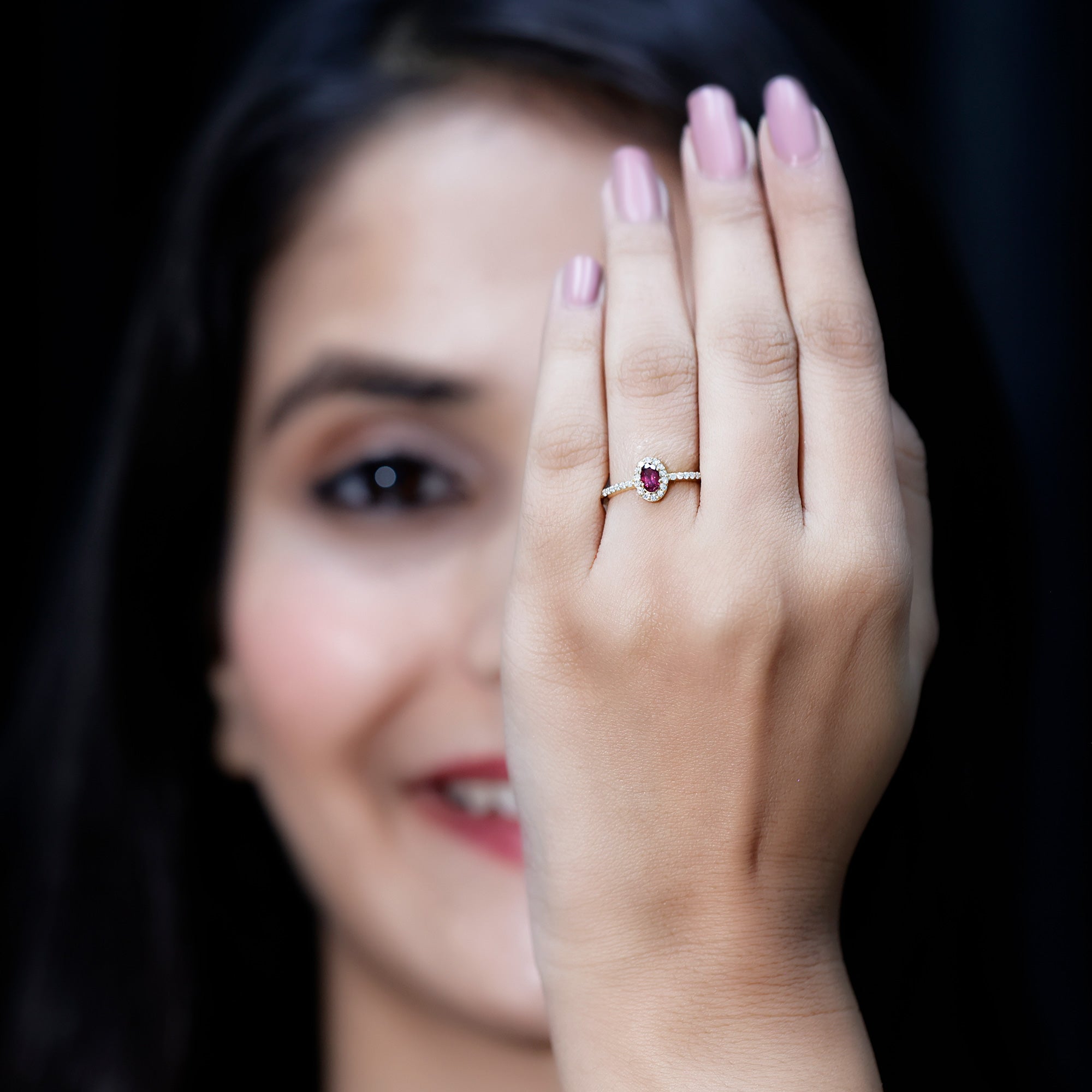 This Rhodolite Garnet Promise Ring is thoughtfully designed to celebrate love, commitment, and meaningful moments that deserve to be remembered. Set in 14k yellow gold plated silver, the Commitment Ring features a beautiful 3X5 MM oval shaped Rhodolite as the centerpiece. It is held in a secure prong setting that lets just the right amount of light shine through, adding a delicate shimmer with every move. Surrounding the center stone is a halo of sparkling lab grown diamonds, adding dimension, brilliance, and a timeless touch to this elegant piece. The diamond studded band gives it a clean finish, offering a modern take on a classic silhouette. This Halo Ring is perfect for anyone who loves fine details and a bit of glam without going too bold. Whether you are marking a relationship milestone or simply showing someone how much they mean to you, this Oval Shaped Ring does the talking beautifully. This Rhodolite Garnet and Diamond Ring comes with a certificate of authenticity and is beautifully packaged in a premium jewelry box, ready to be gifted or treasured.