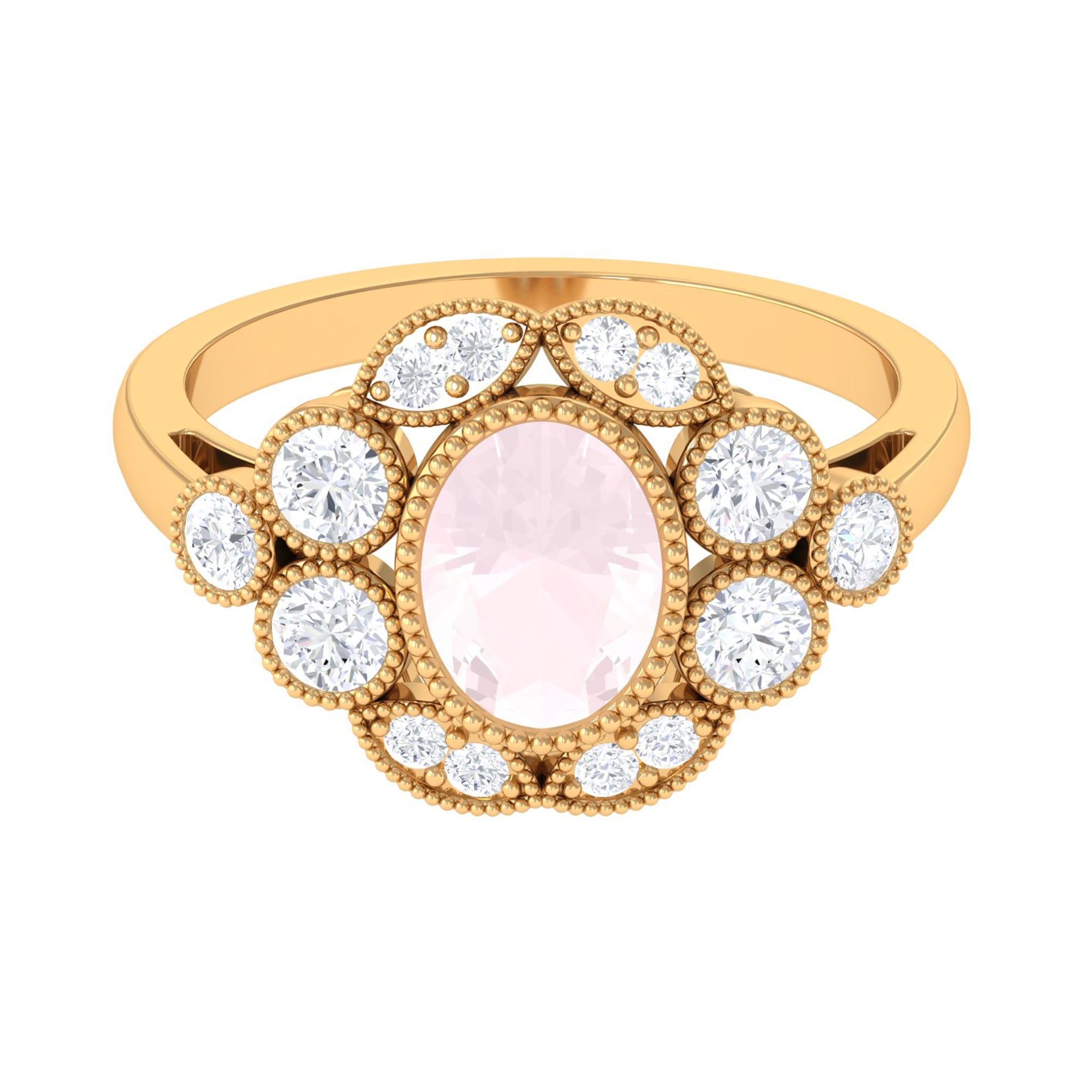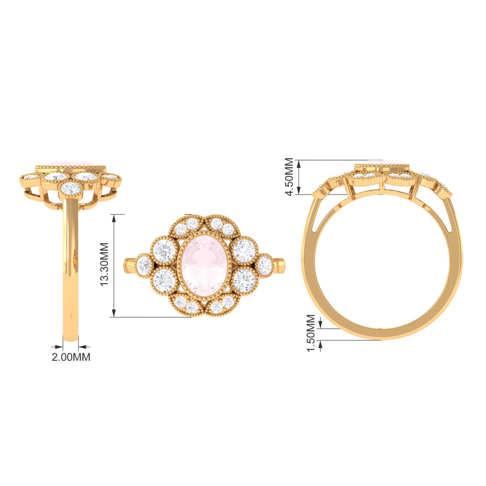 Make a grand and unforgettable statement of your love with this breathtaking Statement Engagement Ring. Featuring a dazzling Oval Cut Rose Quartz at the center, surrounded by a halo of shimmering Round Moissanite stones, this ring is an enchanting piece of fine jewelry that will leave your lady overwhelmed. The Gold Beaded Details of the ring add a touch of elegance and sophistication, making it even more exquisite and beautiful. Give this extraordinary Oval Rose Quartz Ring to your special someone and let her know just how much she means to you.