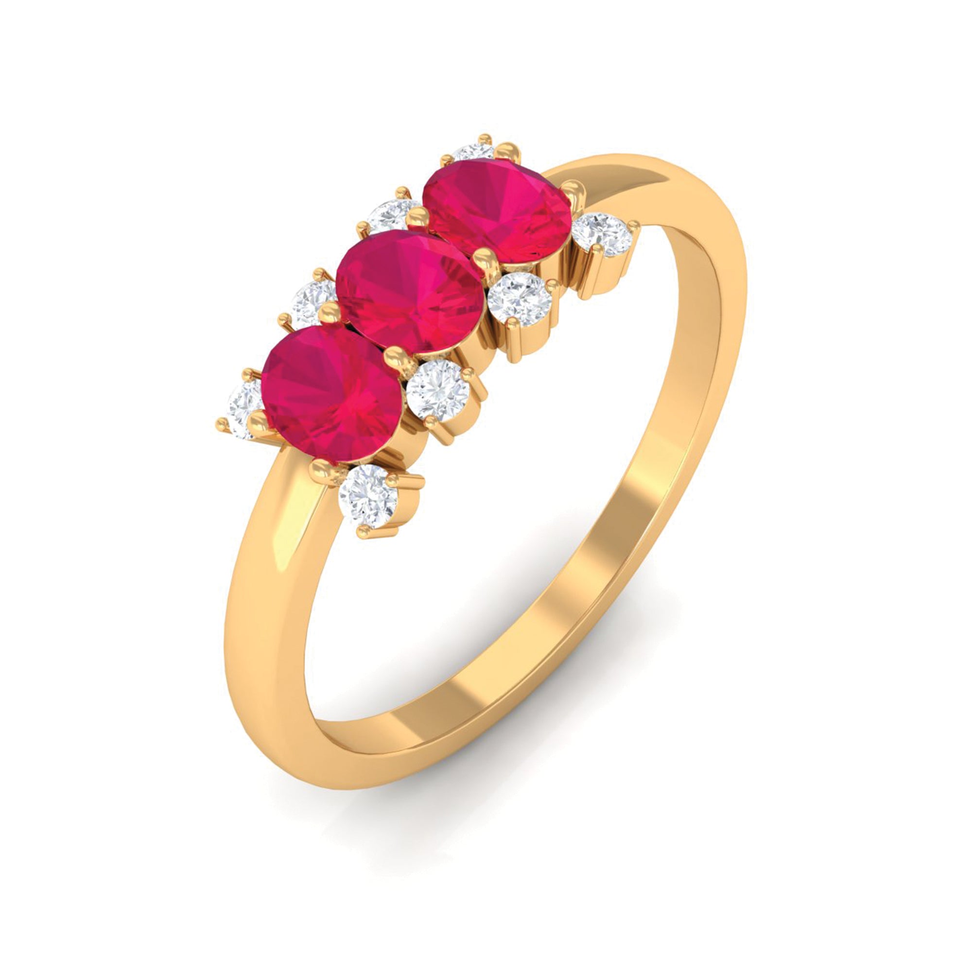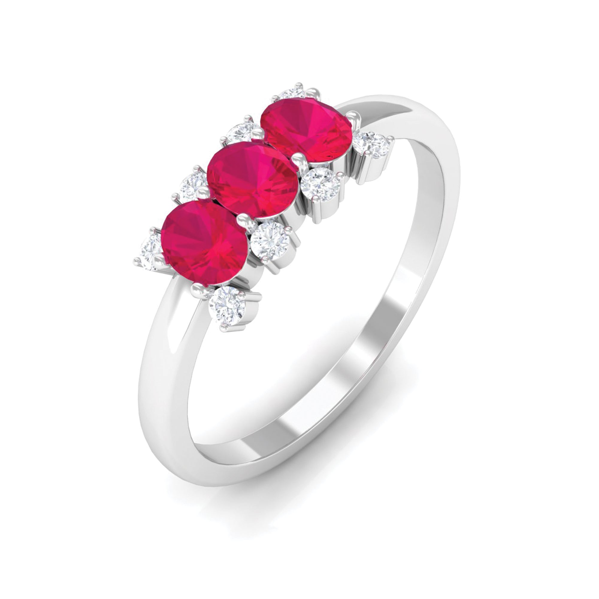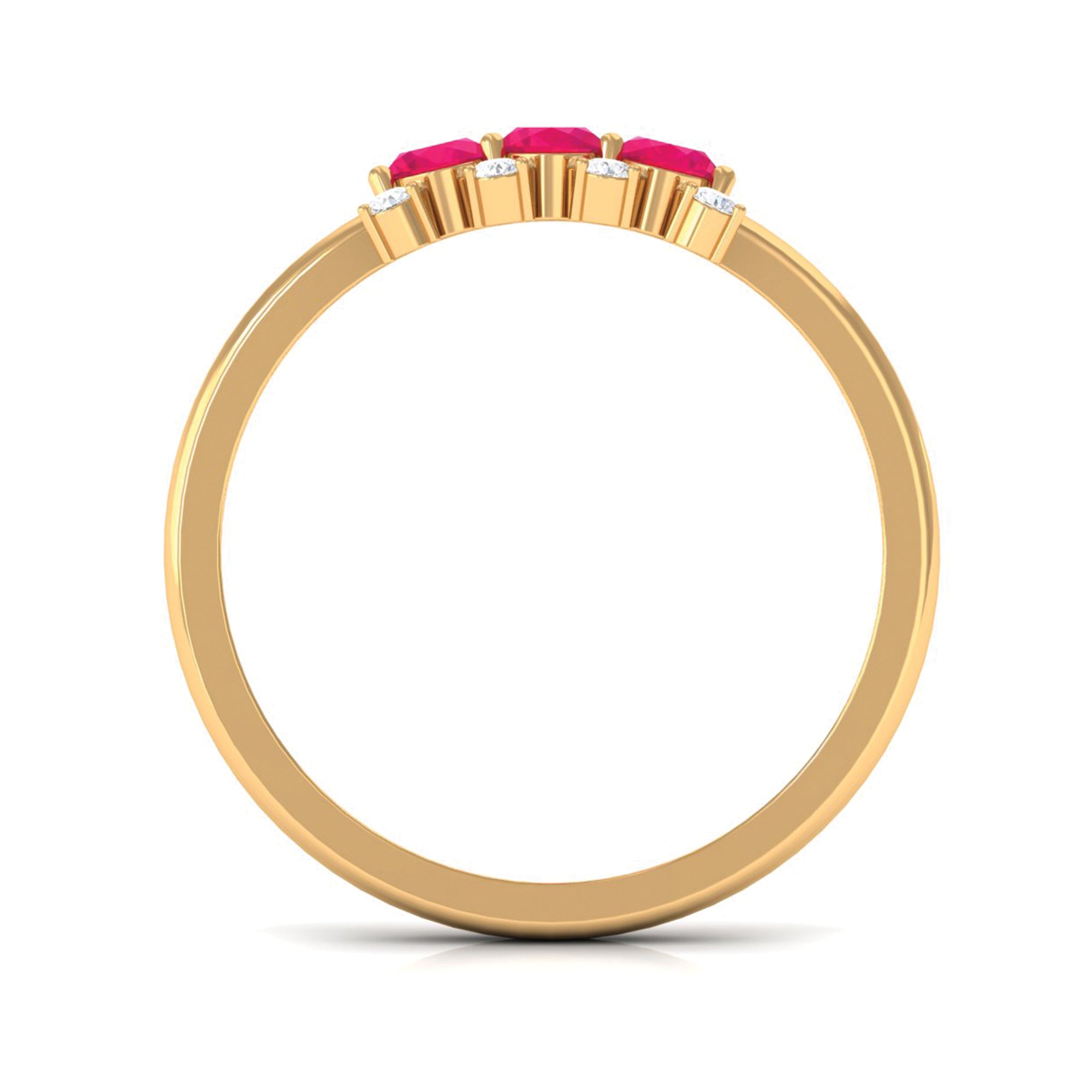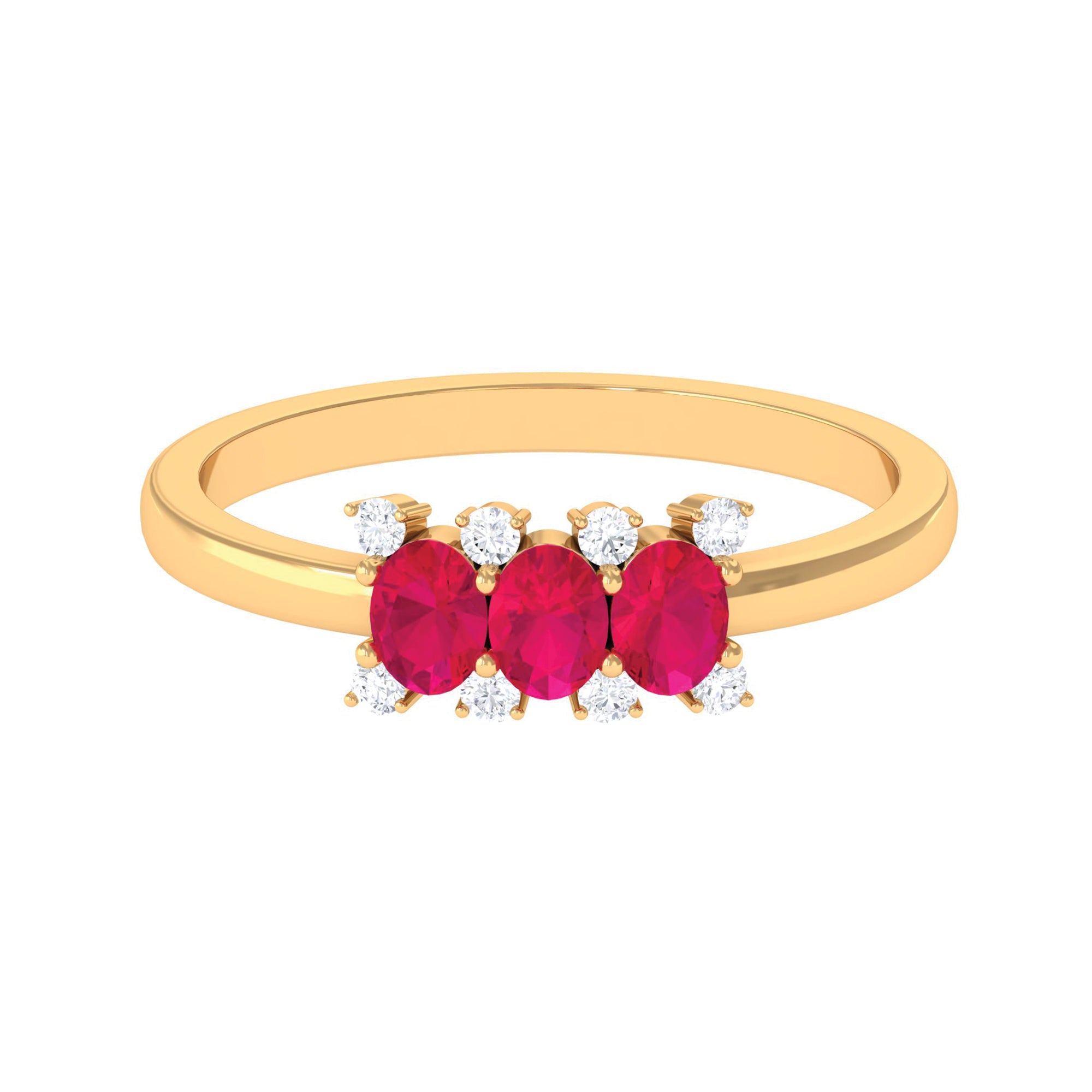 Make your love go forever with this Three Stone Promise Ring for a woman. This Three Stone Ring is consisting of Oval Shape Ruby and Round Diamond set in a prong setting.