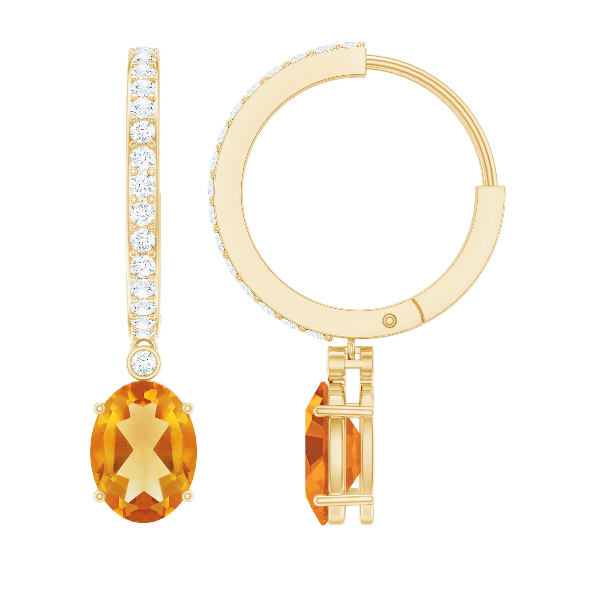 Radiate warmth and elegance with these November Birthstone Drop Earrings. These exquisite earrings capture the essence of 6X8 MM Oval Shape Citrine gemstone set in Prong Setting suspended from a Diamond Hinged Hoop. As the brightening hues of Citrine harmonize with the shimmering Diamond gemstones, these earrings celebrates your unique birth month with timeless style and charm. Elevate your look and spirit with this radiant pair.