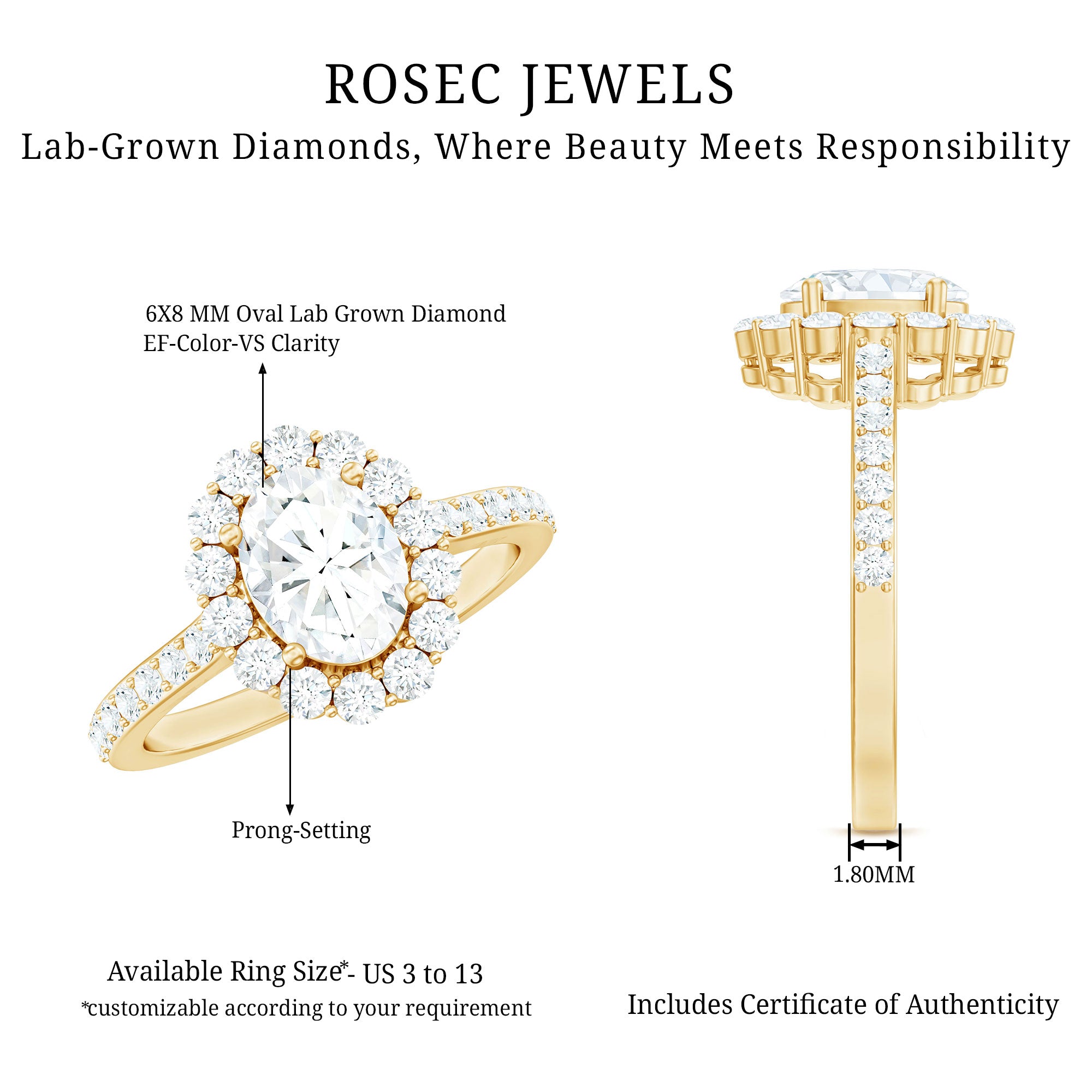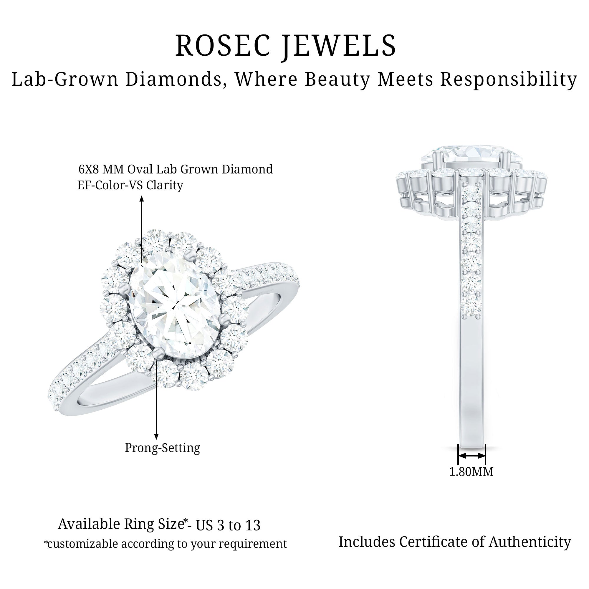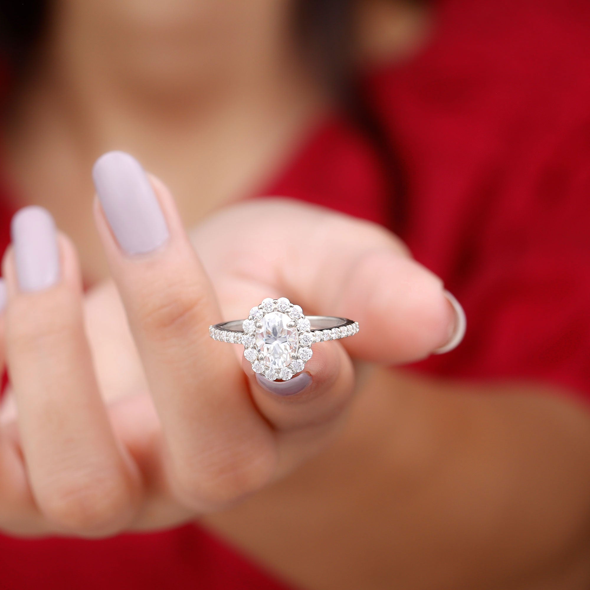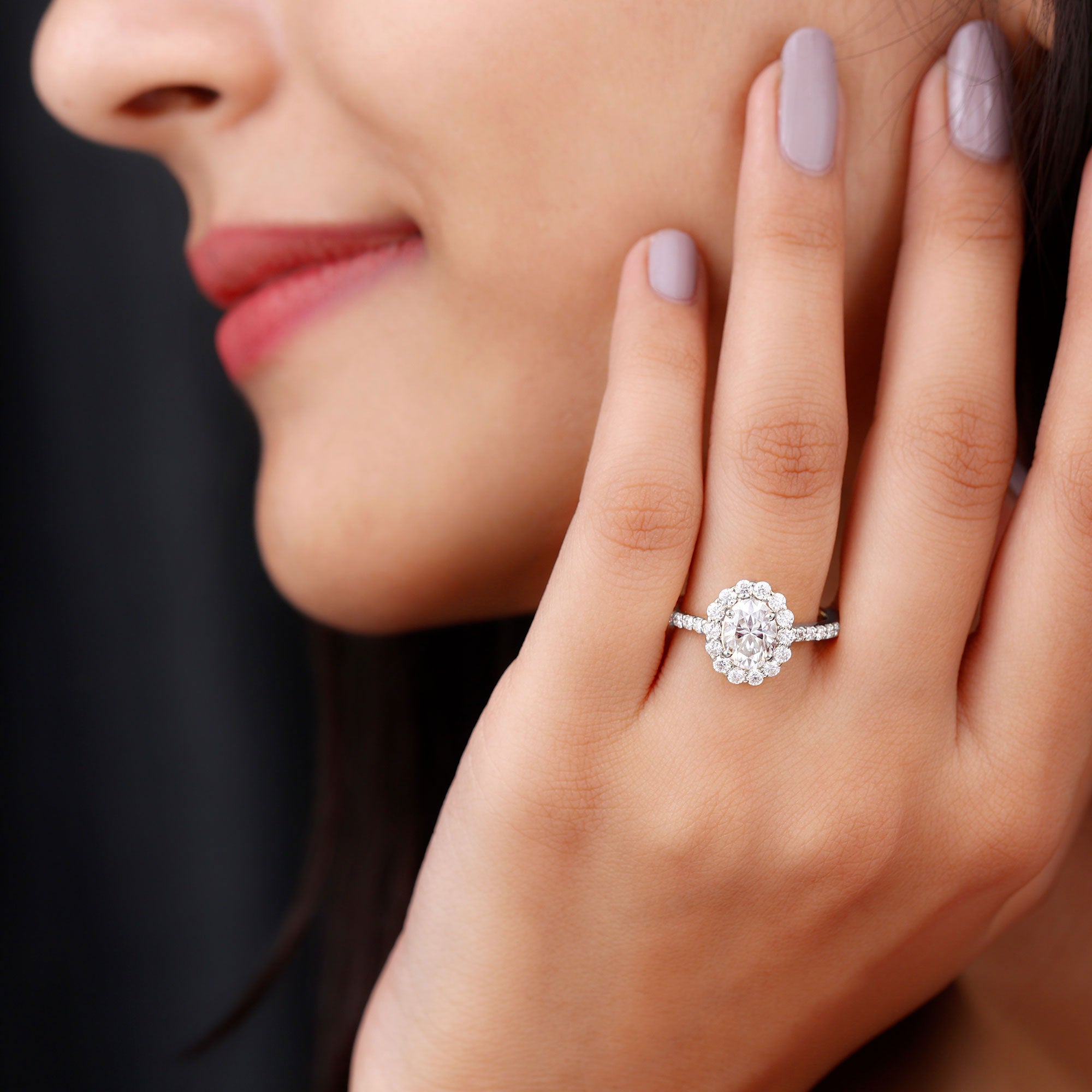 Leave your better half in awe with this Halo Engagement Ring. It boasts an exquisite Oval Shape Lab Grown Diamond, securely cradled in a Prong Setting, with additional Round Lab Grown Diamonds encircling it as a radiant halo and adorning the sides in a prong setting. This Lab Grown Diamond Engagement Ring is a testament to your love, making it the perfect choice for special events, especially those where you want to make a lasting impression.