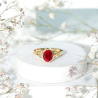 Indulge in the enchanting appeal of our Solitaire Ring, a remarkable jewelry piece that seamlessly blends classic elegance with the Celtic design. The vibrant Created Ruby center stone, fashioned in a unique and timeless Oval shape set in bezel setting, is gracefully complemented by an intricate Celtic knot pattern.
