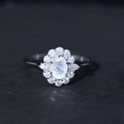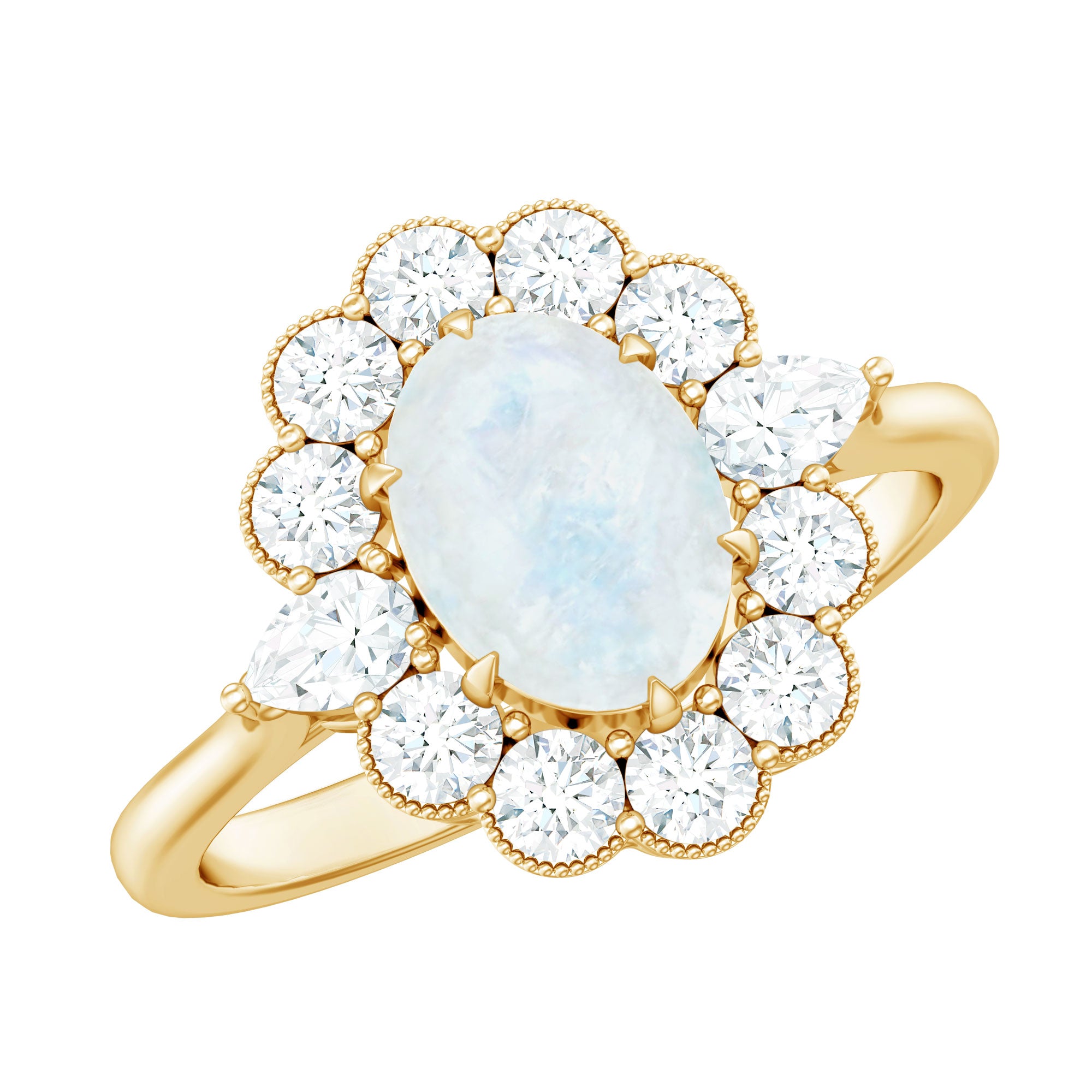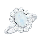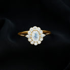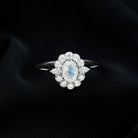 Embrace her bridal ensemble with our Statement Ring, adorned with oval-shaped moonstone in the center wrapped in a halo frame of moissanite exuding a radiant sparkle and brilliance. The exquisite placement of these gemstones embraced by the milgrain design around it makes this Moonstone Ring brilliant. Get this Halo Ring to illuminate your special moments and make them unforgettable.