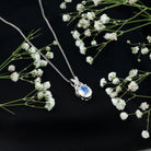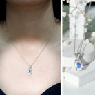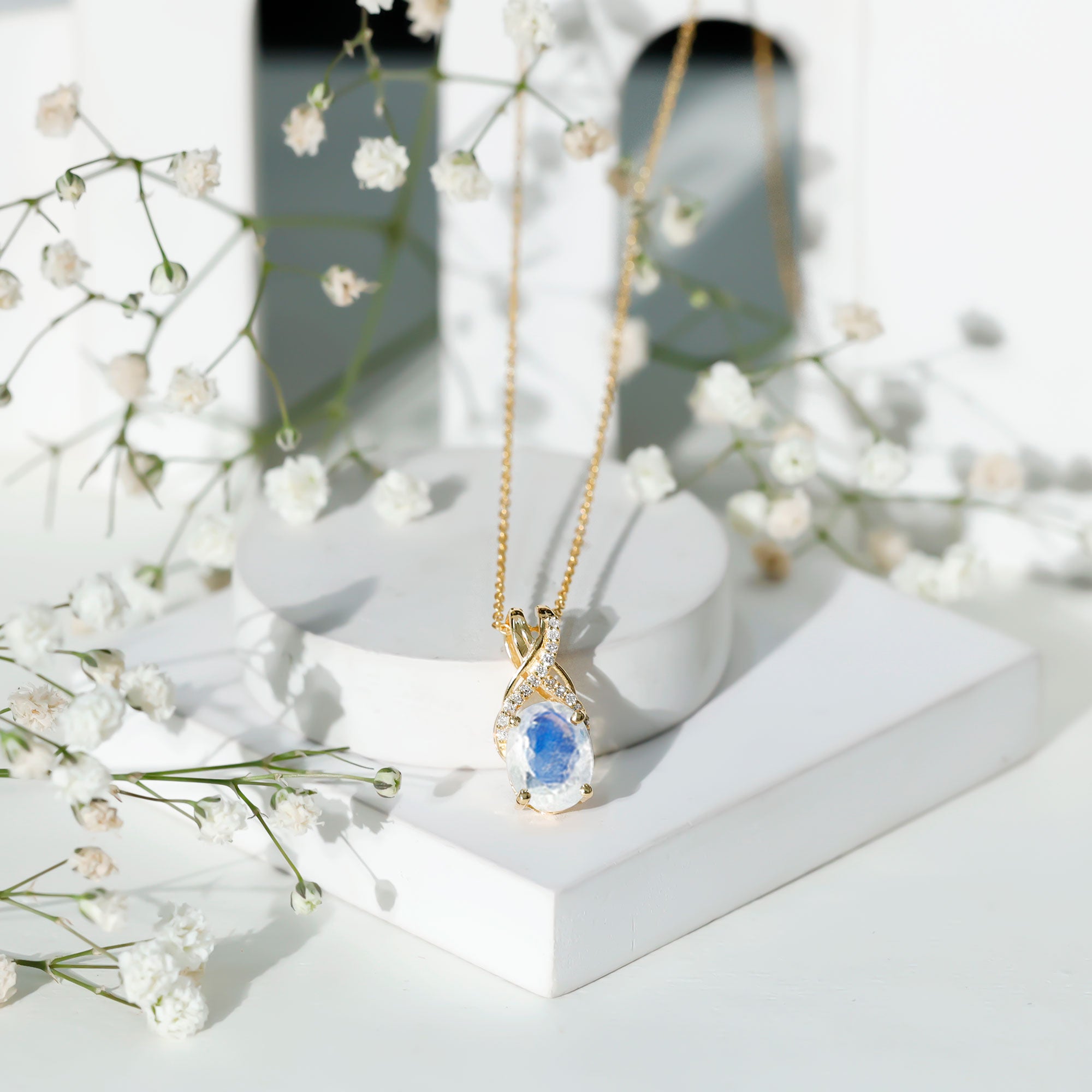 A fascinatingly beautiful oval moonstone hangs from a twisted bale in this gorgeous pendant necklace. For a bit of drama and sparkle, the twisted metal strip is partially dotted with round Diamond, that radiates brightly against the scintillating hue of the moonstone. Secured in a prong setting, the necklace pendant makes an exquisite present for June born women because it represents a deep meaning.