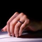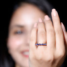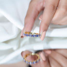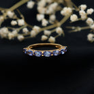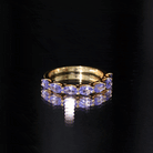 A timeless and regal symbol of affection, our Tanzanite Eternity Ring is truly captivating. The band features a continuous array of Oval Shape Tanzanite gems, delicately held in place by a Shared Prong Setting, introducing a vibrant and playful splash of purple halfway around the ring. Whether worn individually or stacked with other cherished pieces, this East West Ring shines brilliantly in its unique design.