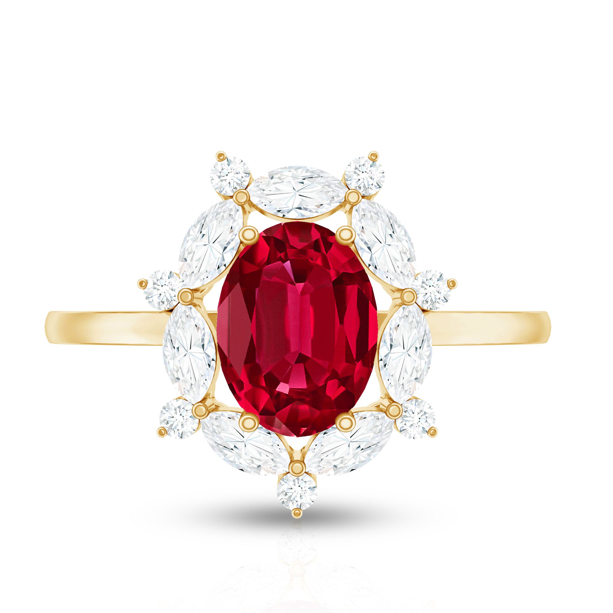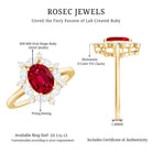 Turn heads with this stunning Lab Grown Ruby Engagement Ring, designed for those who love bold and elegant jewelry. At its center is a beautiful 6X8 MM oval shaped lab grown ruby, securely set in prong setting to highlight its deep red color and sparkle. Surrounding the ruby is a halo of dazzling marquise and round cut moissanite stones, adding brilliance and a touch of glamour to the design. The AAAA quality lab grown ruby pairs perfectly with the sparkling D-VS1 quality moissanite, creating a striking contrast that makes this Halo Engagement Ring truly stand out. Each stone is carefully set to reflect light beautifully, giving the Ruby Cocktail Ring a radiant and luxurious appearance from every angle. This Statement Ring for Women combines classic charm with modern elegance, making it perfect for engagements, special occasions, or as a statement piece. Its detailed craftsmanship and vibrant colors ensure it will catch attention and be admired for years to come.
