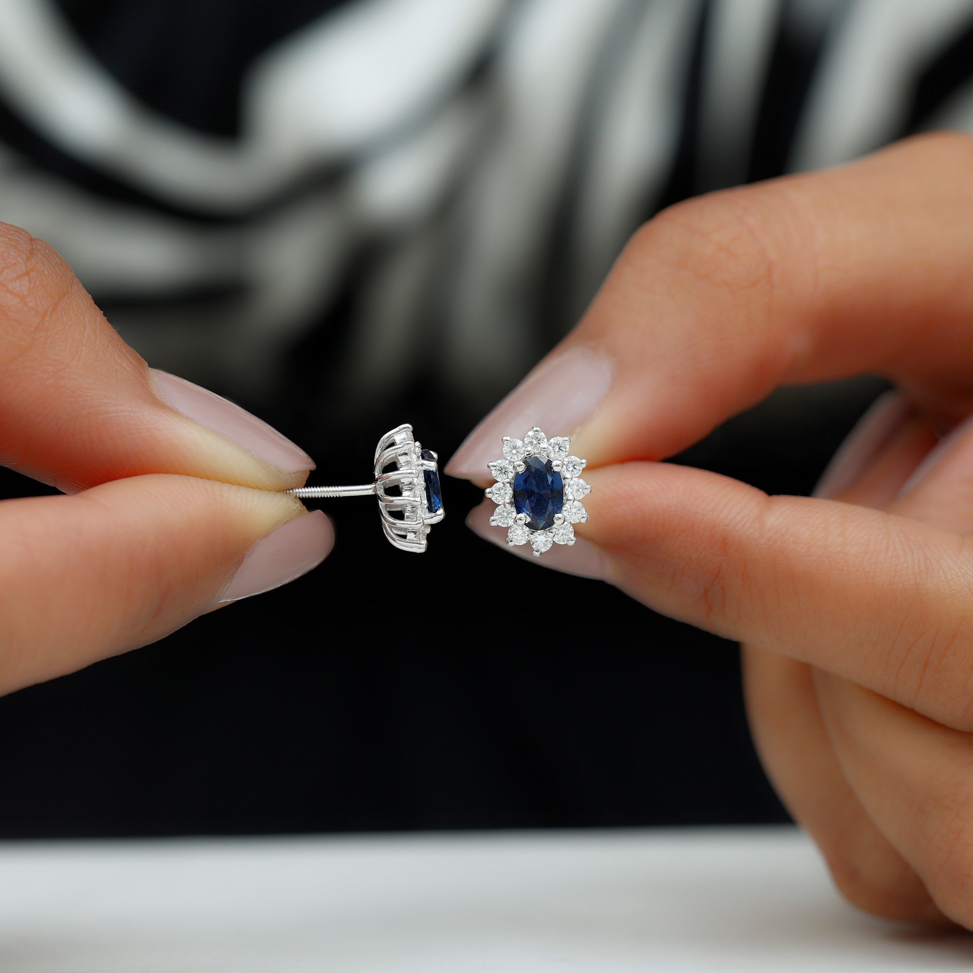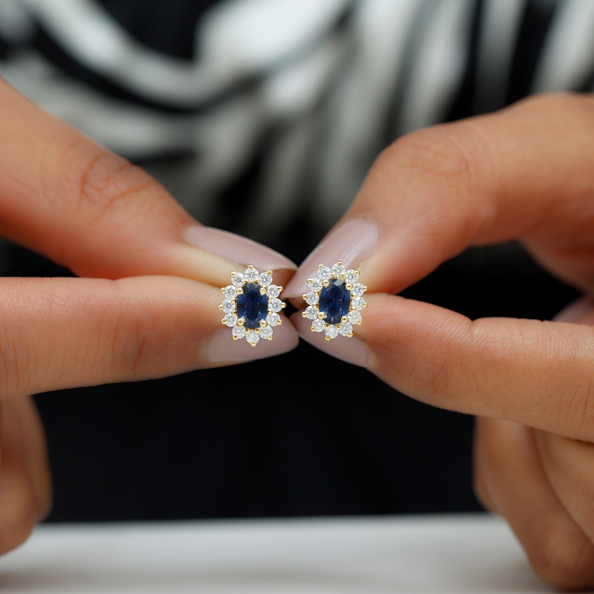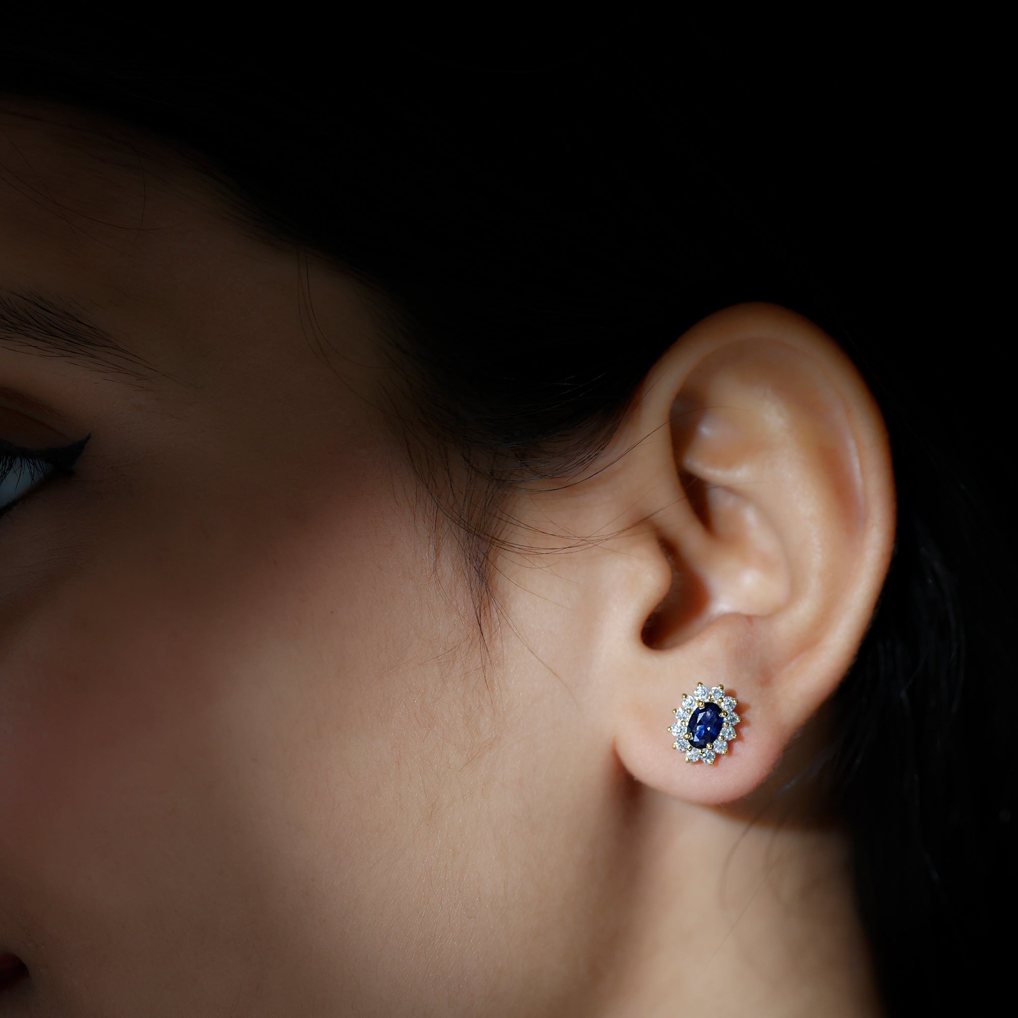 Step into effortless elegance with these stunning Blue Sapphire Stud Earrings, crafted to catch the light from every angle. These Halo Earrings feature a beautiful oval cut 4X6 MM lab created blue sapphire set securely in prong setting, surrounded by a sparkling halo of round brilliant cut real diamonds. Designed with everyday wear in mind, these Sapphire and Diamond Earrings balance sophistication and simplicity perfectly. The AAAA quality lab created sapphires pair seamlessly with HI-SI quality diamonds, creating a refined contrast that adds a touch of luxury to any outfit. The screw back closure ensures they stay comfortably in place all day, whether you are heading to a special event or just elevating your daily look. The elegant design is versatile enough to complement both casual and formal attire, making these Oval Stud Earrings a wardrobe staple that effortlessly adds sparkle and style. Thoughtfully curated, they also make a meaningful gift for anniversaries, birthdays, or any moment worth celebrating. With their mix of timeless design, modern flair, and high quality gemstones, these Blue Sapphire and Diamond Stud Earrings are a perfect way to express elegance and confidence.