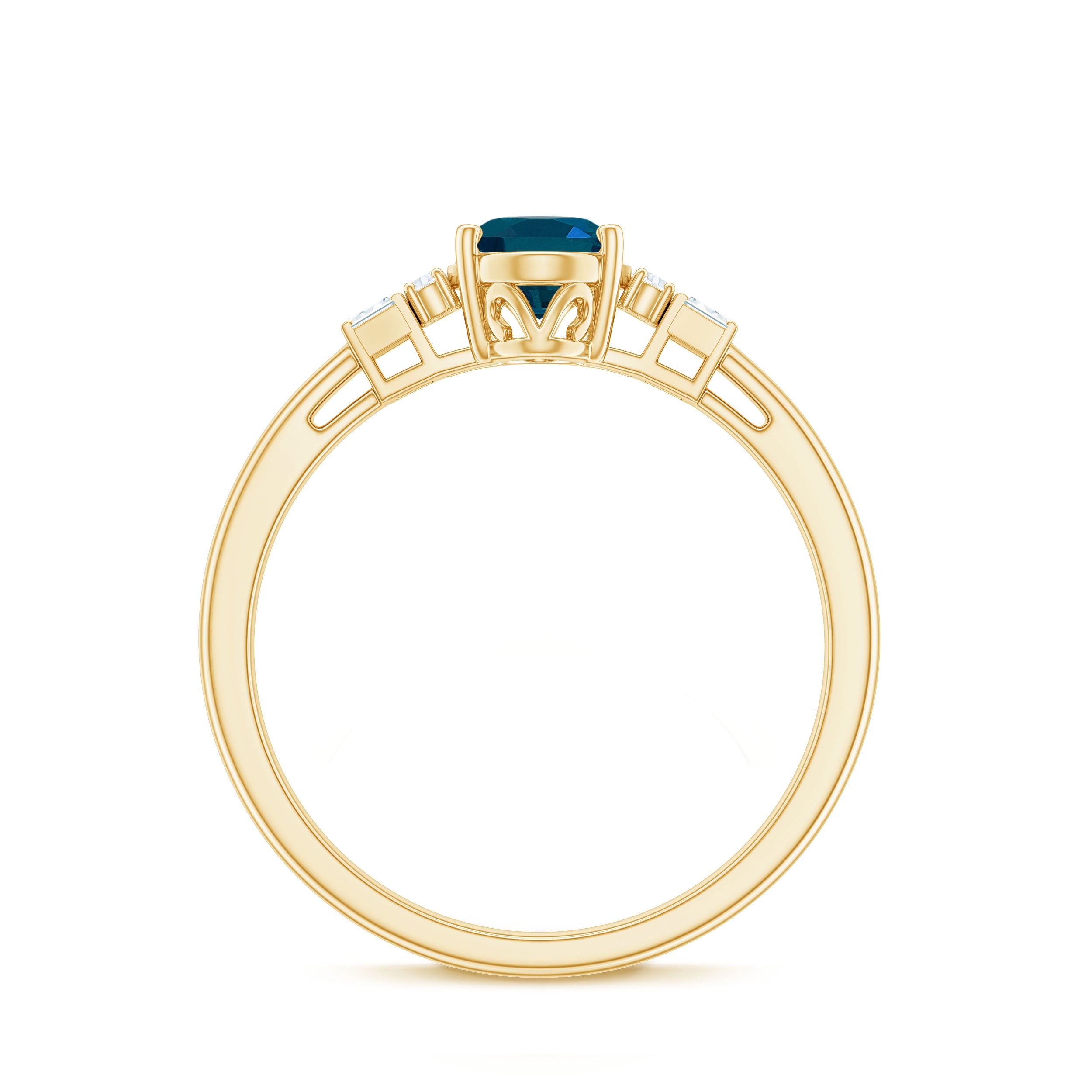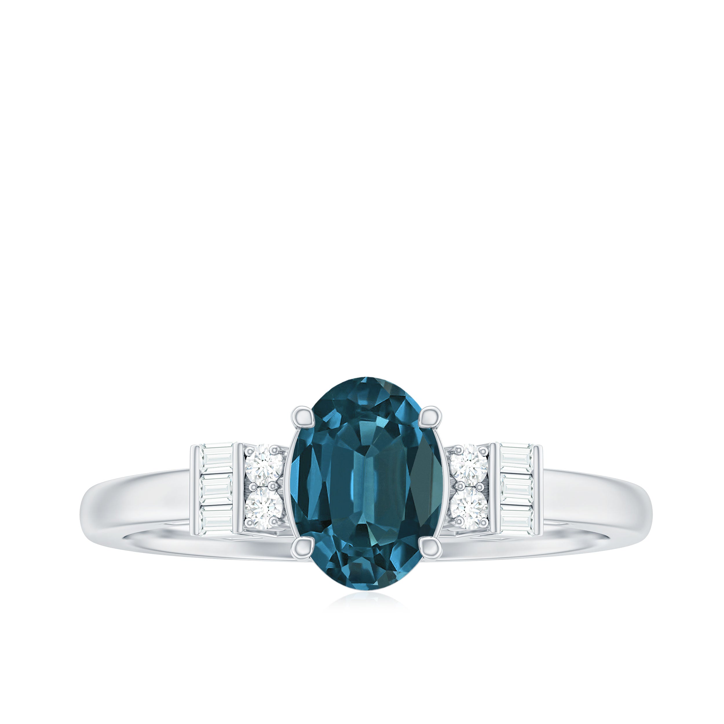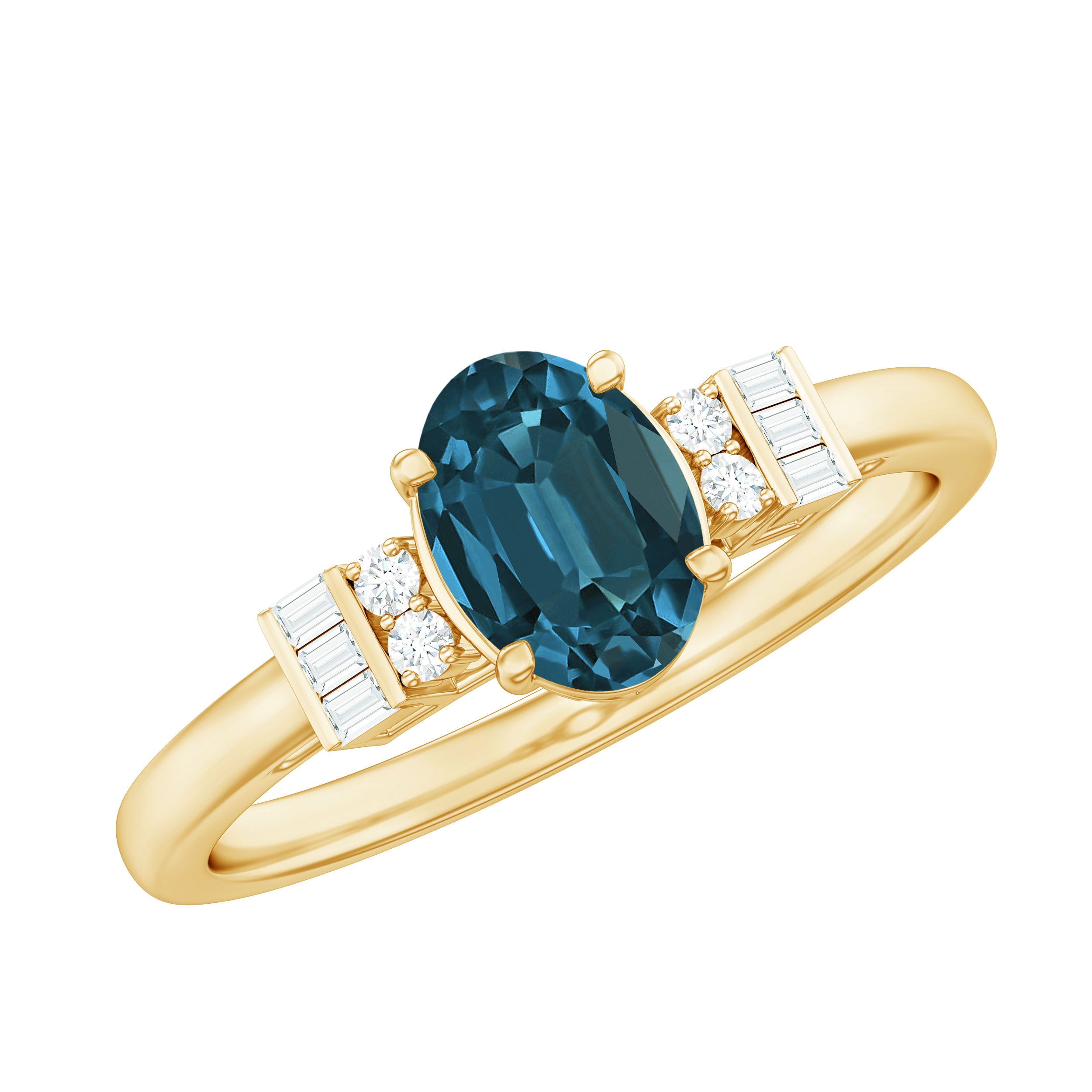 This exquisite London Blue Topaz Engagement Ring is crafted to ensure that your significant moment is truly memorable. At the heart of this Classic Engagement Ring lies a dazzling 6X8 MM oval-shaped London Blue Topaz, elegantly set in a prong setting. Enhancing the beauty of this ring are the diamond side stones. Flanking the central london blue topaz, you will discover a blend of round and baguette cut Diamond stones. Collectively, they form a stunning design that radiates additional brilliance, captivating the eye from every perspective. The sleek and polished band provides the Oval Engagement Ring with a tidy and comfortable fit, ideal for daily wear. Every aspect of this Oval Blue Topaz Ring has been meticulously crafted to ensure its uniqueness, from the harmonious setting to the exquisite arrangement of side stones. It serves as a beautiful tribute to your love and the beginning of your journey together. Whether you are preparing for a proposal or selecting the perfect ring as a couple, this Oblong Engagement Ring is a significant and sophisticated choice that will be cherished for a lifetime.