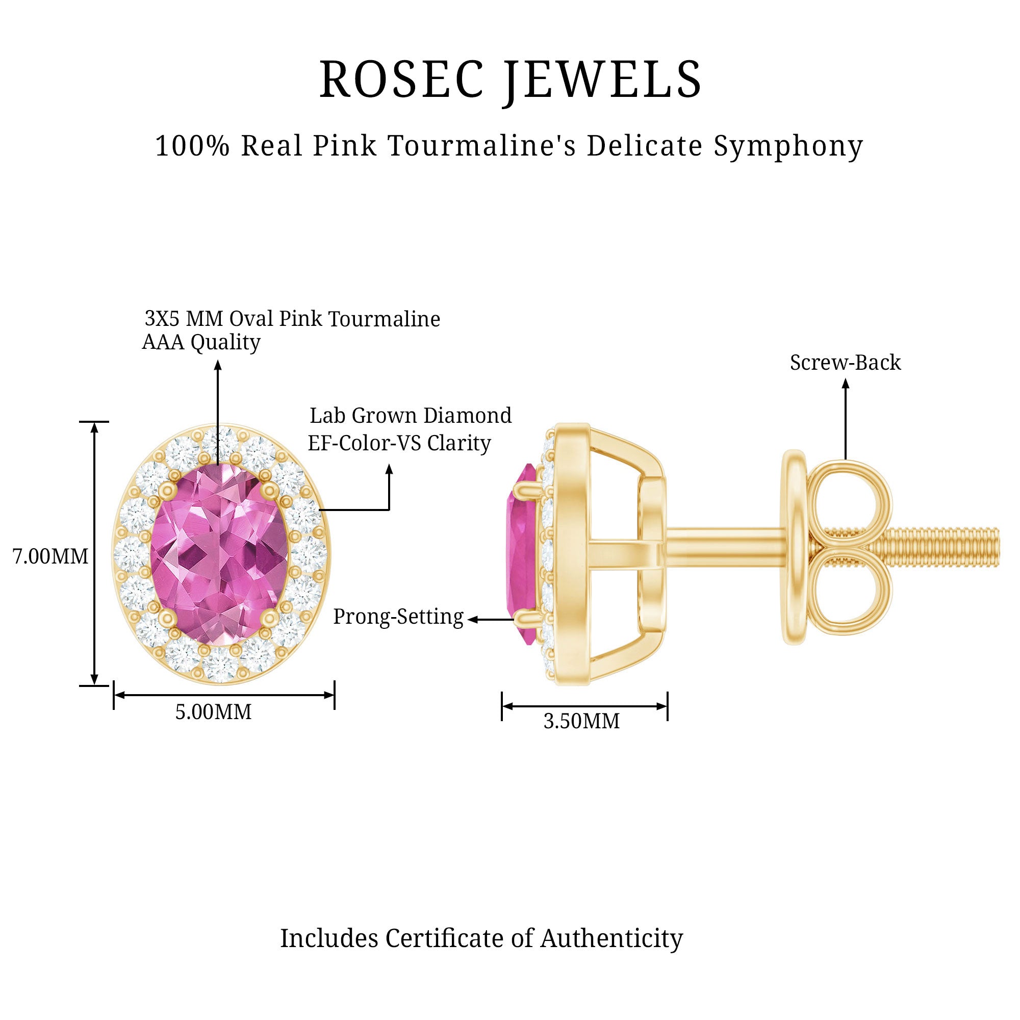 Grace your ears with a whisper of romance and radiant color with these elegant Pink Tourmaline Earrings. Designed to strike the perfect balance between modern glamour and timeless style, each earring showcases a 3X5 MM oval shaped pink tourmaline in a secure prong setting. Encircling the vibrant gemstone is a sparkling halo of round brilliant cut lab grown diamonds, expertly placed to enhance the stone’s brilliance while adding a luxurious shimmer. The contrast between the delicate blush of pink tourmaline and the sparkling white diamonds creates a refined and eye-catching design that feels both fresh and classic. Crafted in 14k yellow gold plated silver and finished with secure screw back closures, these Oval Stud Earrings are made to offer both comfort and confidence, whether worn daily or on special occasions. From romantic evenings and weddings to everyday elegance, these Pink Tourmaline and Diamond Earrings add a gentle yet captivating sparkle to any outfit. The AAA quality pink stone, paired with EF-VS quality lab grown diamonds, ensures a classic finish that is ideal for gifting, whether you are celebrating a milestone, an anniversary, or simply sharing a heartfelt moment. Delicate yet dazzling, these Halo Stud Earrings are more than accessories, they are expressions of style, sentiment, and timeless beauty.