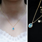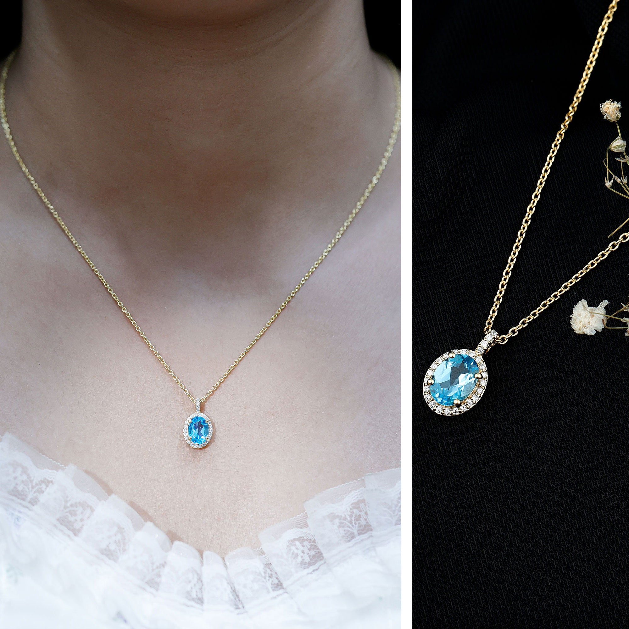 Make every moment feel special with this elegant Swiss Blue Topaz Necklace, designed to add charm and sophistication to your everyday style. Handcrafted in 14k yellow gold plated silver, this necklace features a 6X8 MM oval shaped Swiss Blue Topaz, securely set in prong setting. Surrounding the center stone is a delicate halo of round lab grown diamonds, giving the Oval Pendant just the right touch of brilliance without overpowering its design. The halo catches light from all angles, adding a gentle sparkle that is perfect for both casual and formal looks. What makes this Halo Pendant Necklace even more special is the decorative bail, which is also adorned with shimmering lab created diamonds, a thoughtful detail that adds extra shine and ties the whole piece together seamlessly. The Blue Stone Necklace hangs from a sleek, polished chain that sits comfortably on the neckline and fastens securely, making it easy to wear all day. Its soft curves make it a perfect accessory for everything from office meetings to evening dinners. This Swiss Blue Topaz and Diamond Necklace is an ideal gift for birthdays, anniversaries, or simply a way to treat yourself. It is stylish, sophisticated, and made to be cherished for years to come.