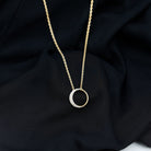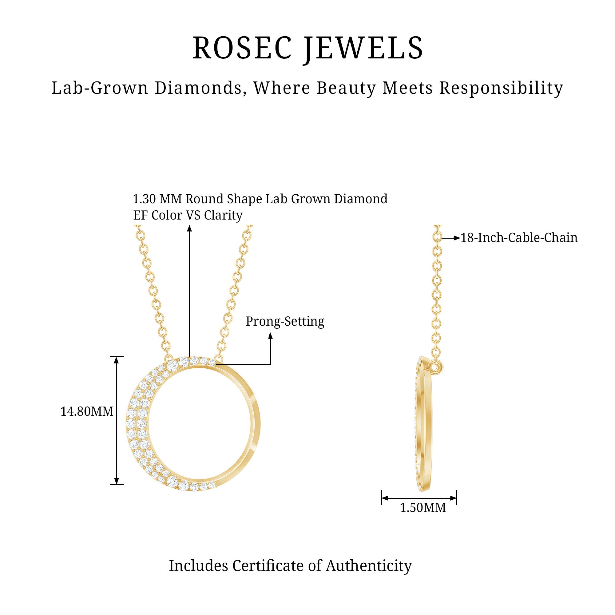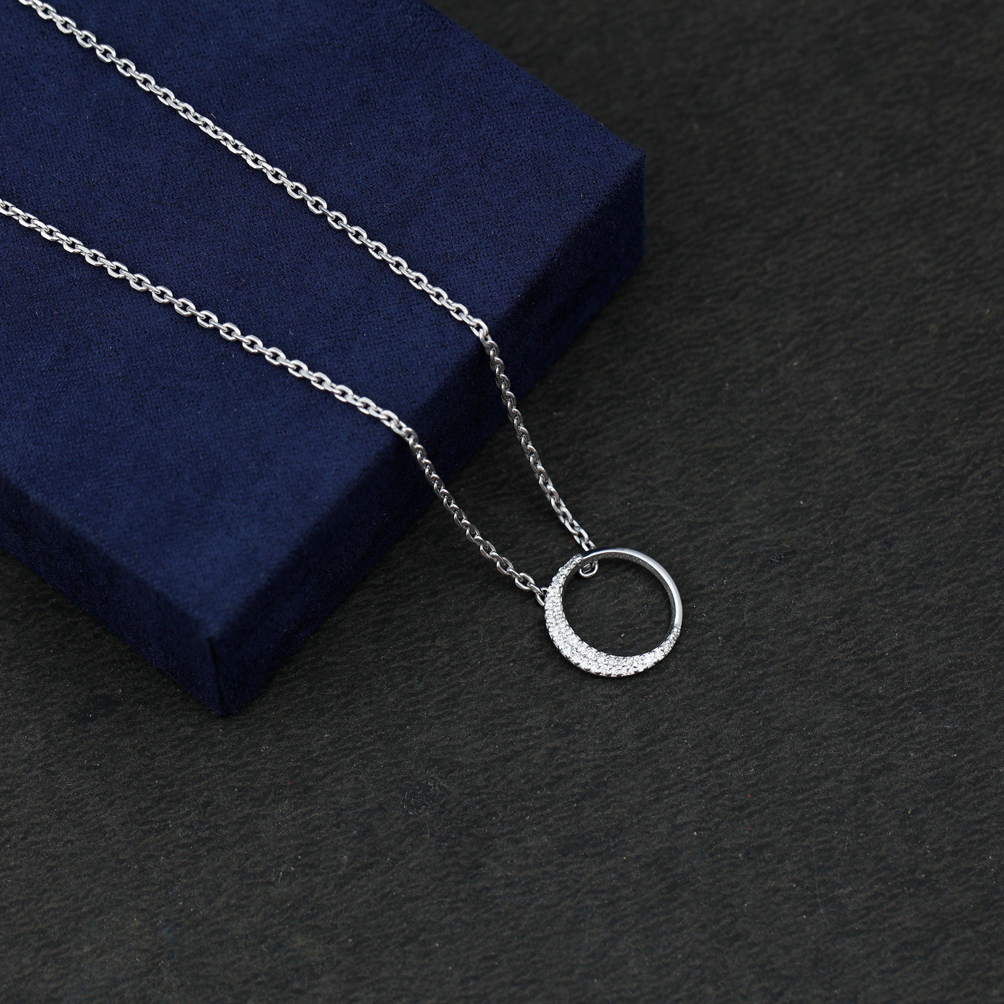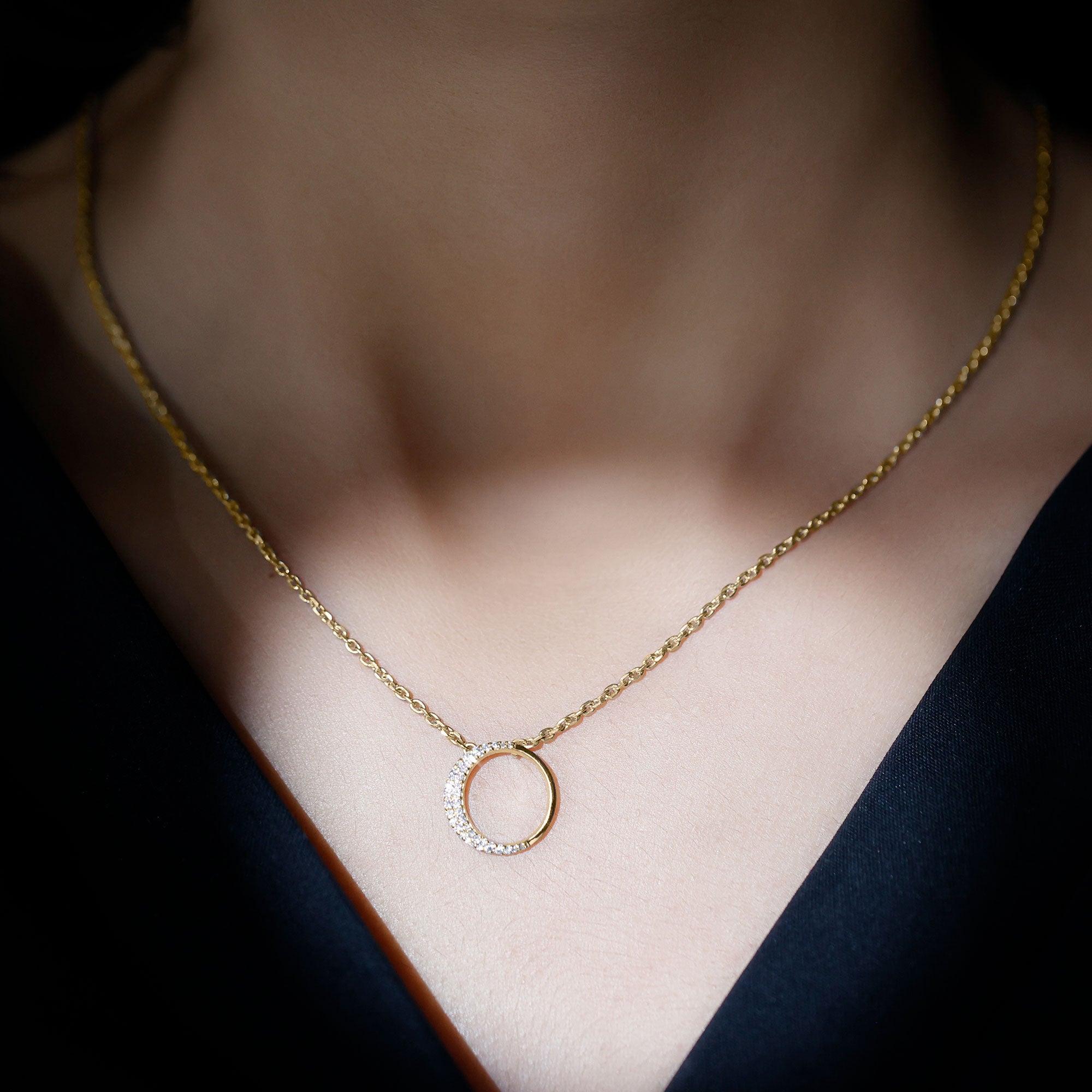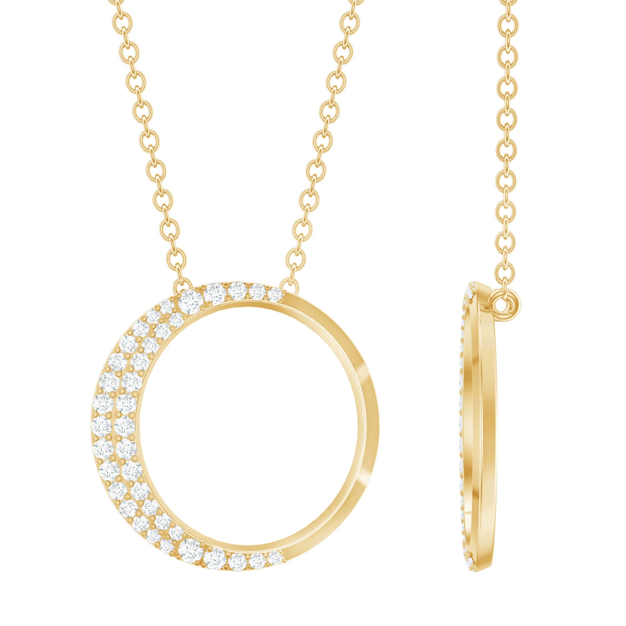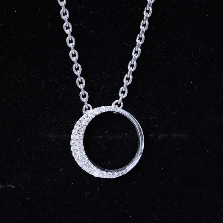 Looking for the perfect way to dazzle on special occasions - weve got the perfect Open Circle Necklace youre looking for. This stunning Eternity Necklace features an open circle design, gracefully decorated with round cut pave set diamonds on the half side in a crescent moon-like pattern, exuding timeless elegance and fiery brilliance. Designed with a delicate cable chain, this Lab Grown Diamond Necklace allows for an adjustable fit, ensuring comfort and ease on your neckline. It is not just a necklace, it is a statement representing love that is rare, beautiful, and timeless. The moment she sees it, shell know this is the Round Necklace made just for her.