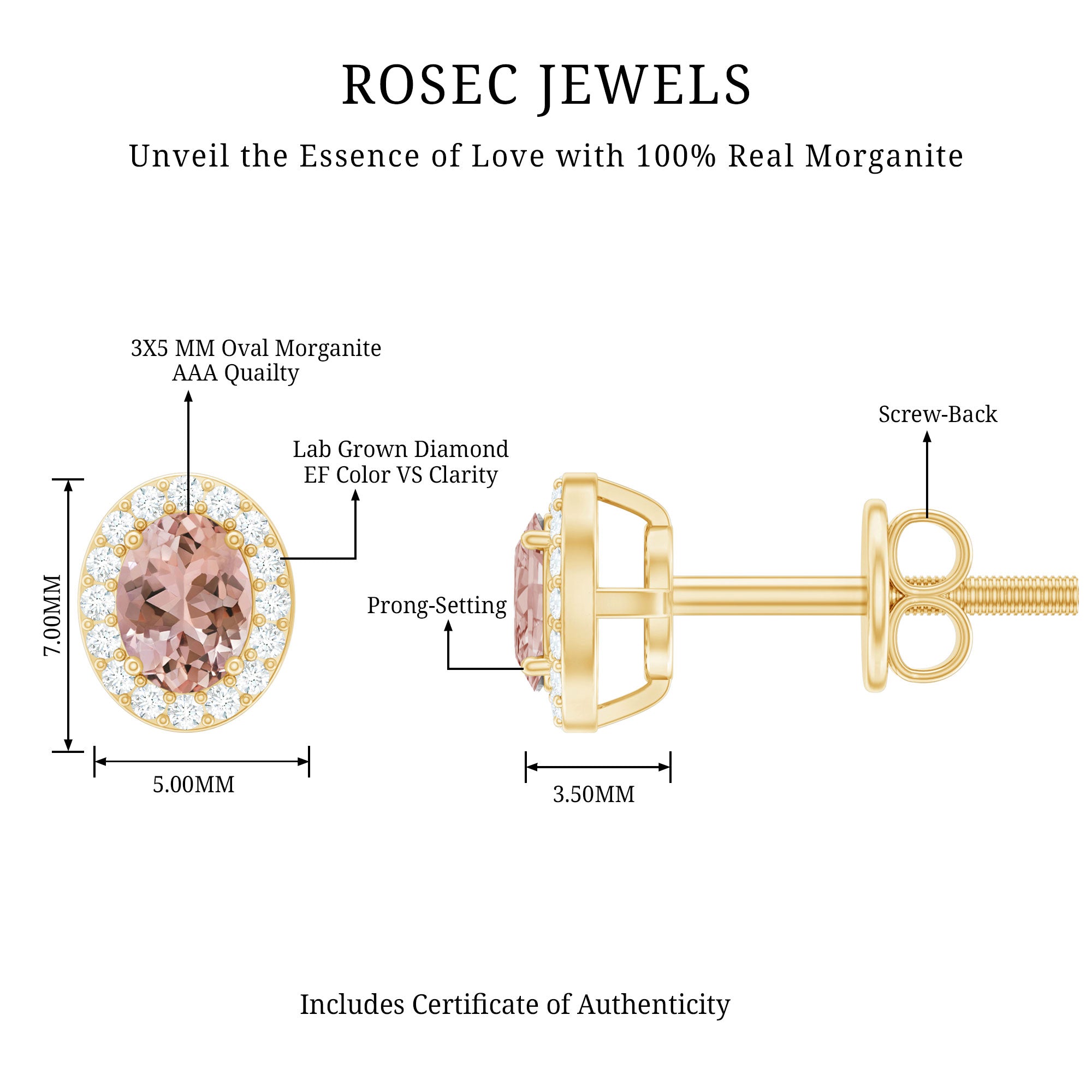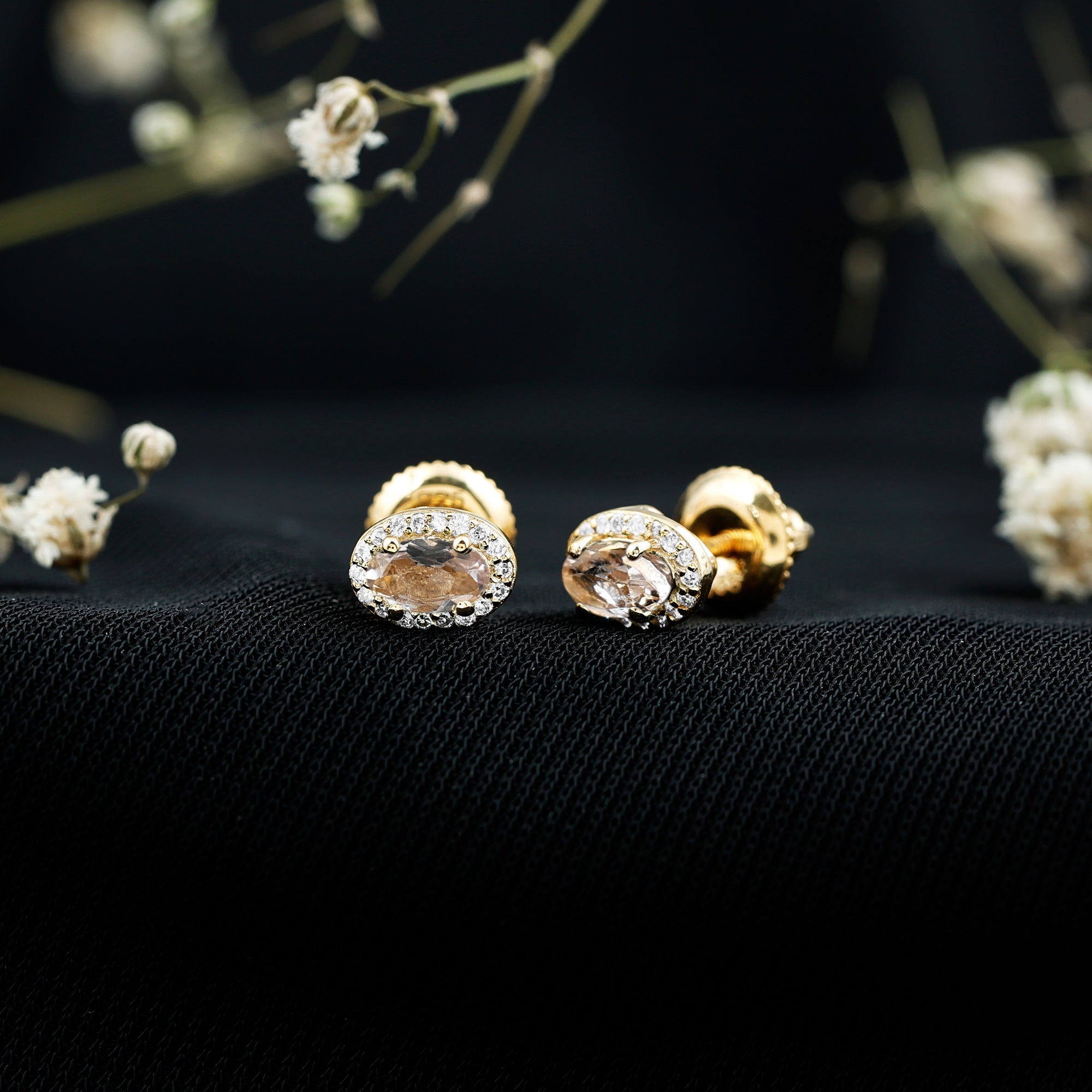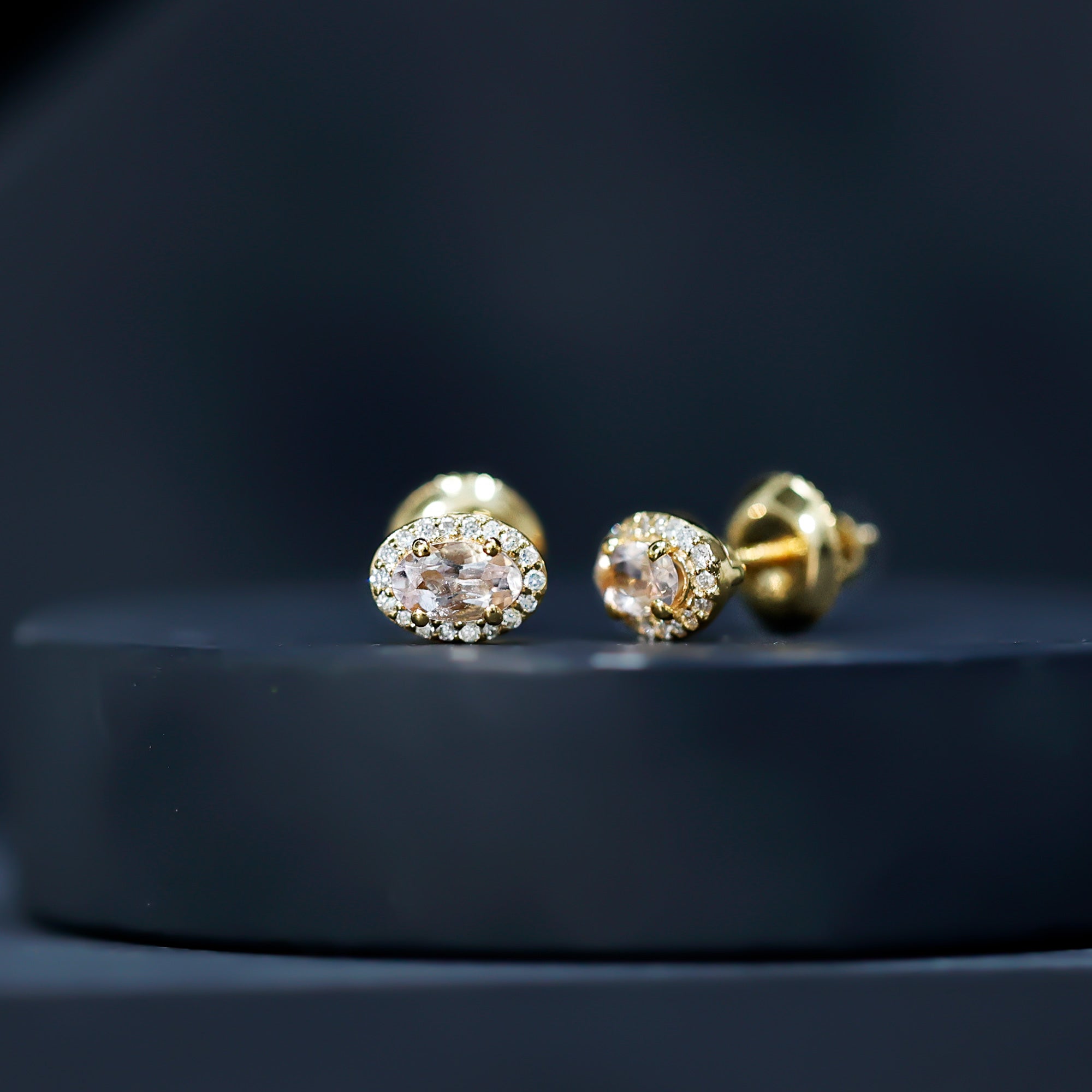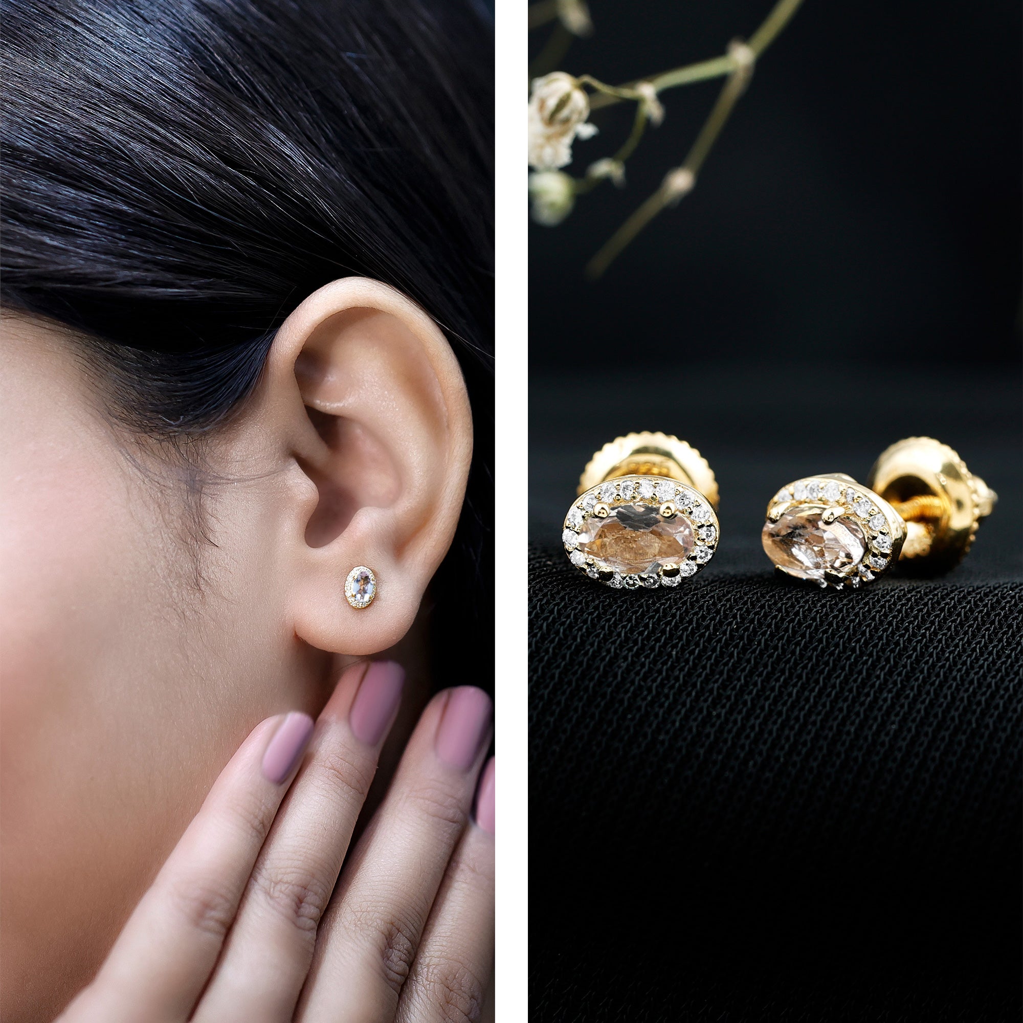 With a smooth finish and delicate sparkle, these Morganite Stud Earrings are a beautiful choice for any style, crafted in 14k yellow gold plated silver. These Halo Earrings feature a lovely 3X5 MM oval shaped Morganite, set in secure prong setting. Surrounding the Morganite is a delicate round lab grown diamond halo, adding just the right amount of sparkle. The AAA quality Morganite and EF-VS quality diamonds create a beautiful and balanced design that feels both modern and timeless. Designed with comfort in mind, these Oval Stud Earrings feature secure screw back closures, so you can wear them with confidence all day long. Whether you are dressing up for a date night, a wedding, or simply adding a bit of sparkle to your everyday look, these Silver Morganite Earrings are a perfect choice. They also make a thoughtful gift for birthdays, anniversaries, or special occasions, especially for those who love delicate, romantic jewelry. The gentle pink hue of Morganite symbolizes love, peace, and compassion, making these October Birthstone Earrings not just a stylish accessory, but also a meaningful keepsake. Elegant, lightweight, and full of charm, these Morganite and Diamond Earrings are made to be loved for years to come.